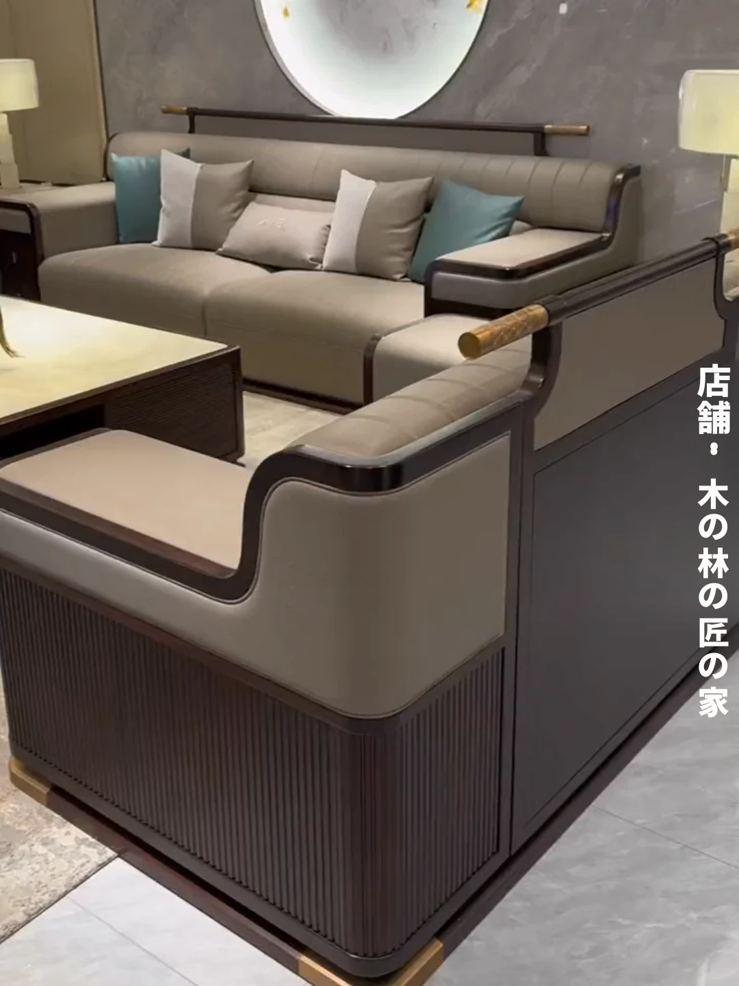 新中式ウッドブラックソファセット|本革背もたれ付き|シンプルでラグジュアリーなデザイン|新作全家具セットでおしゃれなリビングを演出!