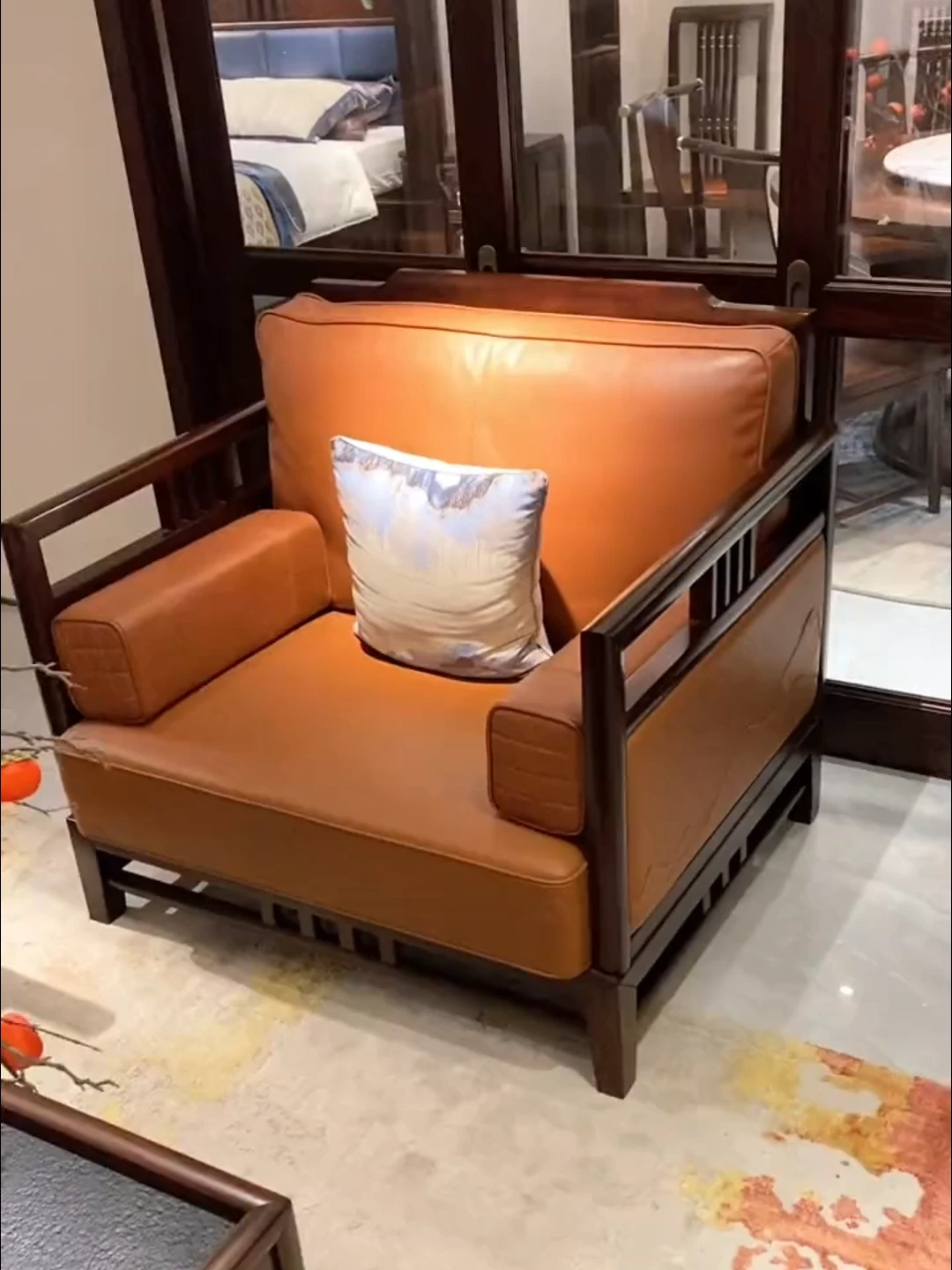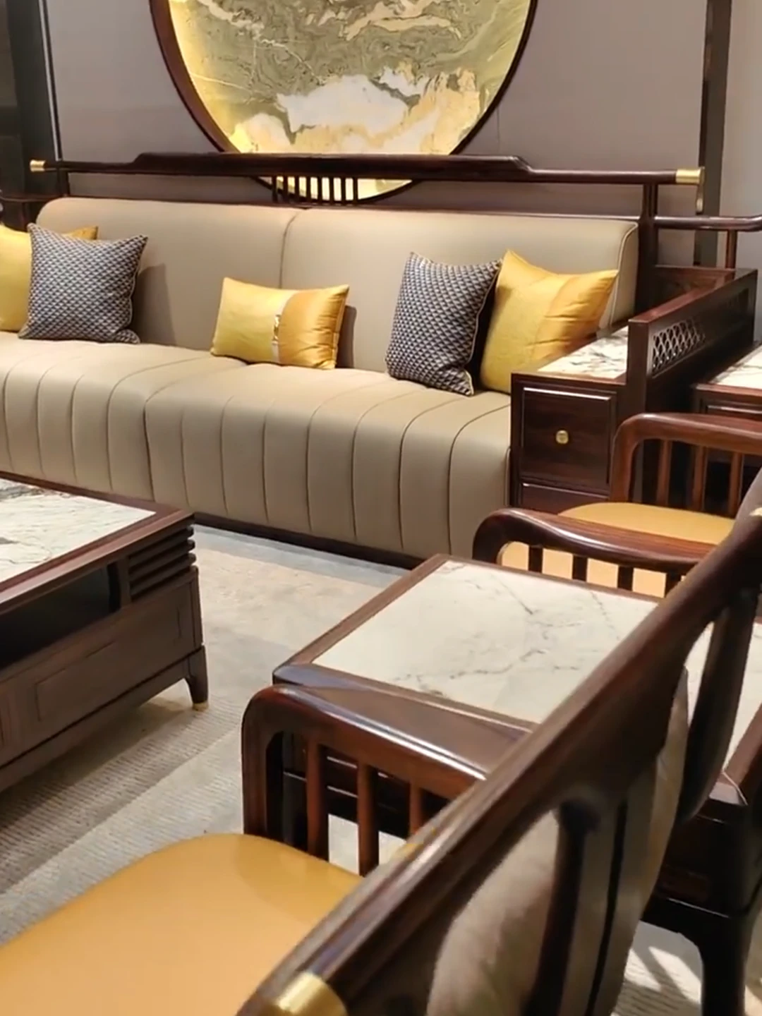 新中式スタイルの本格的な無垢材ソファセット - モダンでラグジュアリーなウッド&レザーの組み合わせ、大小様々な住宅や別荘のリビングにもぴったりの高級家具!