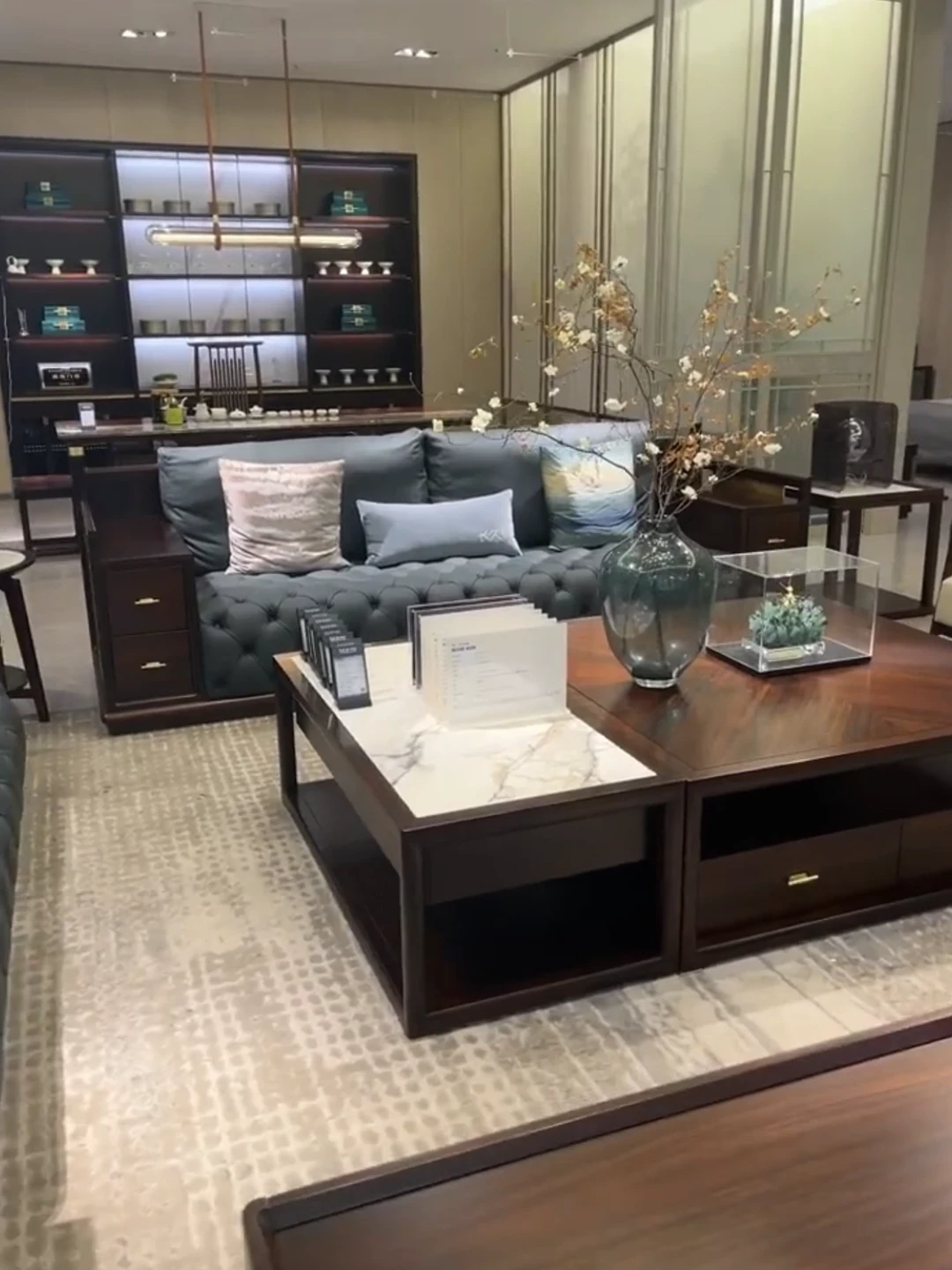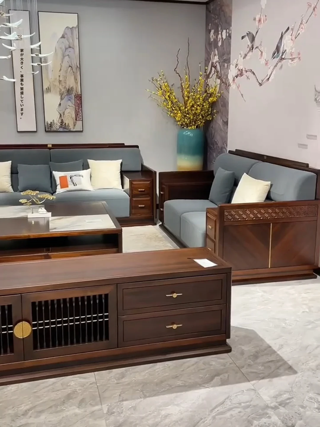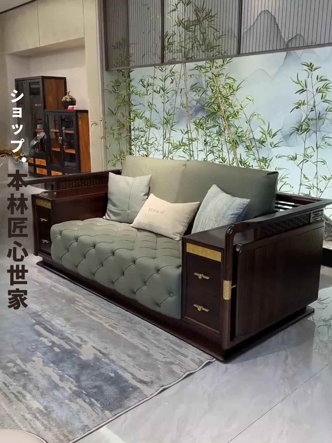新中式デザイン 北米産ブラックウォールナット無垢材ソファセット 高級大戸建て向け モダンヴィラリビングに最適 本革ソファで贅沢なひとときをお楽しみください!