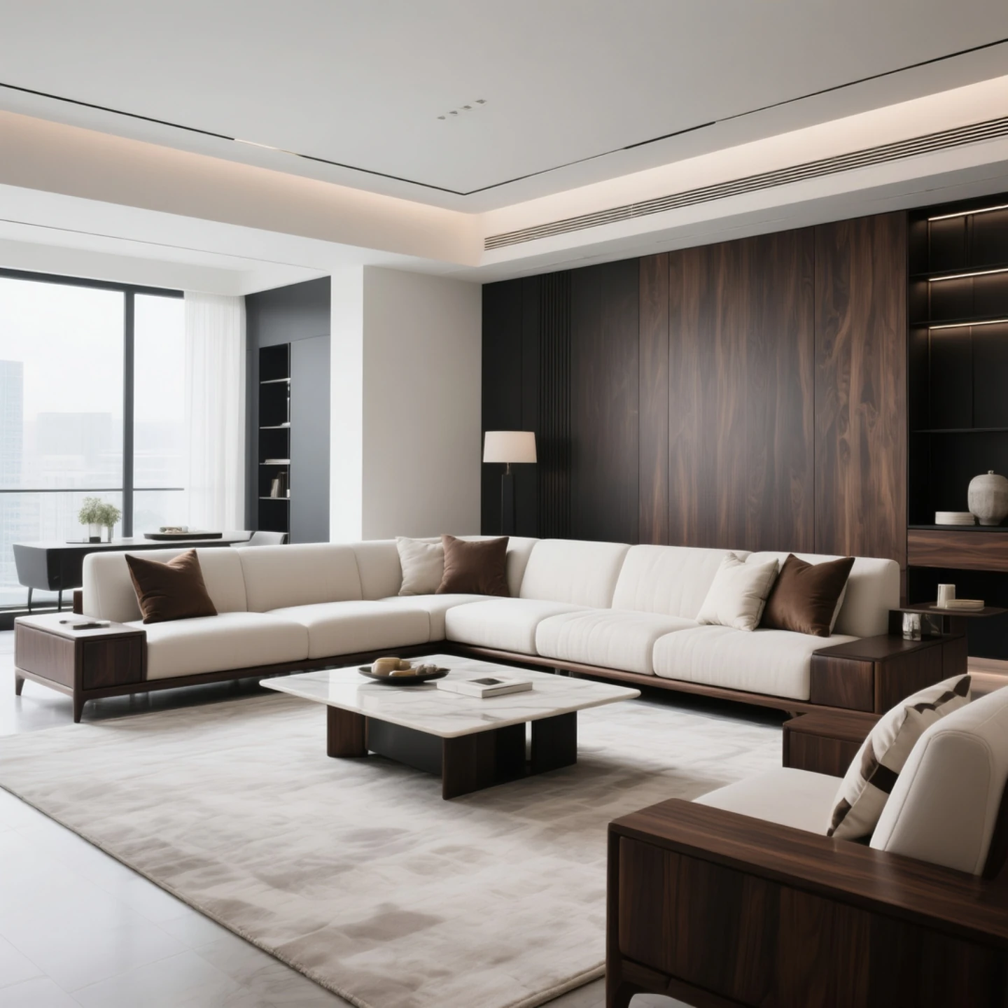 新しい北米産ブラックウォルナットソファセット - 本格的なイタリアンスタイル、上質な本革使用、宋代美学を取り入れた高級感あふれるモデルハウス向け家具。あなたの空間を格上げする一品!