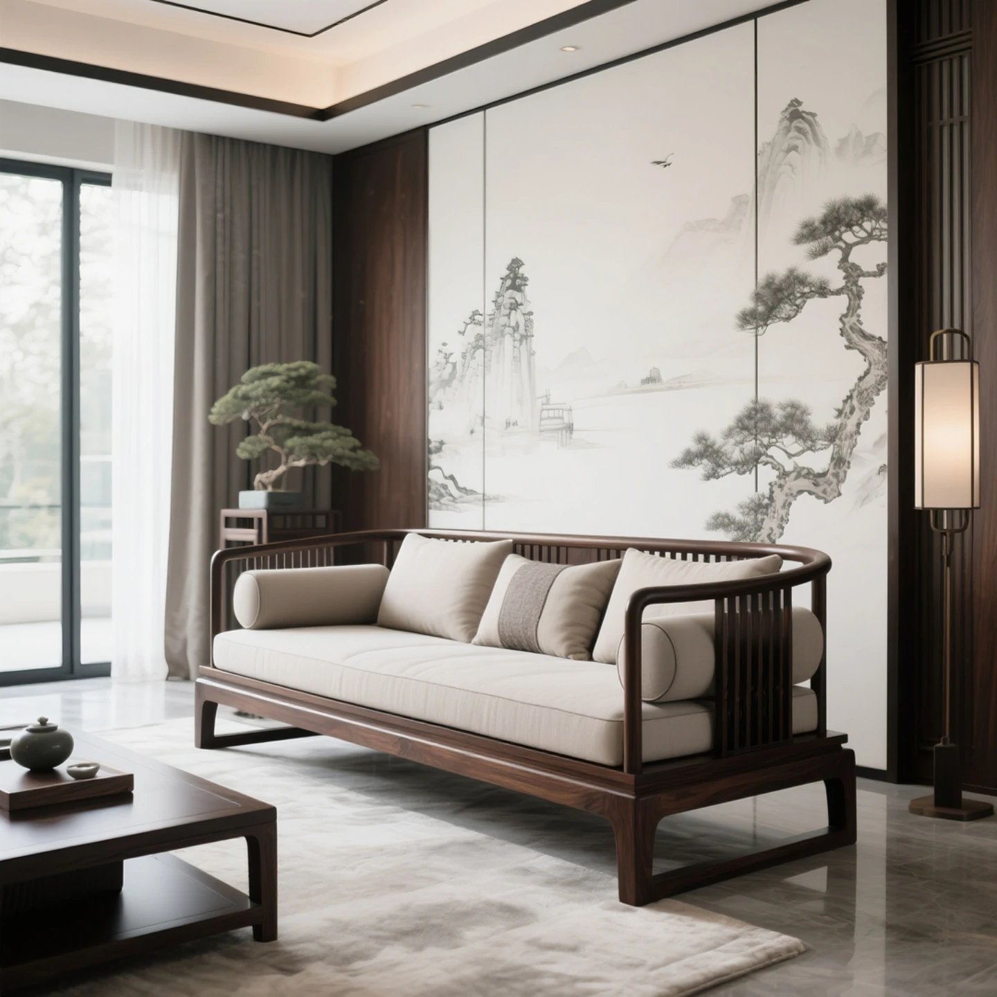 新中式デザインの北米産ブラックウォールナット無垢材ソファセット - 高級感あふれる広々としたヴィラリビングに最適な布張りストレートソファ!上質な素材と洗練されたデザインで、特別な空間を演出します。