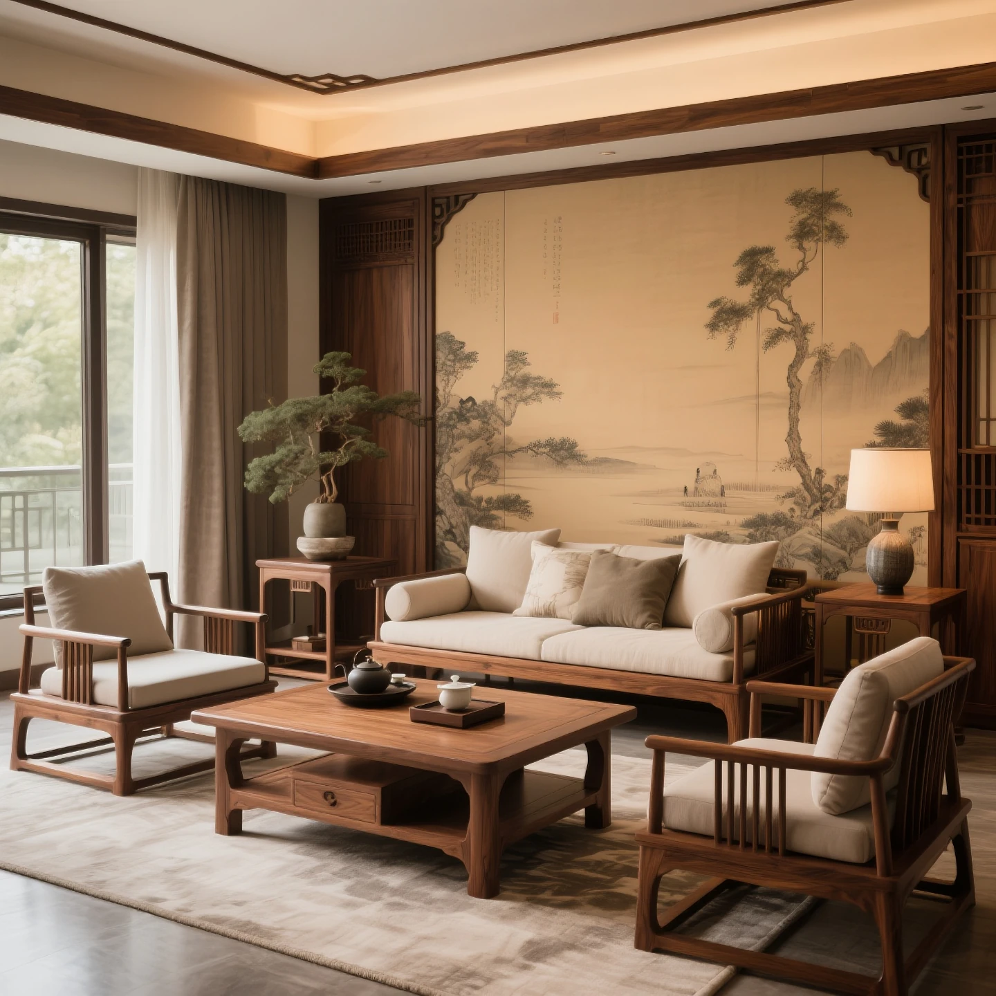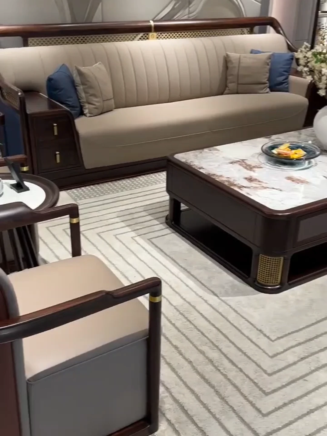 新中式ウッドウッドソファセット モダンシンプルなリビングルーム向けのラグジュアリー中国風 大型住宅向けフル家具セットで、洗練されたデザインと快適さを両立!