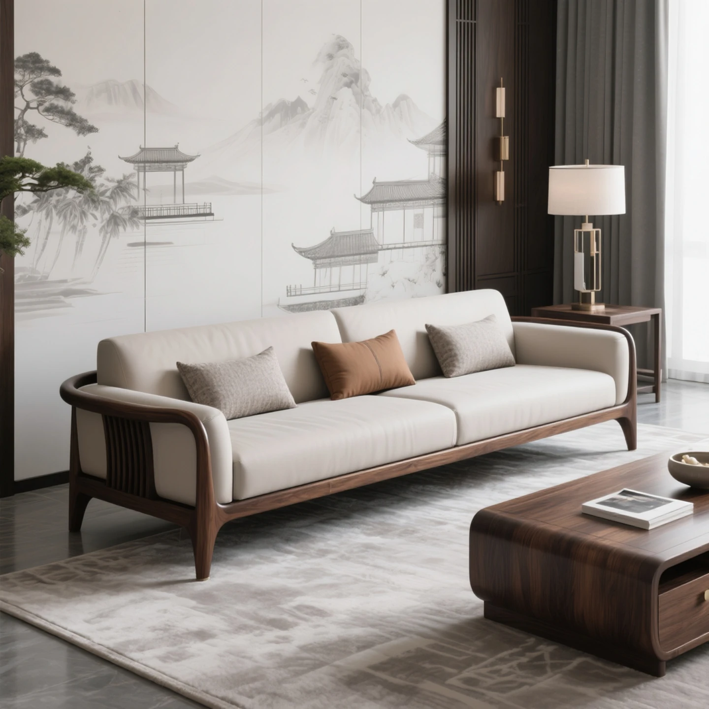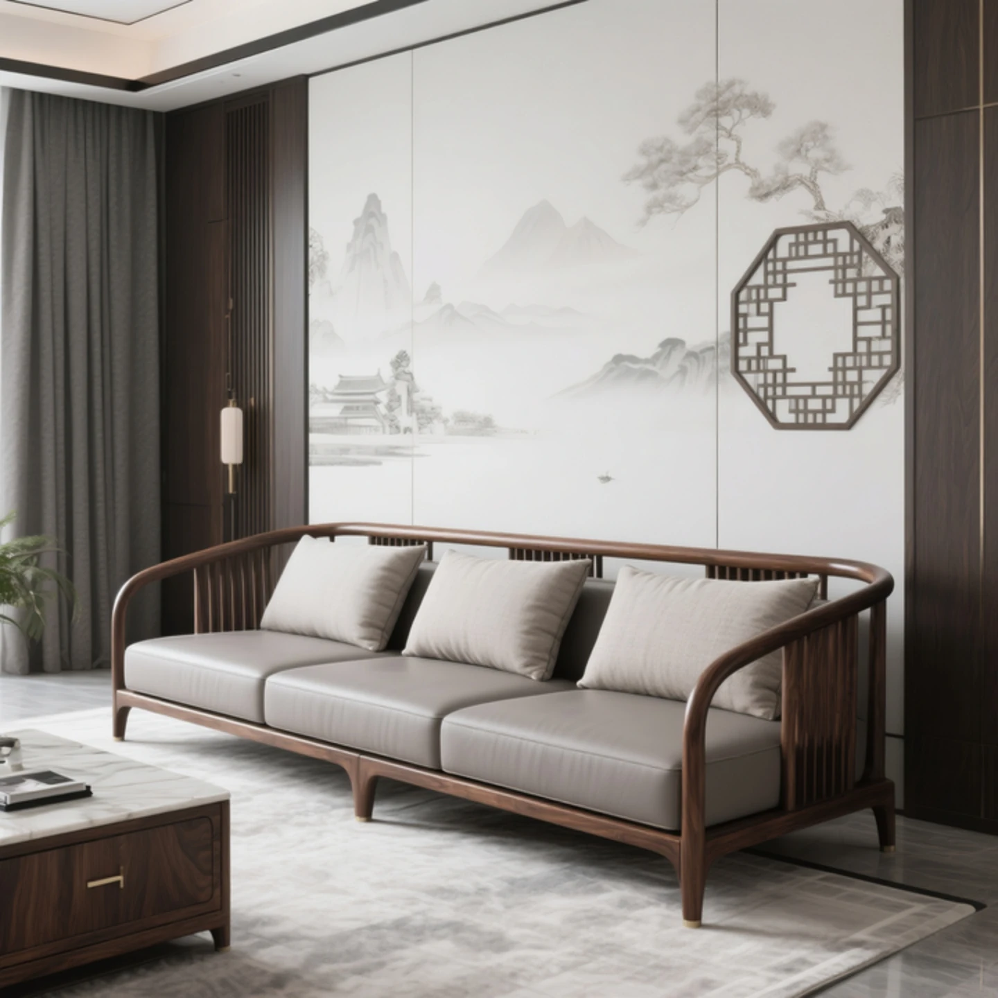 新中式スタイルの高級無垢材ソファ|北米産ブラックウォールナット使用|現代的な直列デザイン|シンプルで洗練された布製|3人掛けリビングソファで、居心地の良い空間を実現!