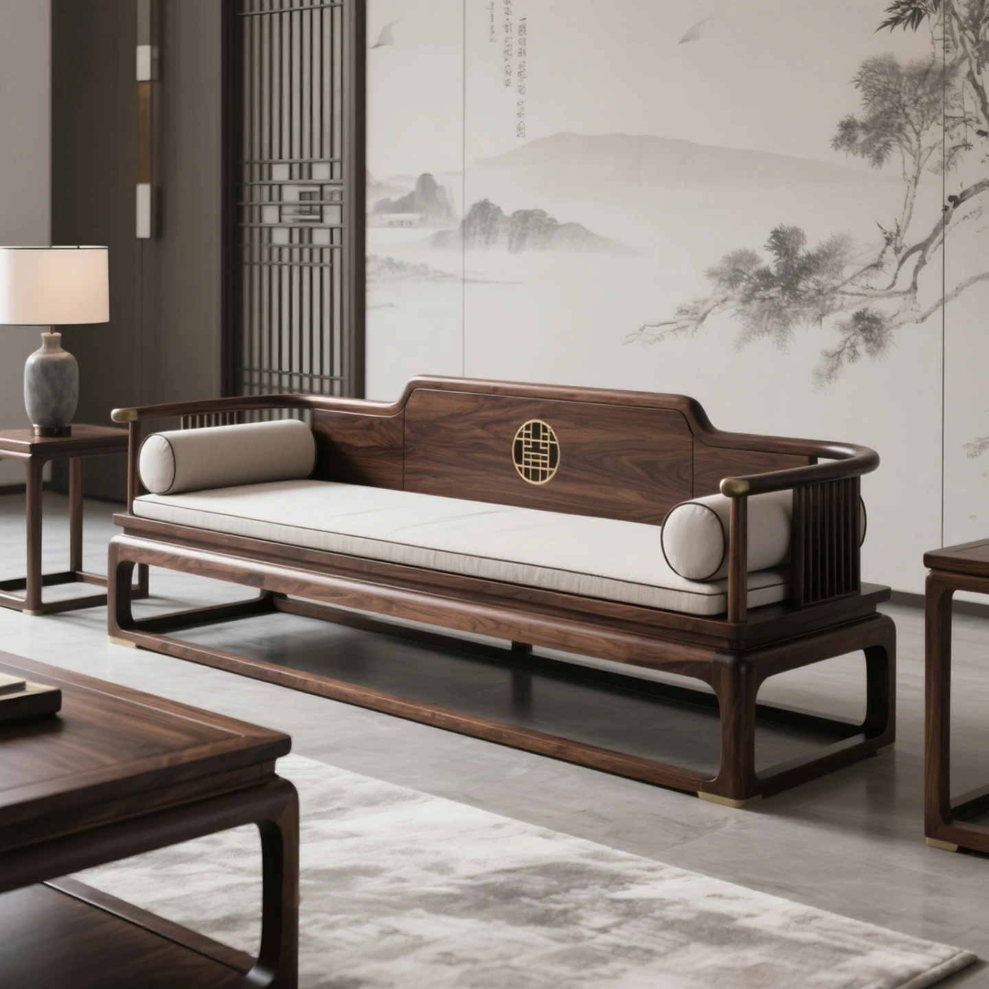 新中式デザインのローハンソファ、北米産ブラックウォールナット無垢材使用!禅の雰囲気漂う彫刻入りで、リビングや茶室にぴったり。大小さまざまな間取りに対応可能。心落ち着く空間を演出します。
