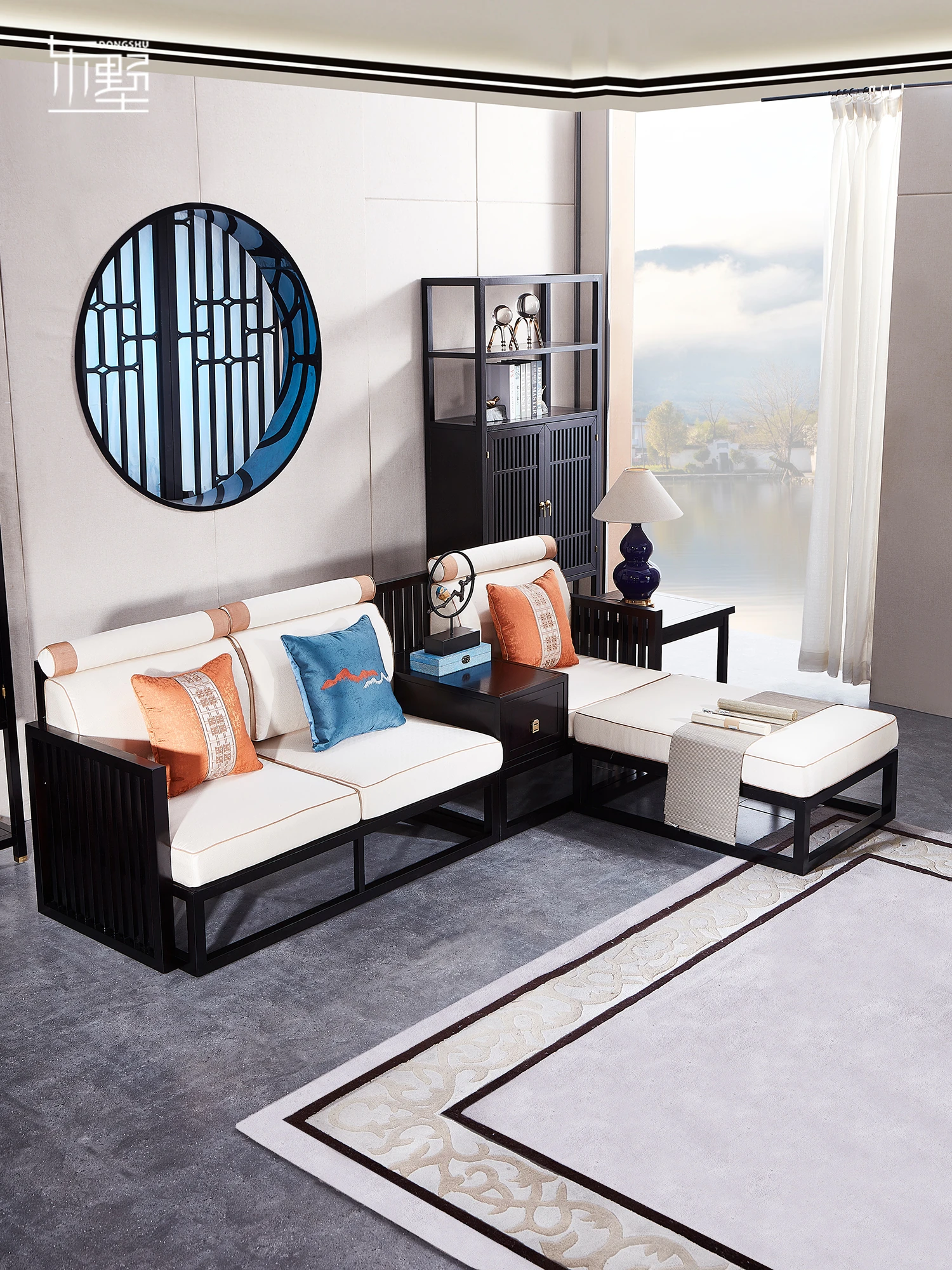 新中式デザインの北米ブラックウォールナット製コーナーソファ!モダンで軽やかな雰囲気の実木ソファ。別荘やモデルルームにもぴったりの上質な家具。リビングをスタイリッシュに演出します!