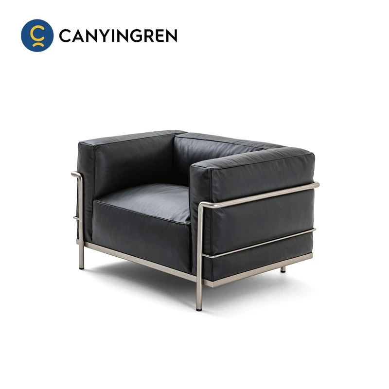 デザイナーによる本革製のイタリアンミニマリストソファ、リビングやオフィスに最適なコルビジェデザインのカッシーナLC3。洗練されたスタイルで、空間を引き立てる一品。