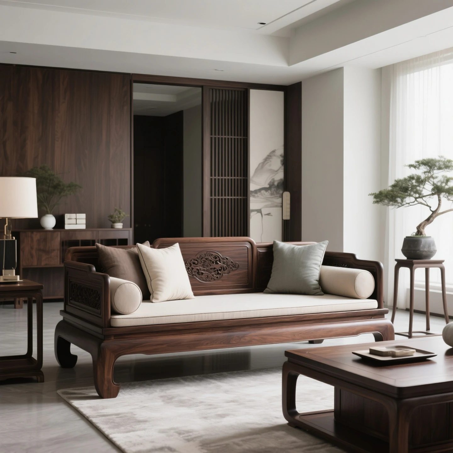 新中式彫刻ロハンソファー 北米産ブラックウォールナット無垢材 使用 Zenスタイルの茶室やリビングに最適なサイズ感 大型・小型物件に対応!高級感あふれるデザインで、心を癒す空間を演出。