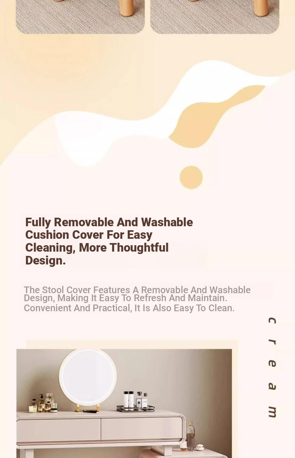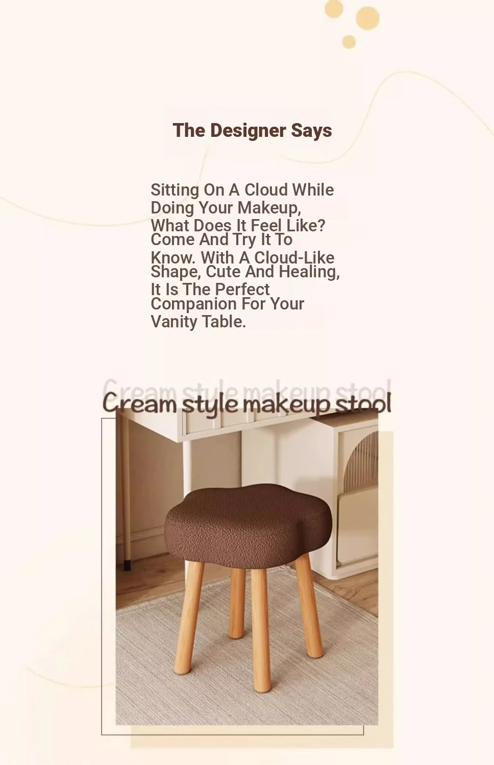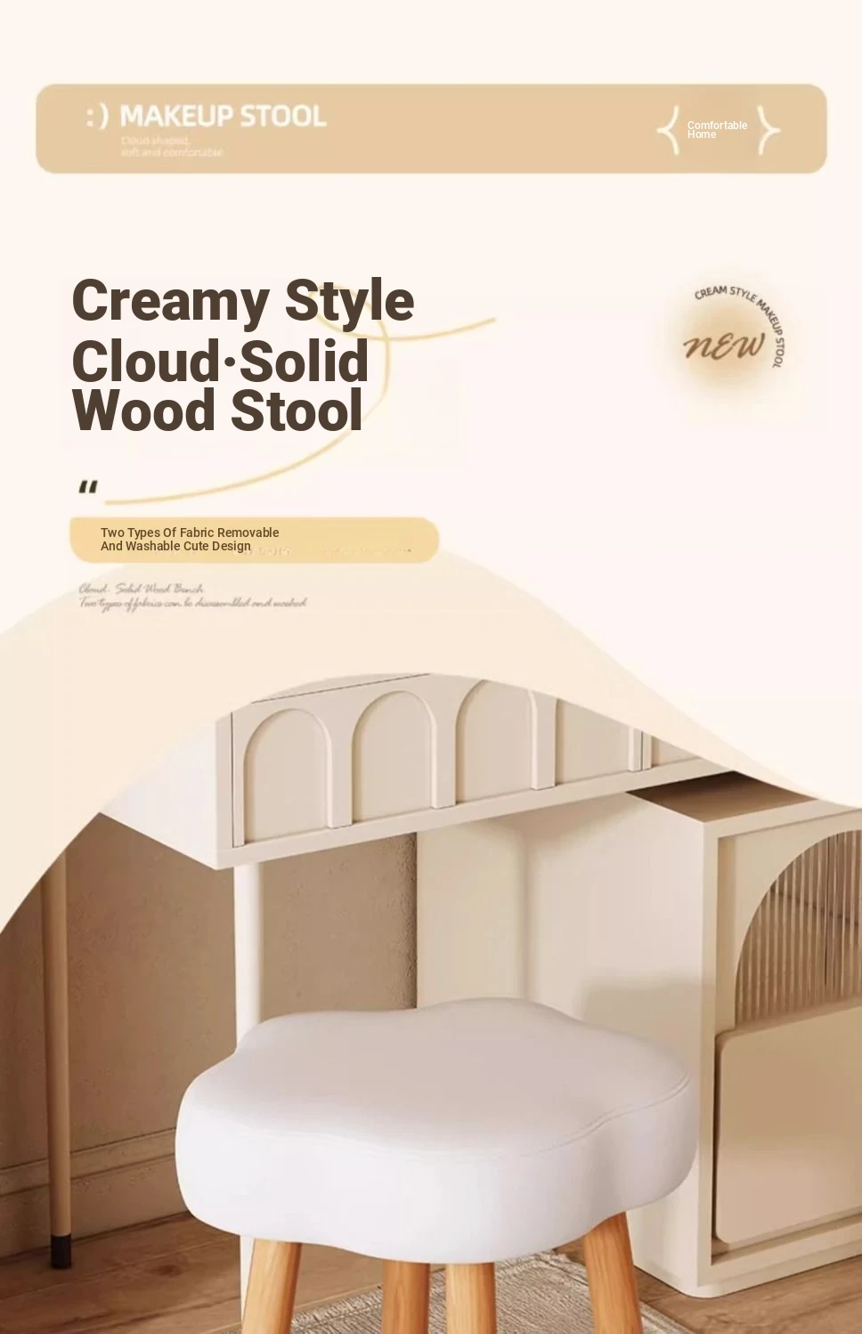 Creamy Makeup Vanity Stool – Elegant Cloud Chair for Girls’ Bedrooms, Simple Solid Wood Design, Perfect for Nail Art, Adds a Touch of Luxury to Your Space