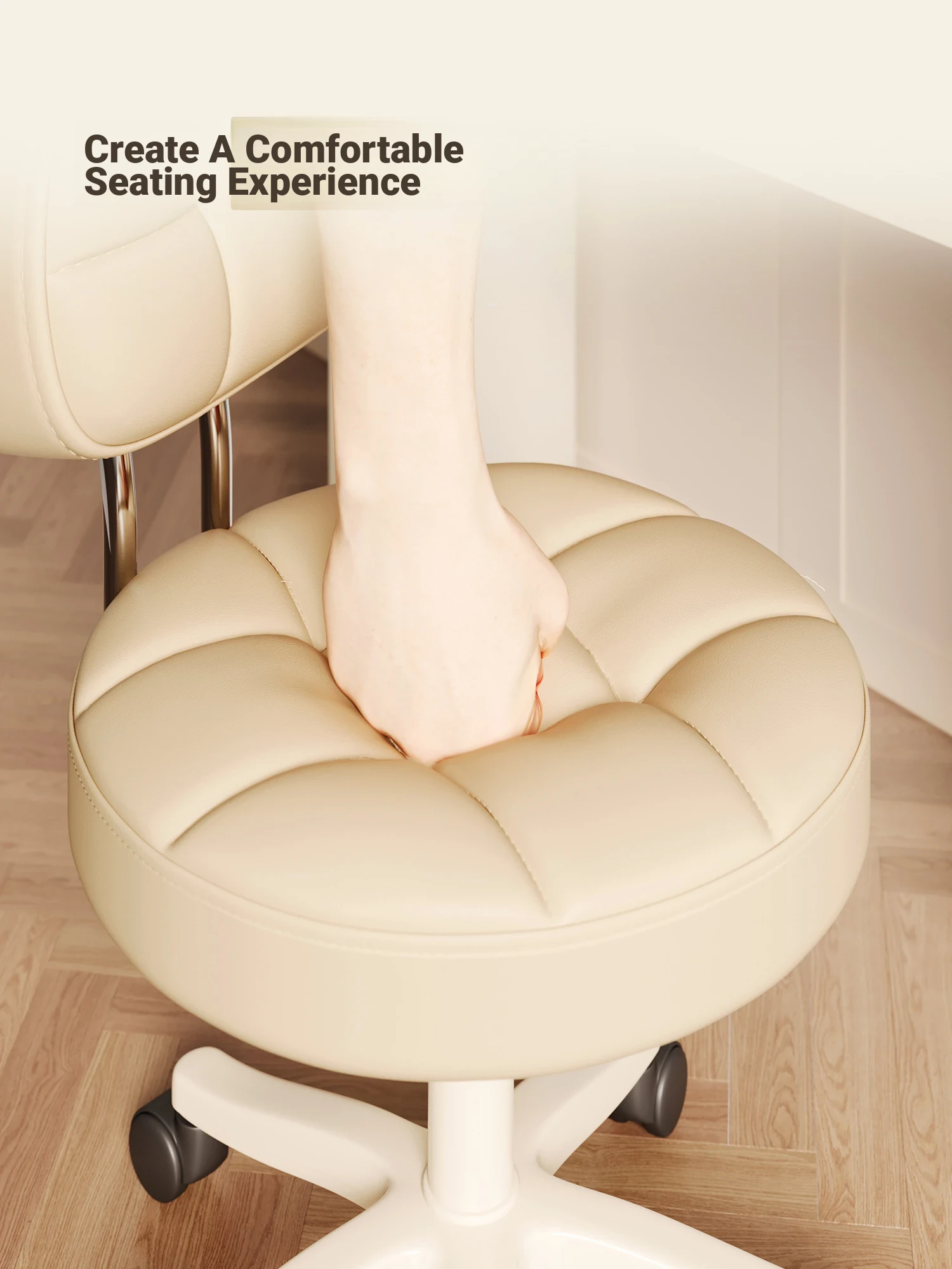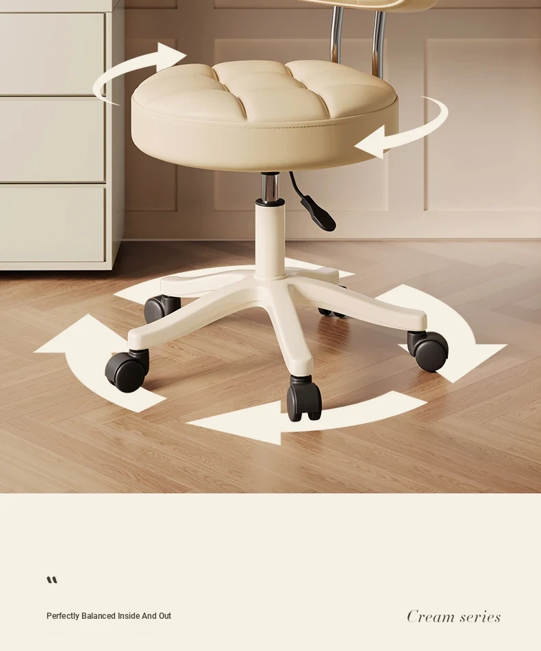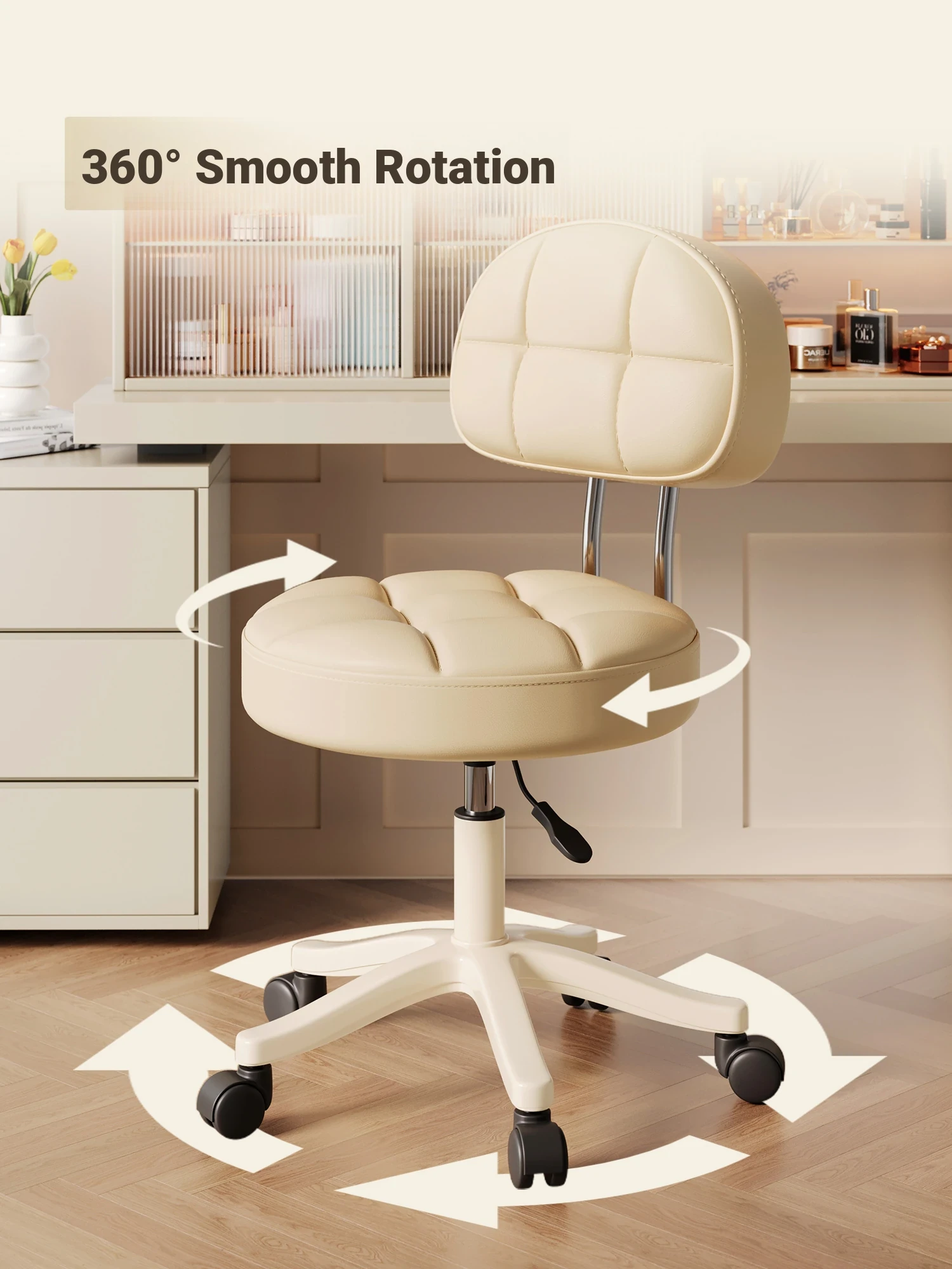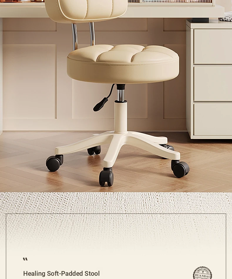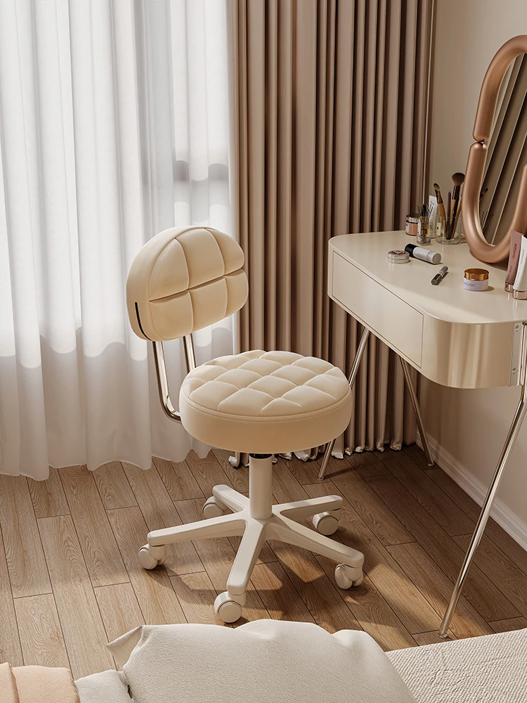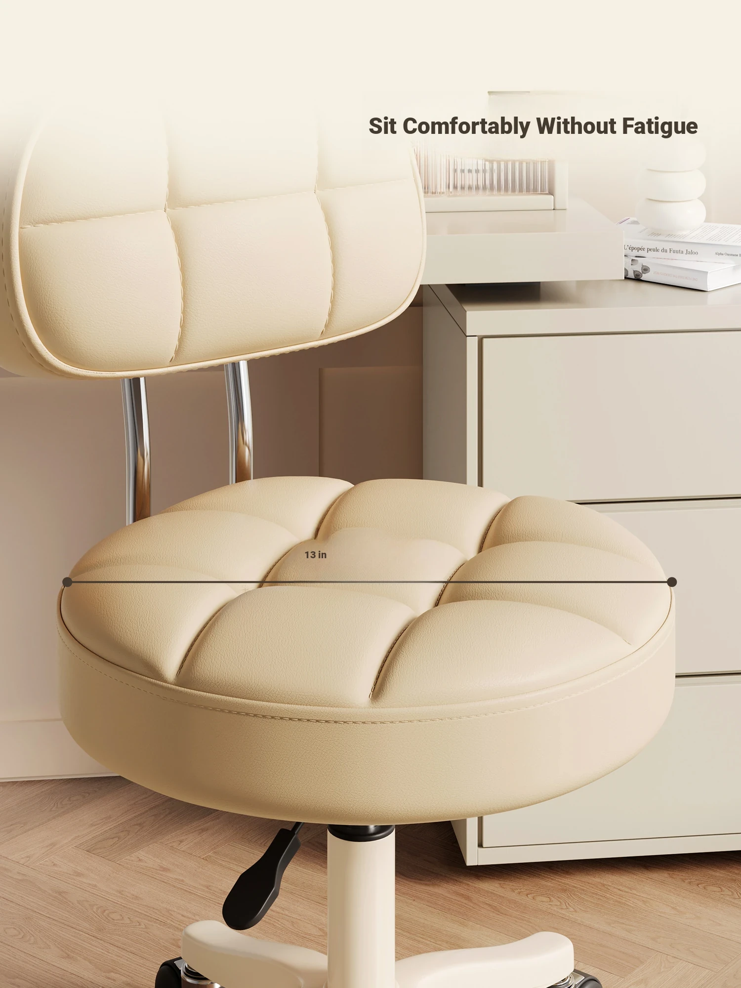 Elegant Cream Round Makeup Chair for Girls' Bedrooms - Stylish Vanity Stool with Backrest, Perfect for Home Use and Nail Art, Luxurious Design on Smooth Rolling Wheels.