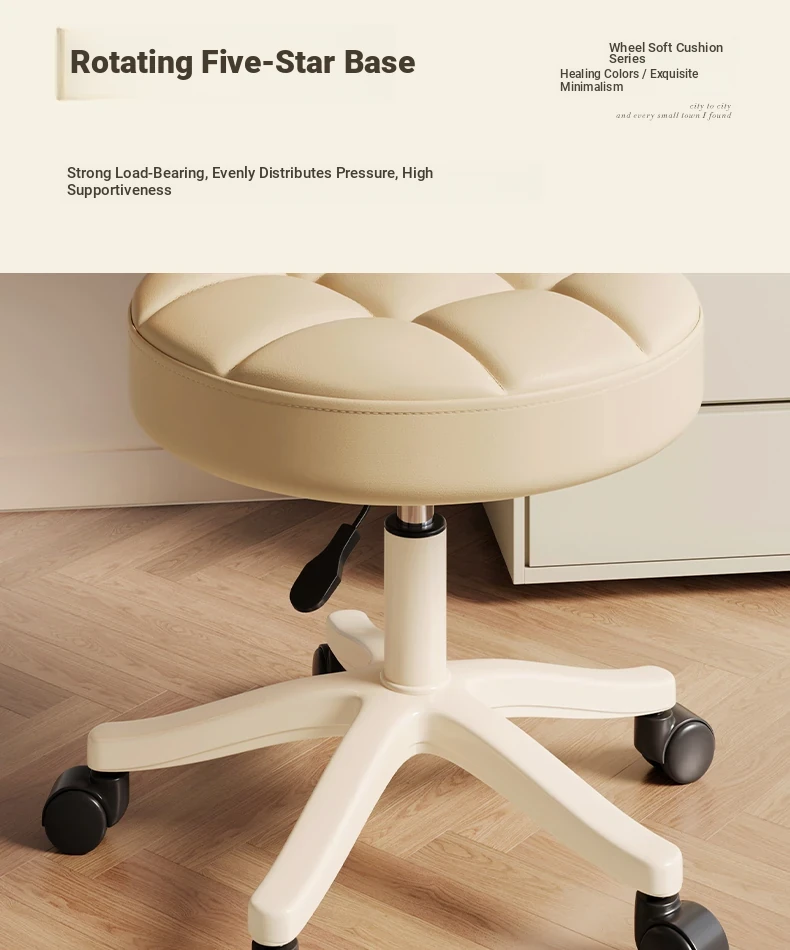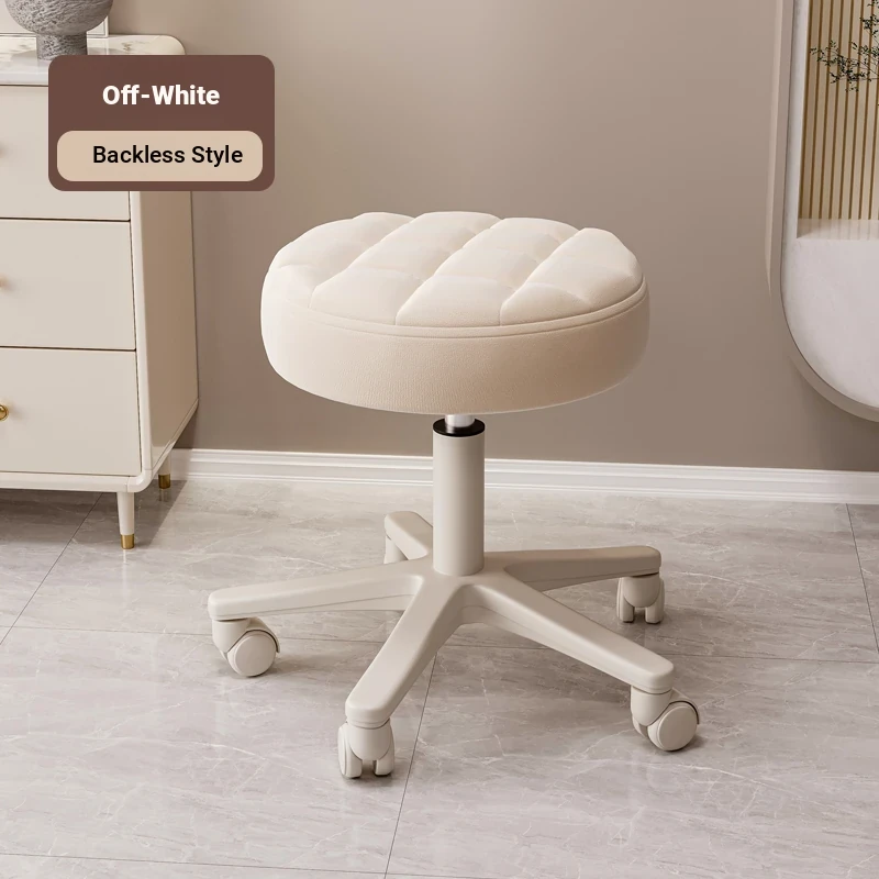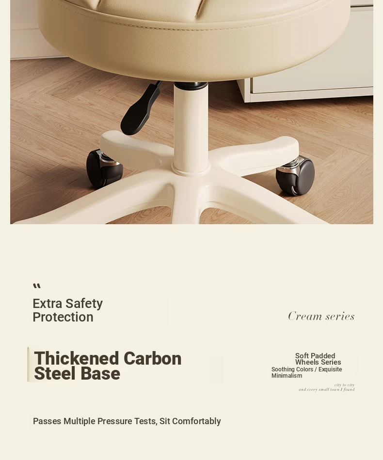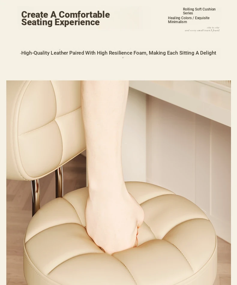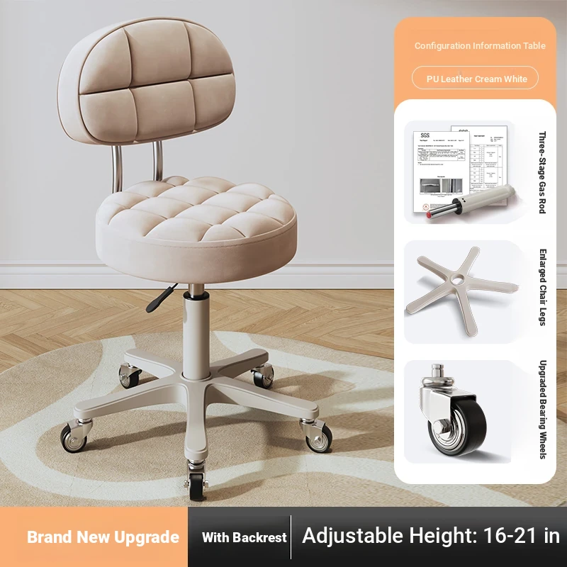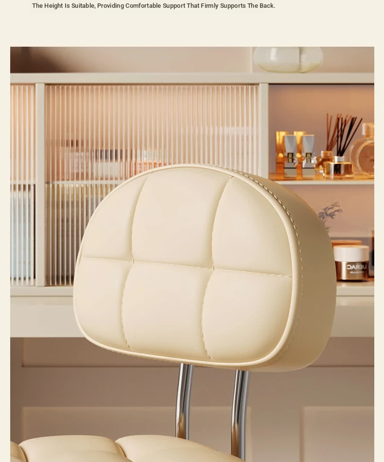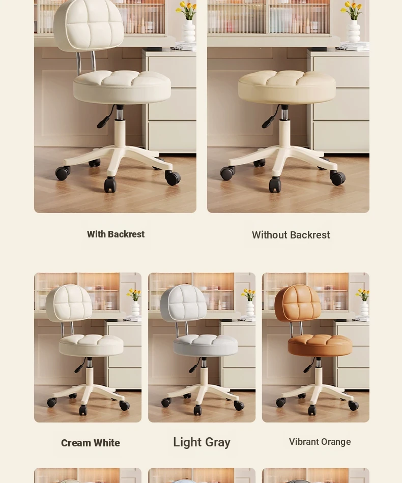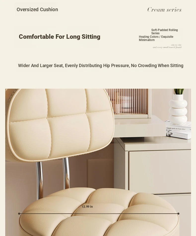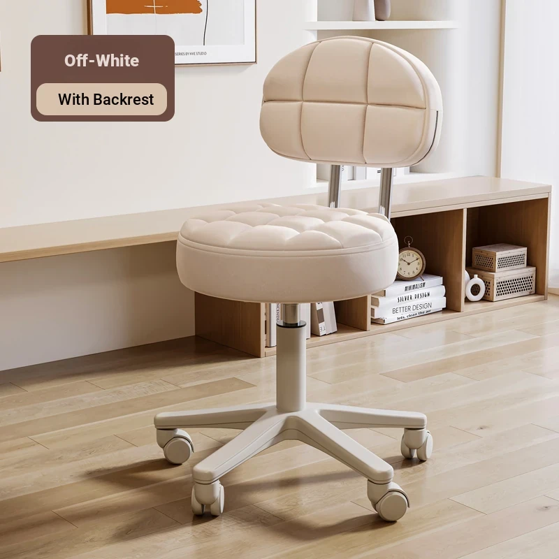 Elegant Cream Round Makeup Chair for Girls' Bedrooms - Stylish Vanity Stool with Backrest, Perfect for Home Use and Nail Art, Luxurious Design on Smooth Rolling Wheels.