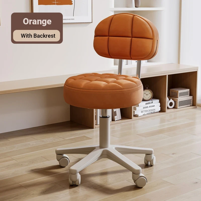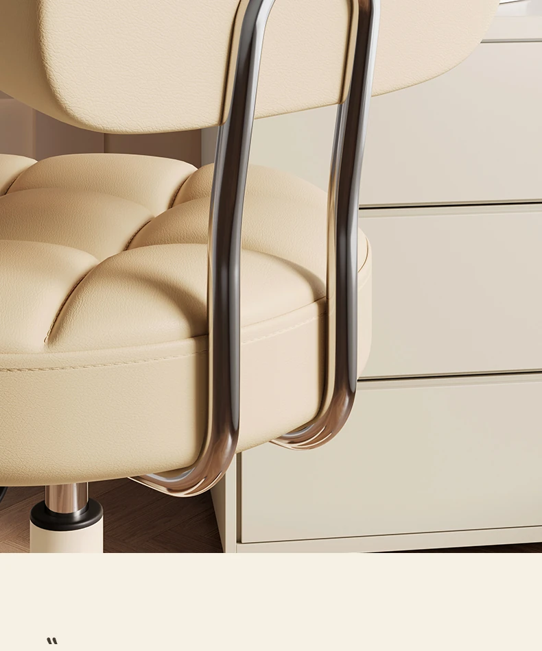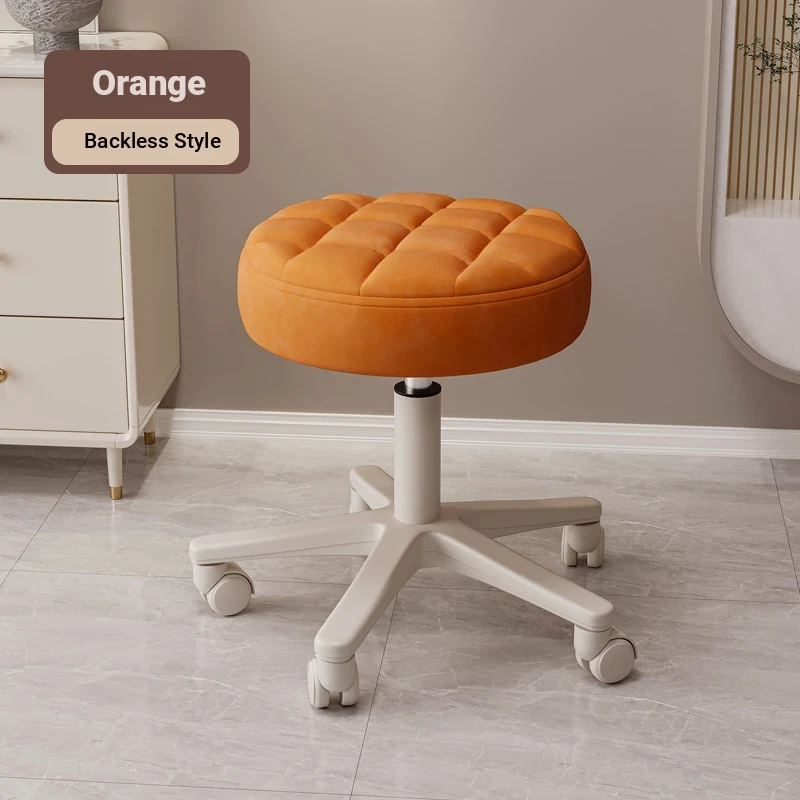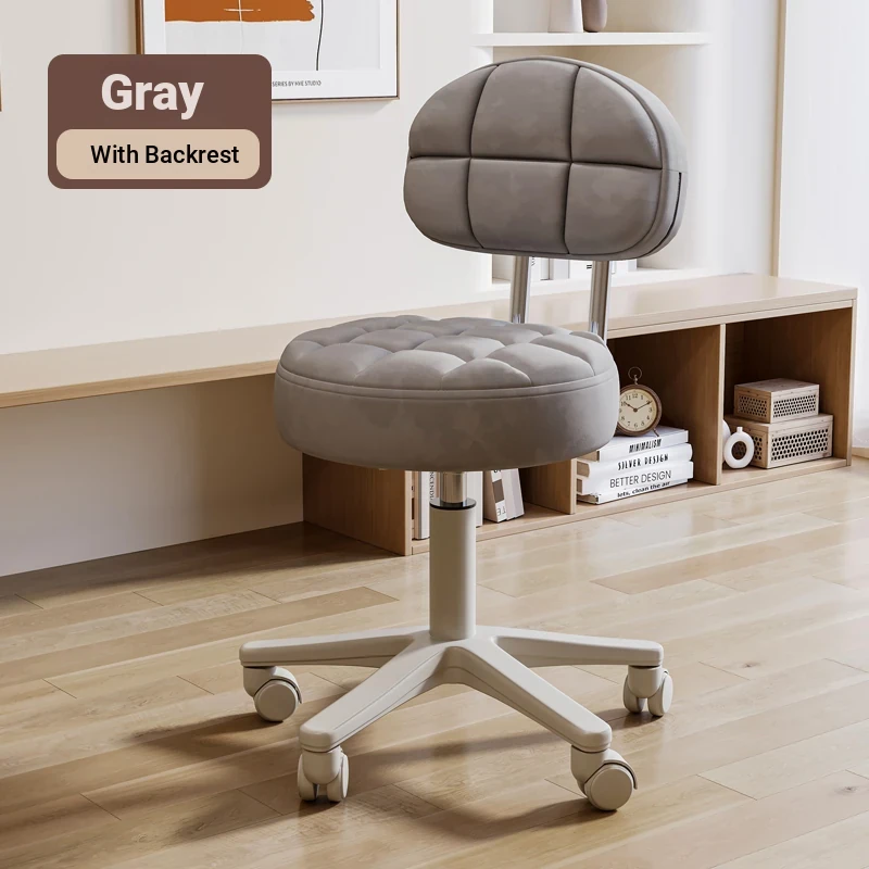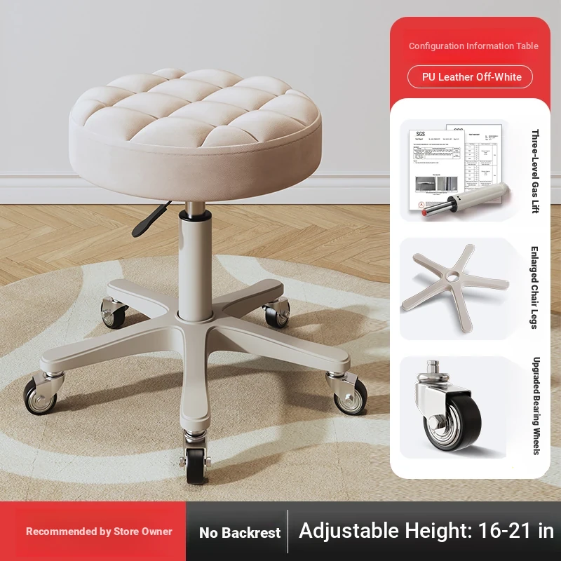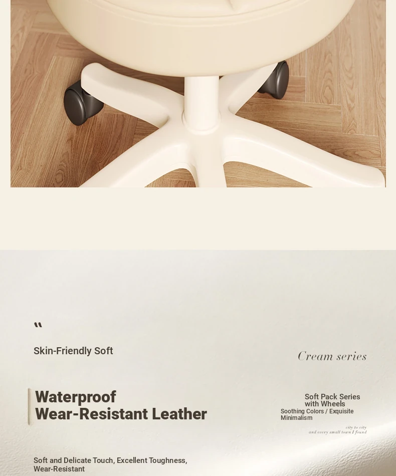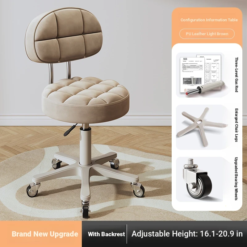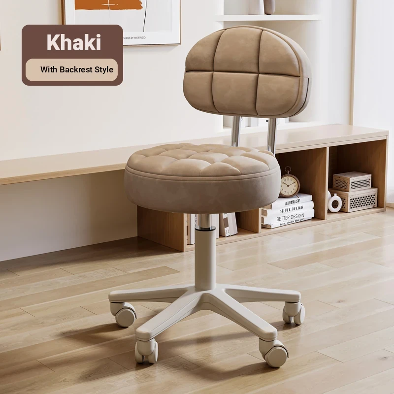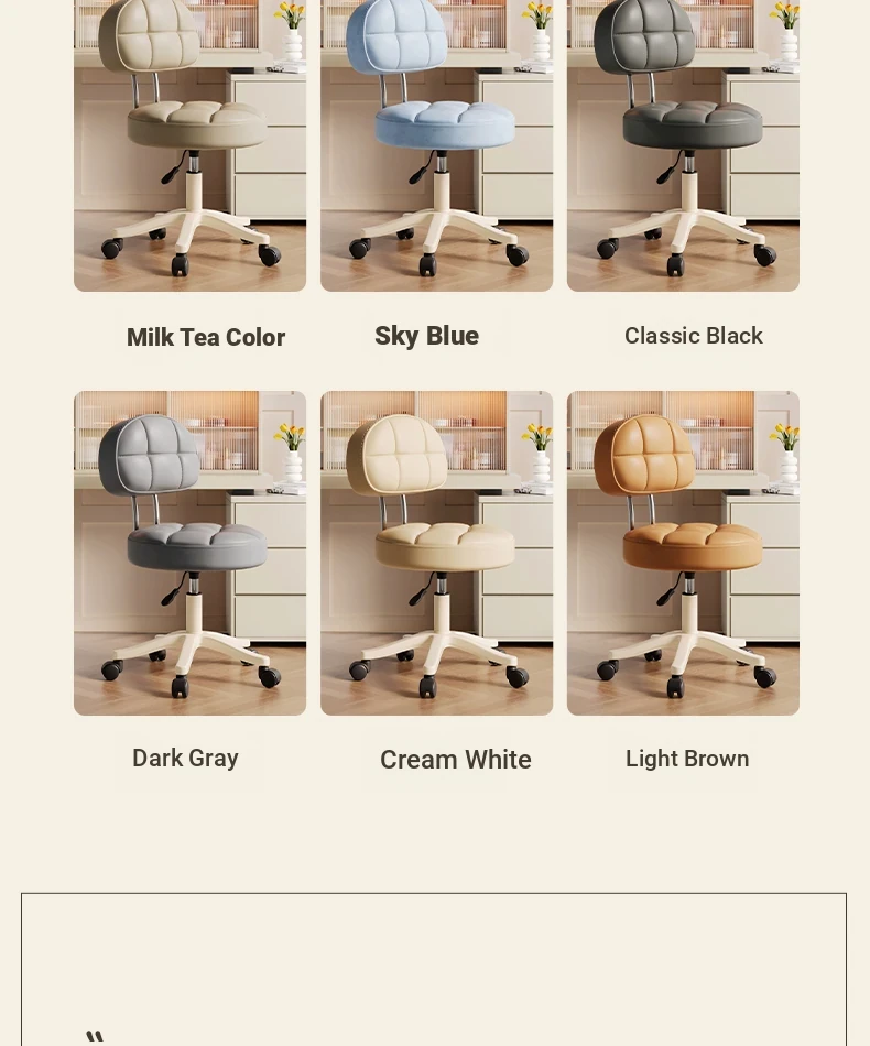Elegant Cream Round Makeup Chair for Girls' Bedrooms - Stylish Vanity Stool with Backrest, Perfect for Home Use and Nail Art, Luxurious Design on Smooth Rolling Wheels.