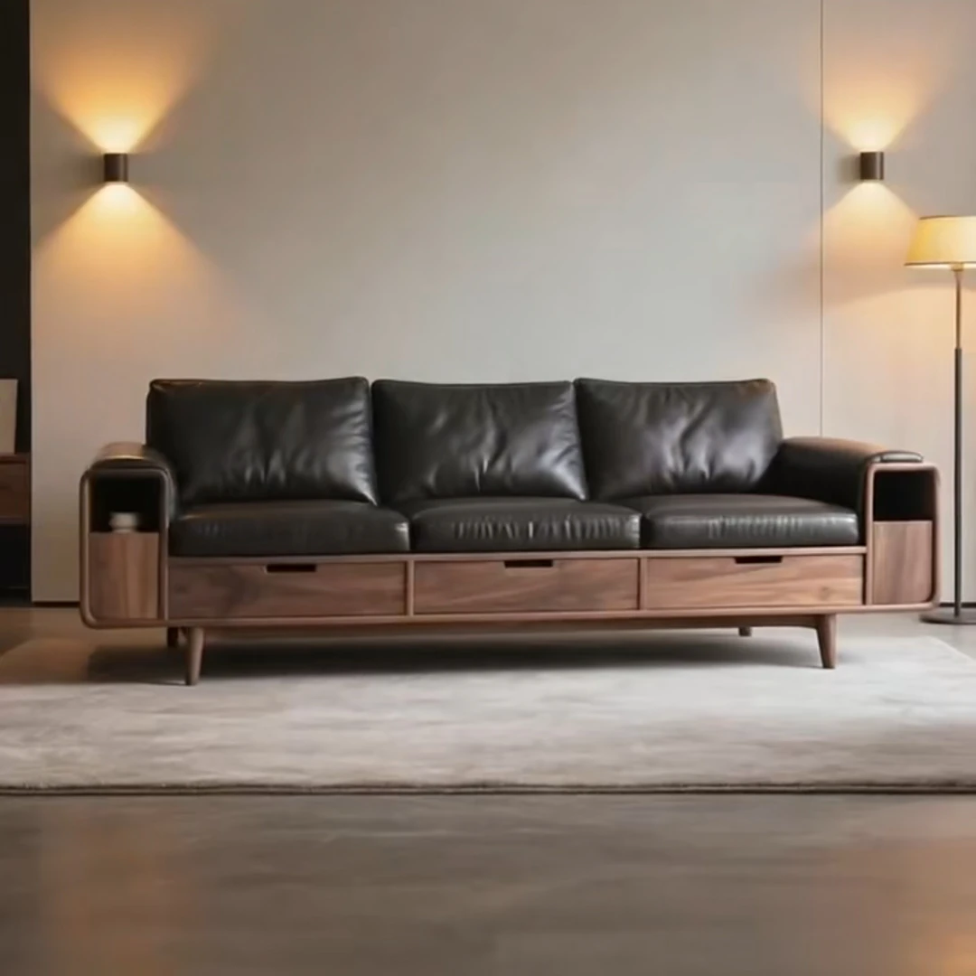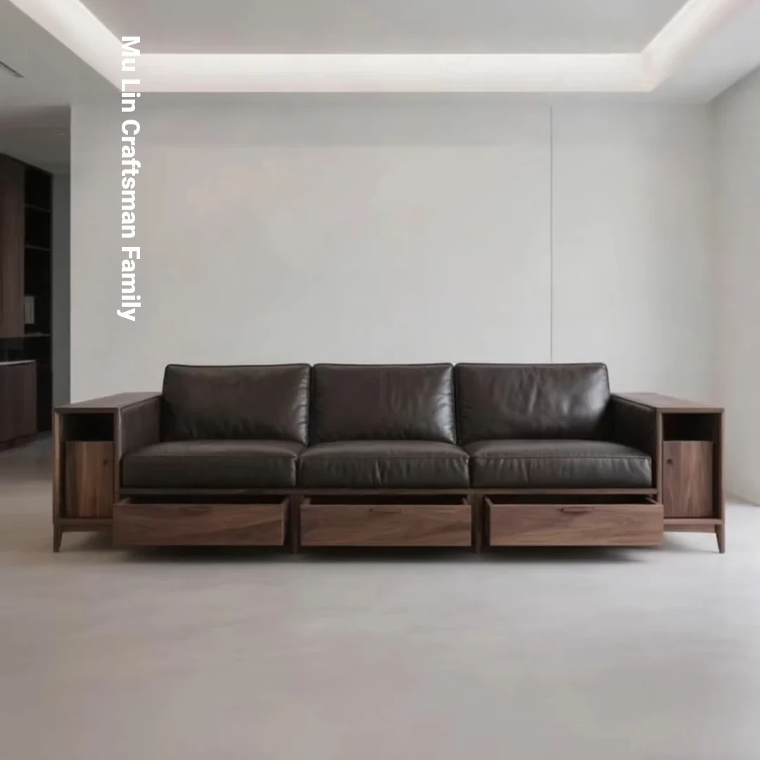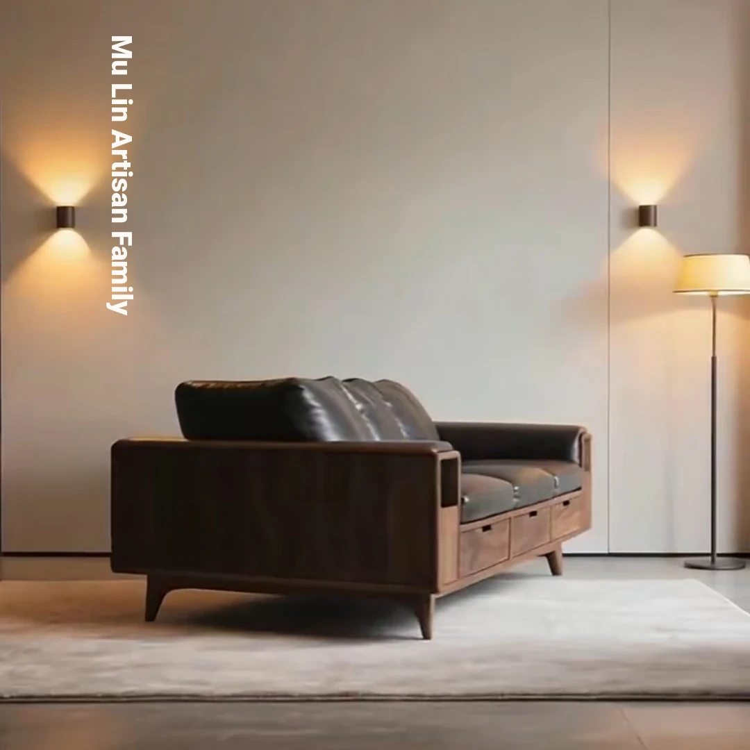 Elegant New Chinese Style North American Black Walnut Solid Wood Sofa - Luxury Minimalist Leather Furniture for Villas, Inspired by Song Dynasty Aesthetics, Perfect for Your Living Room.