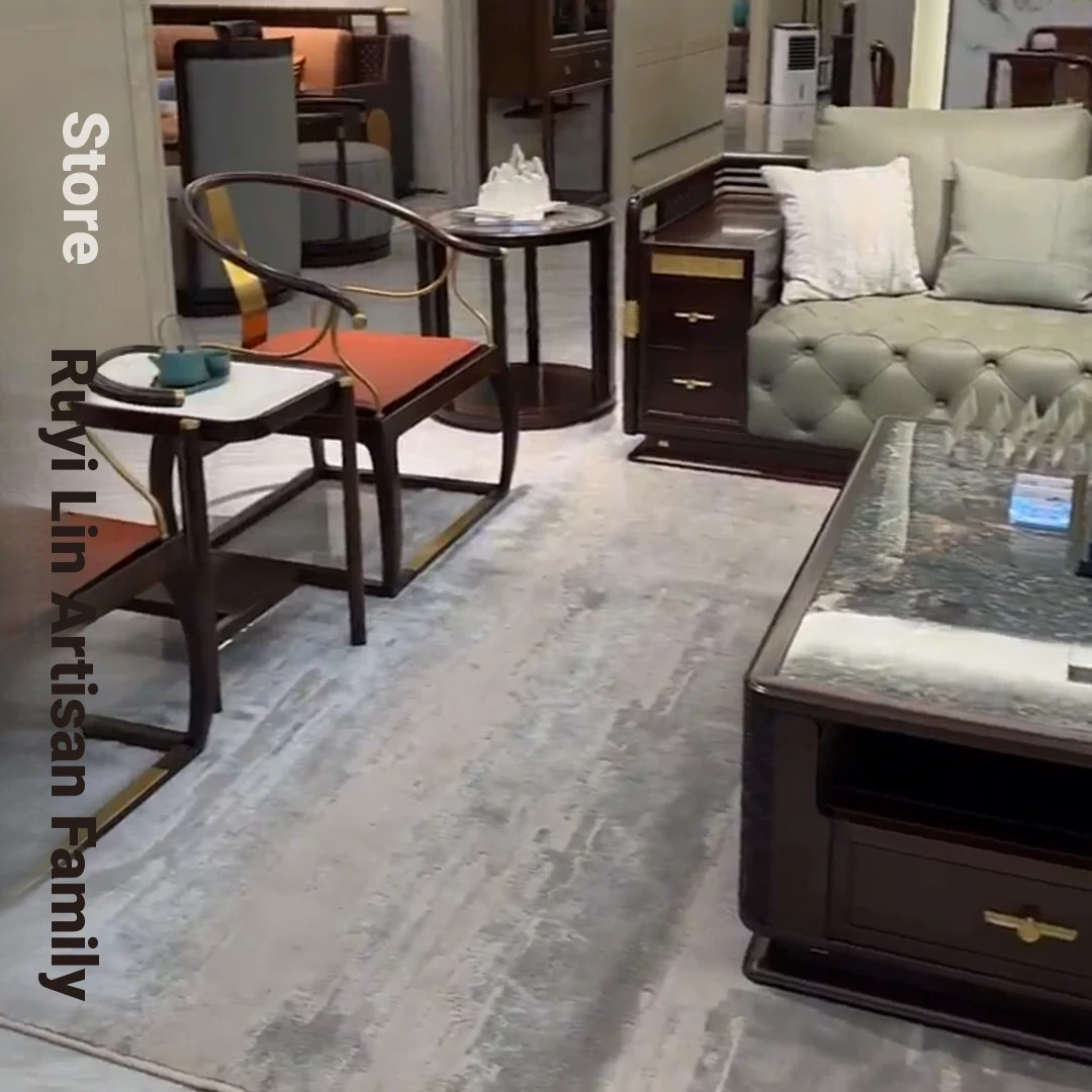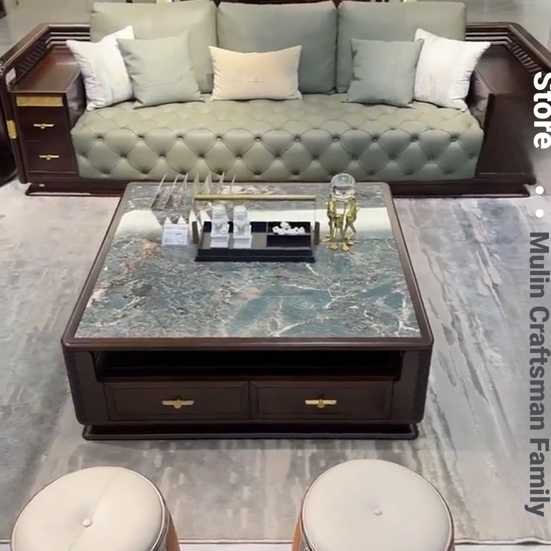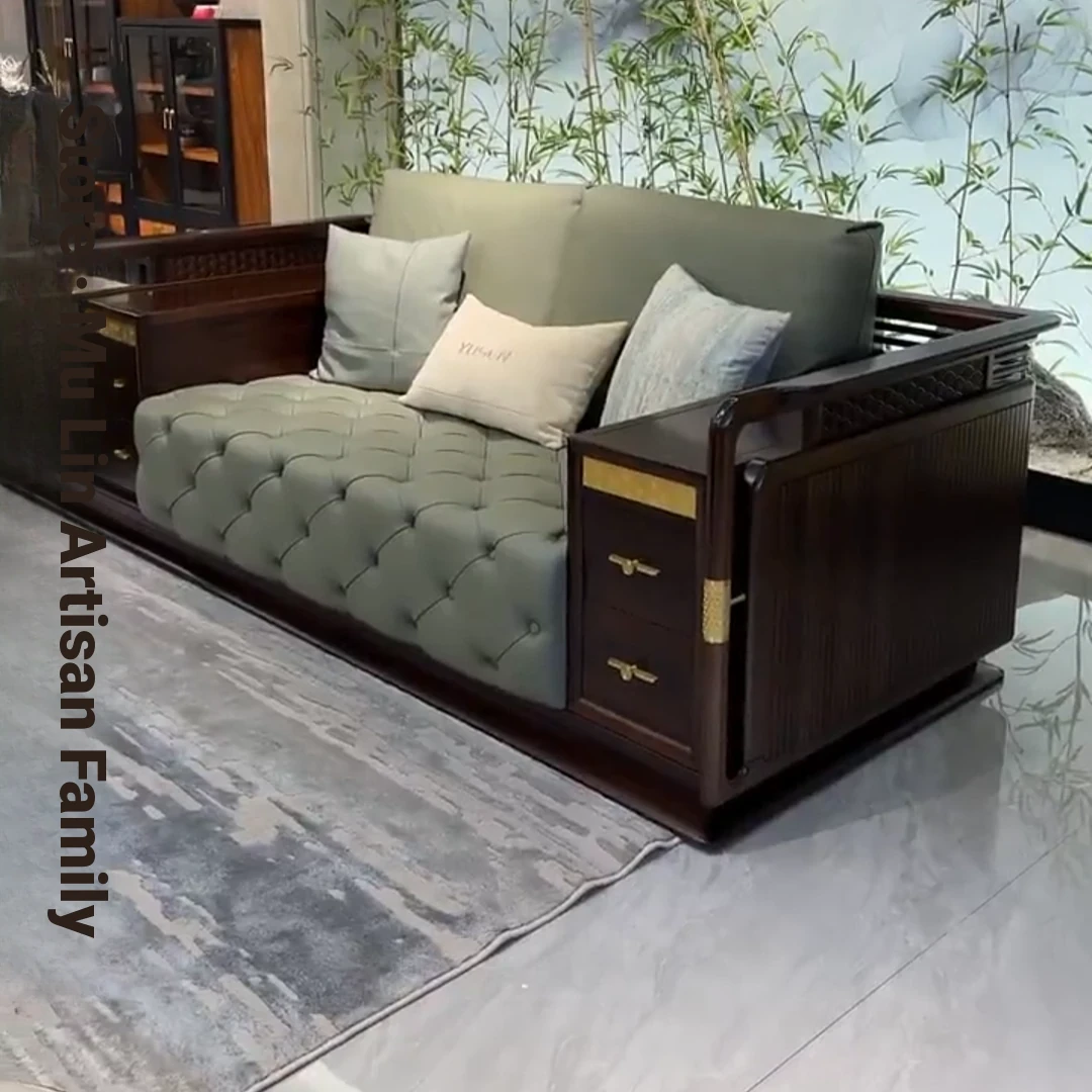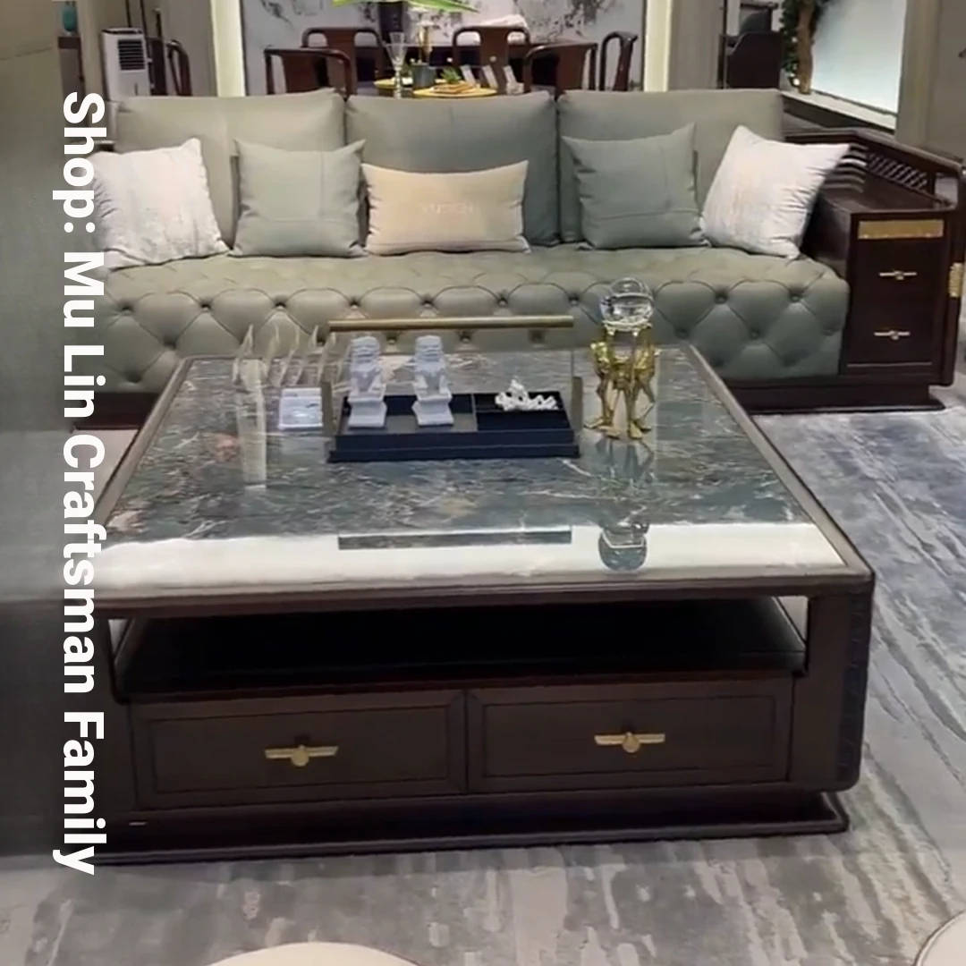 Elegant New Chinese Style Solid Wood Sofa and Coffee Table Set, Luxurious Hotel Ukin Wood Furniture for Villas and Large Apartments, Featuring High-Quality Leather Upholstery.