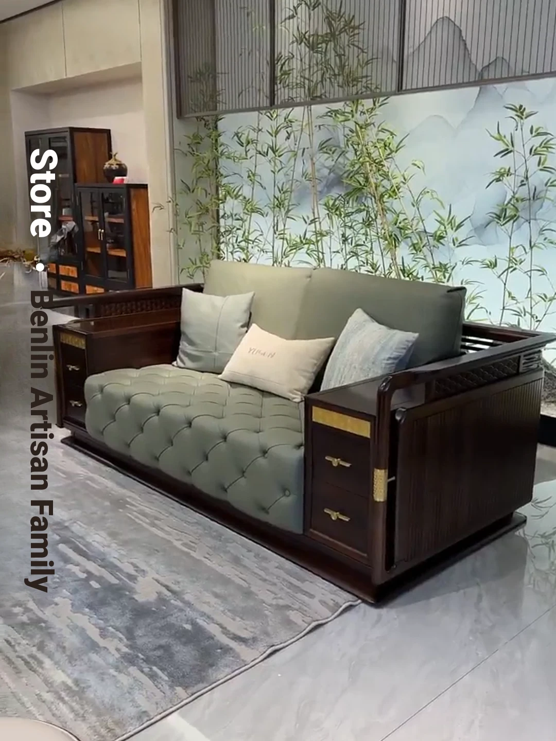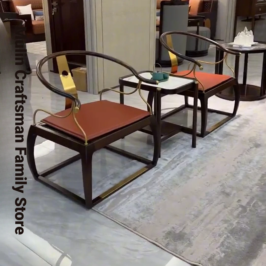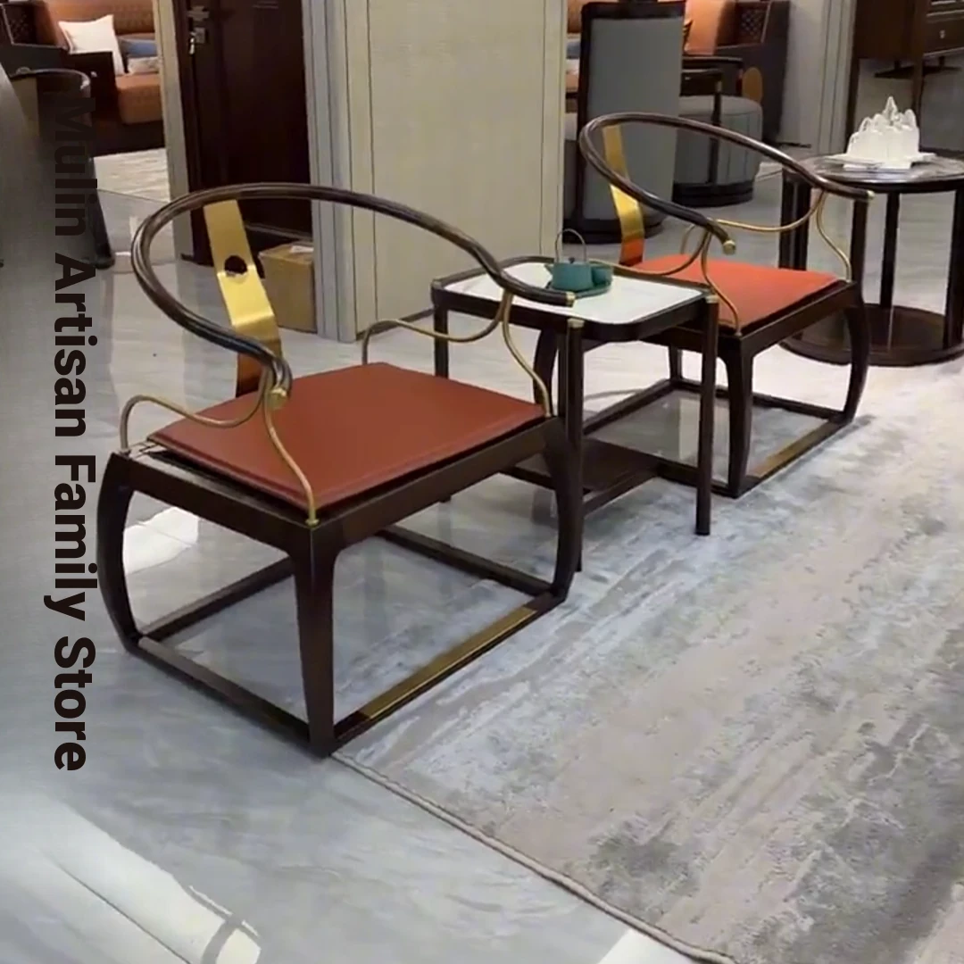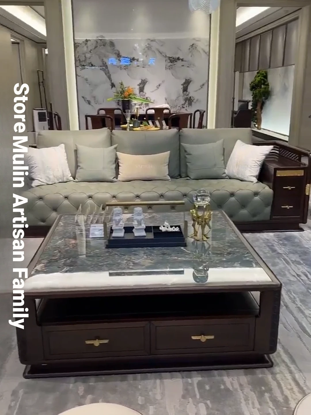 Elegant New Chinese Style Solid Wood Sofa and Coffee Table Set, Luxurious Hotel Ukin Wood Furniture for Villas and Large Apartments, Featuring High-Quality Leather Upholstery.