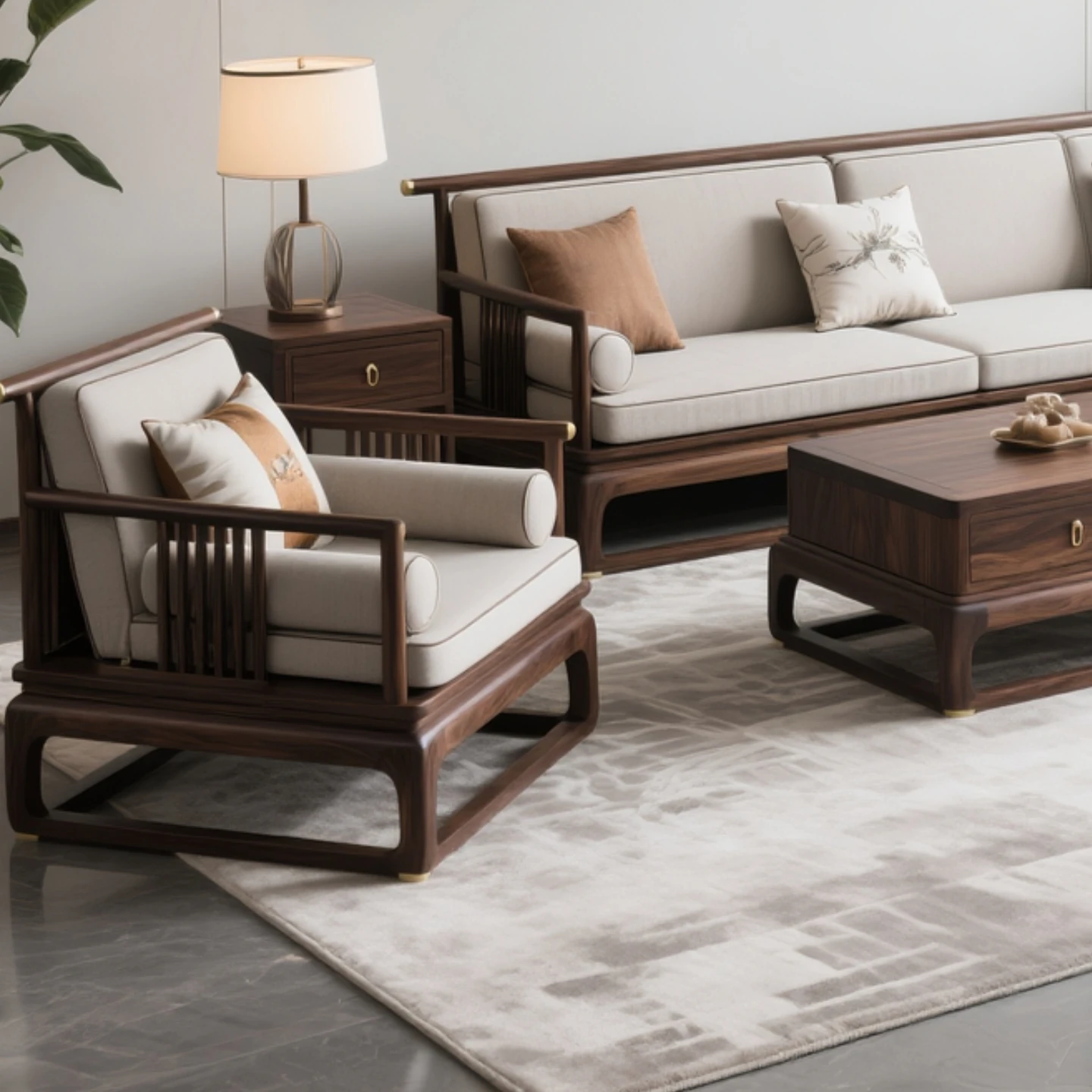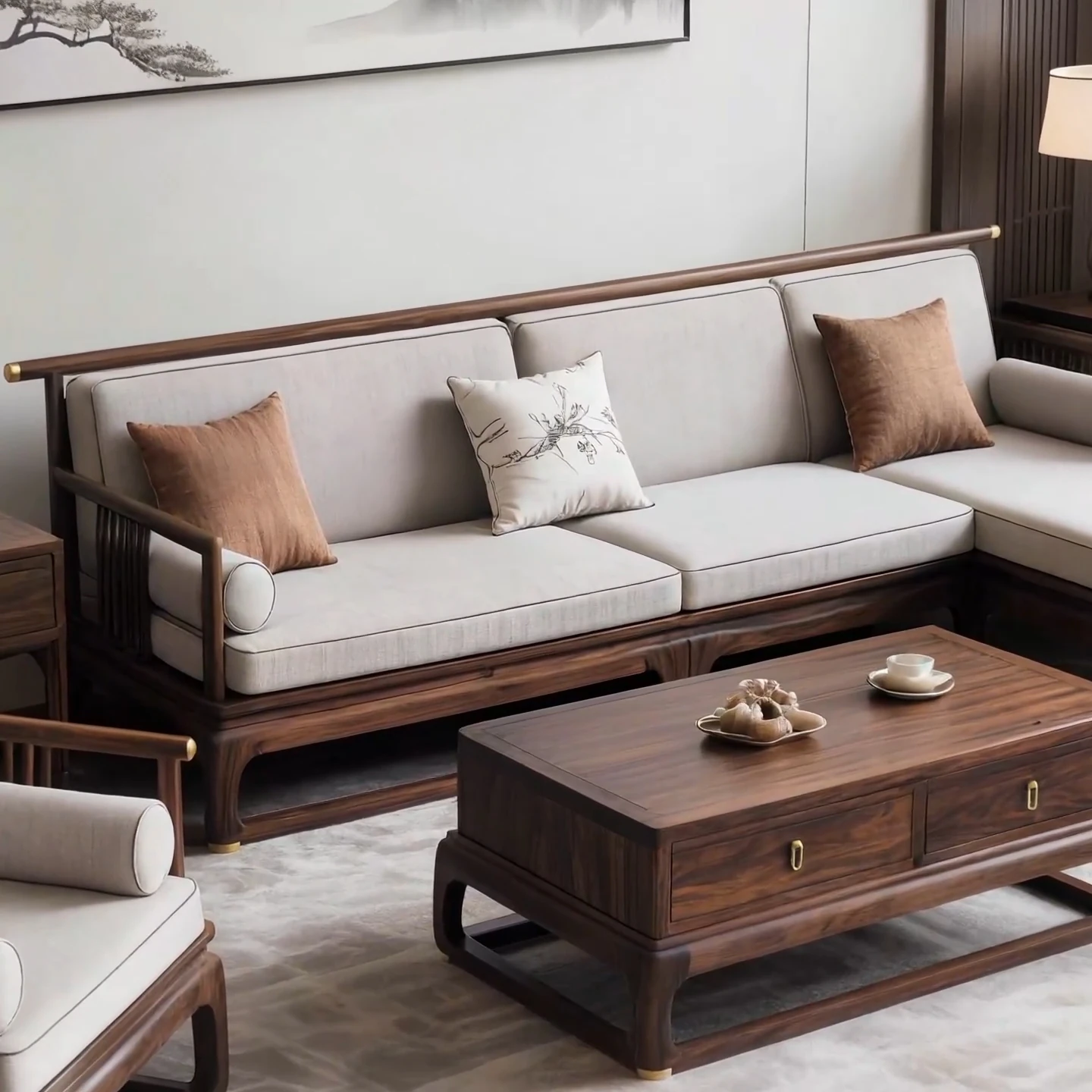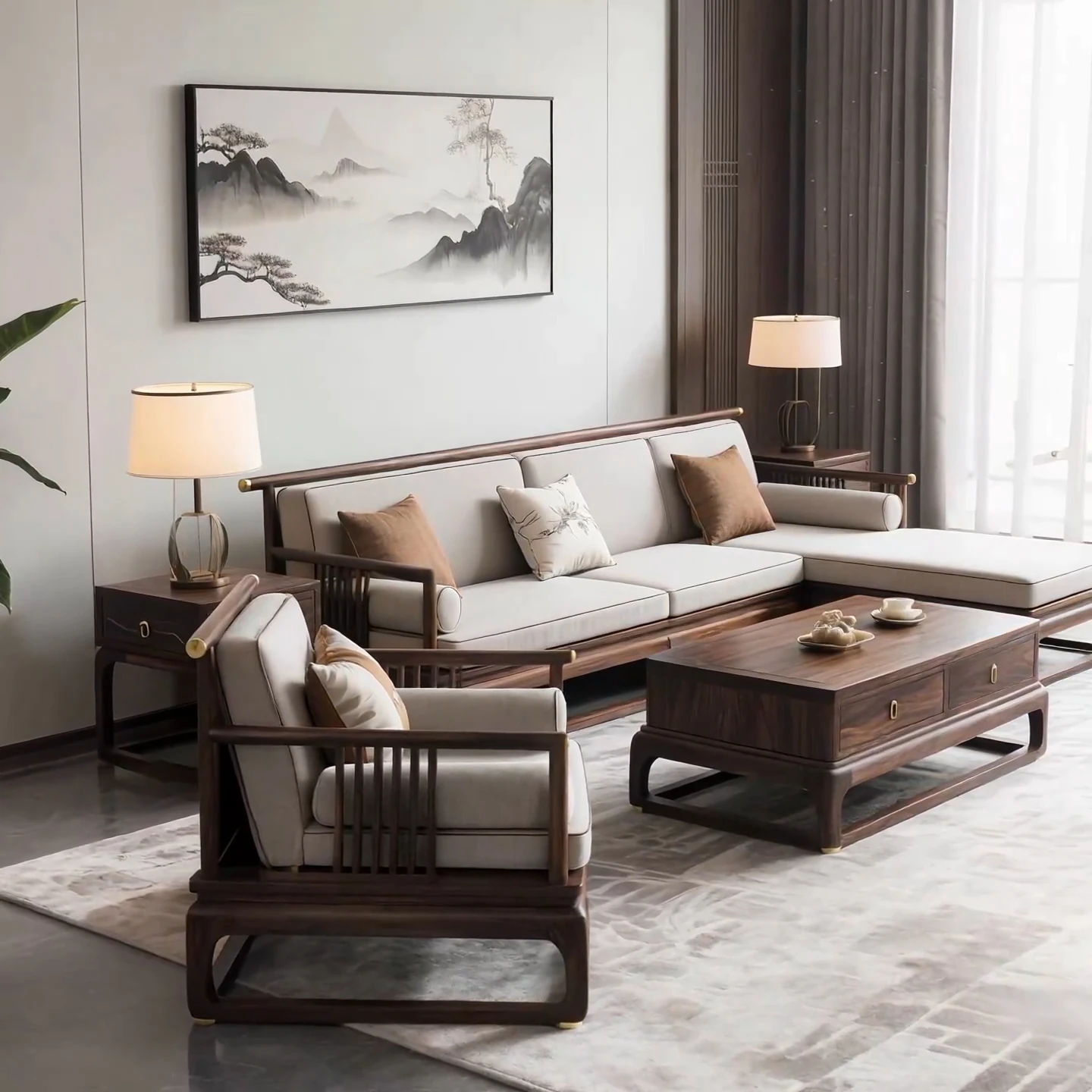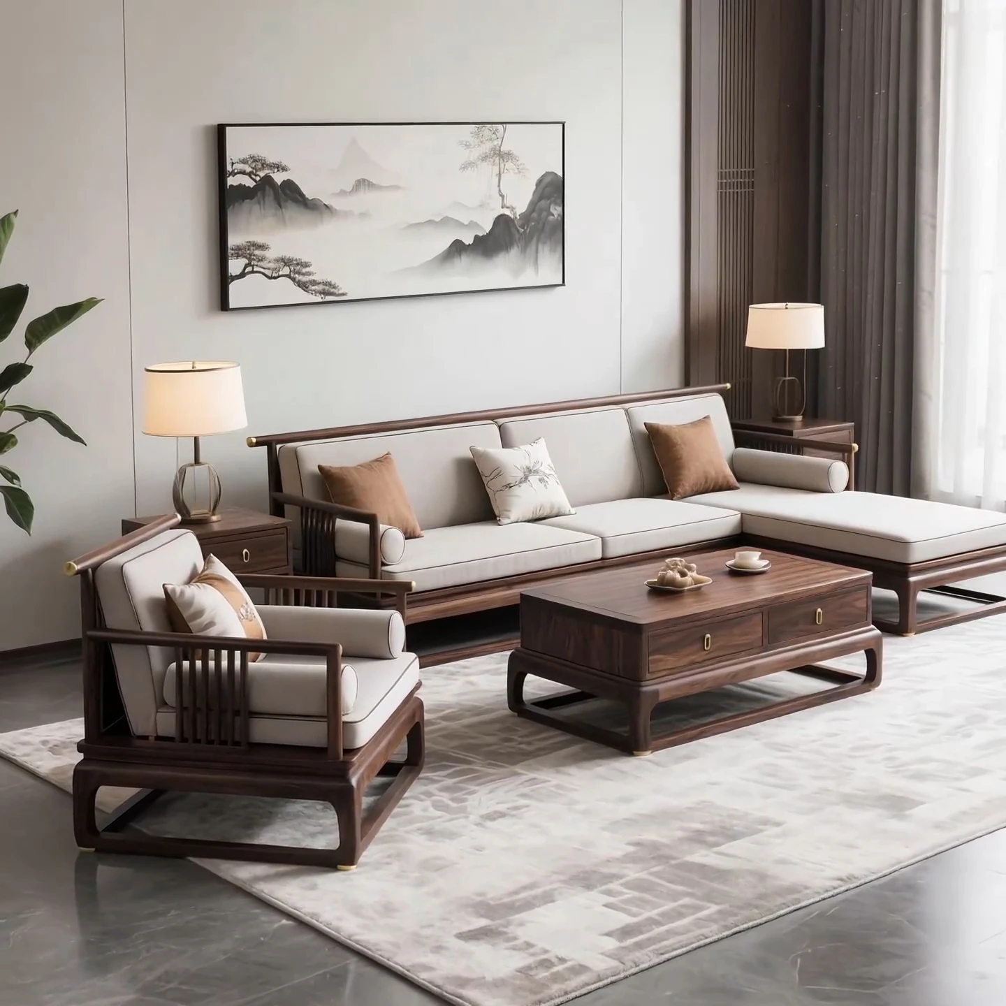 Elegant North American Black Walnut Sofa Bed Set with Chaise Lounge - Solid Wood for Villas and Showrooms, Perfect for Guest Reception