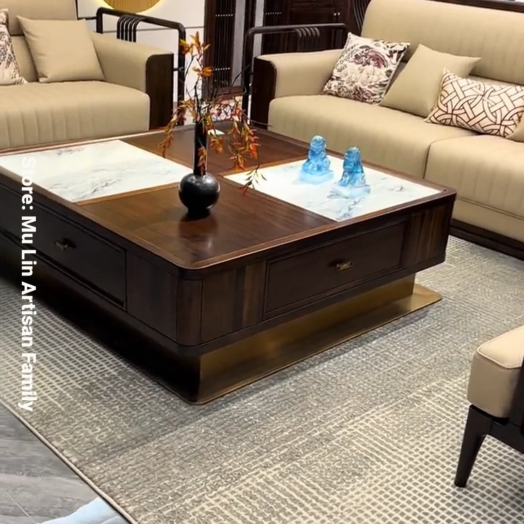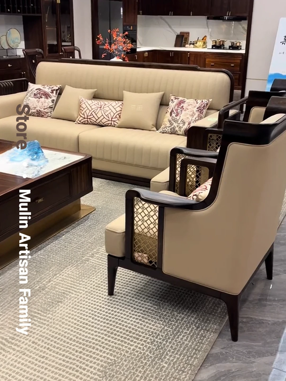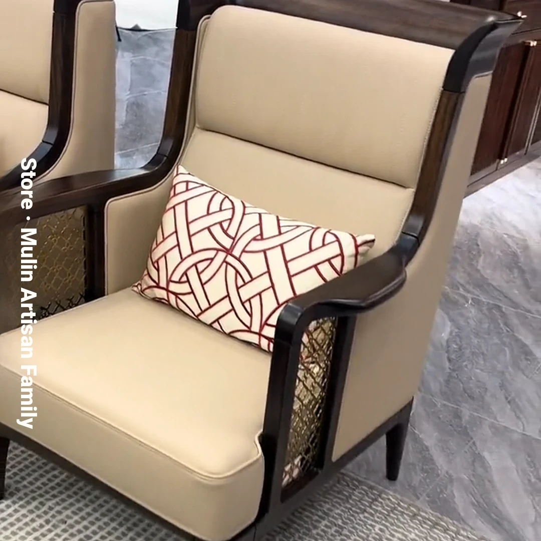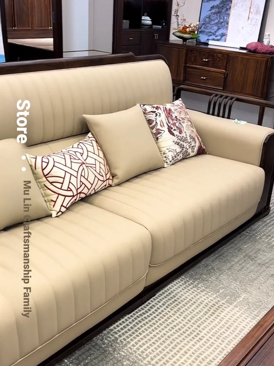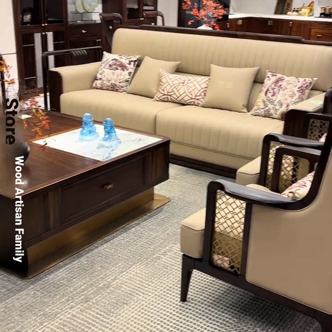Modern Chinese Solid Wood Sofa Set - Luxurious Black Walnut Leather Sofa for Large and Medium-sized Villas and Living Rooms