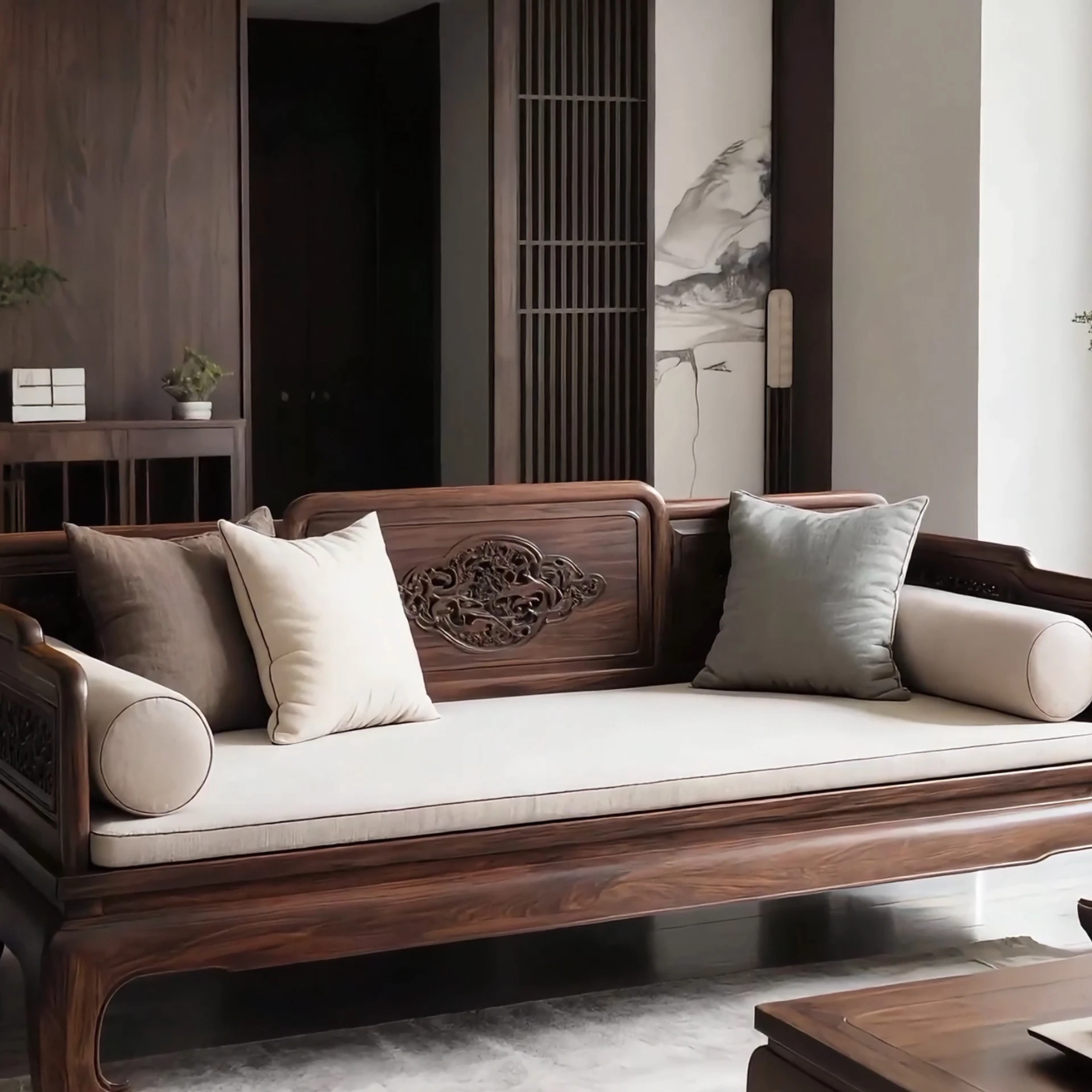 New Chinese Style Luohan Sofa - North American Black Walnut Solid Wood, Elegant Zen Design for Tea Rooms and Living Rooms, Carved Details, Perfect for Various Room Sizes