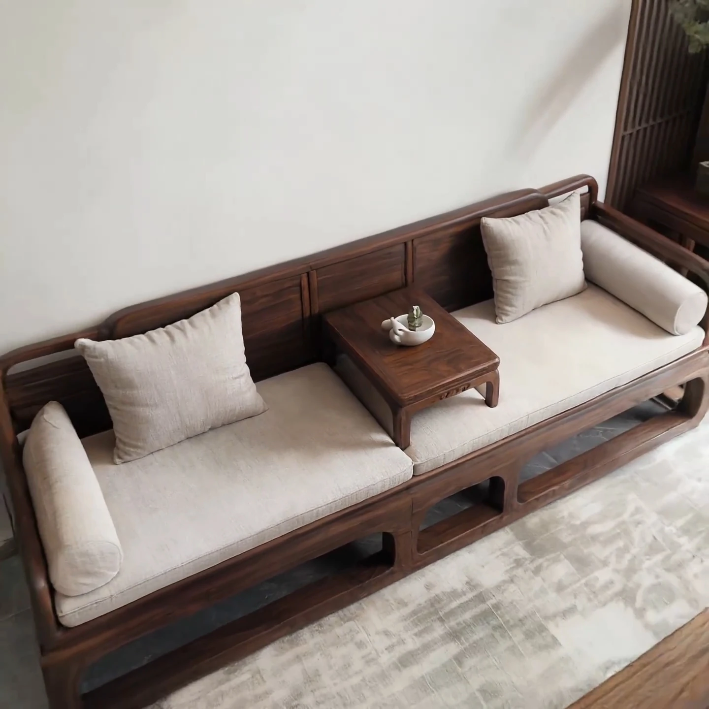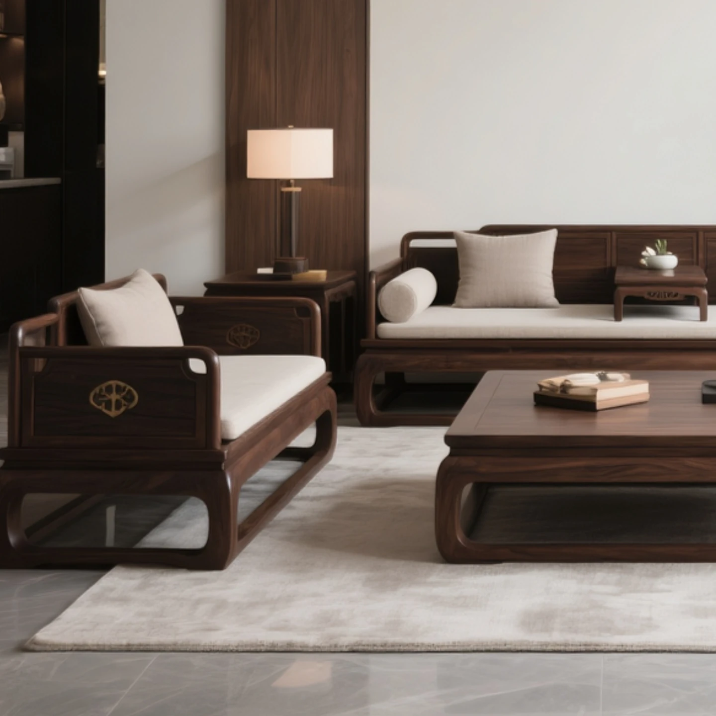 New Chinese Style North American Black Walnut Rohan Bed Solid Wood Sofa Set - Ideal for Villas, Model Rooms, and Hotel Reception Furniture. Embrace elegance and comfort with our exquisite craftsmanship!