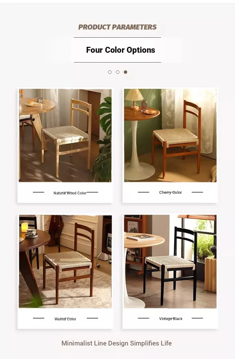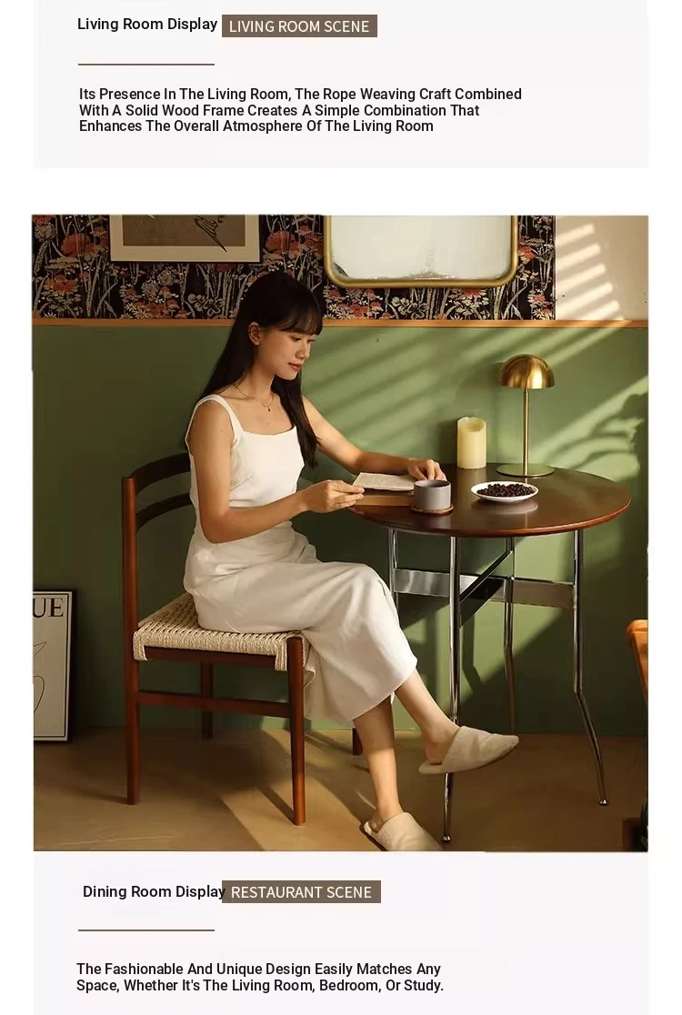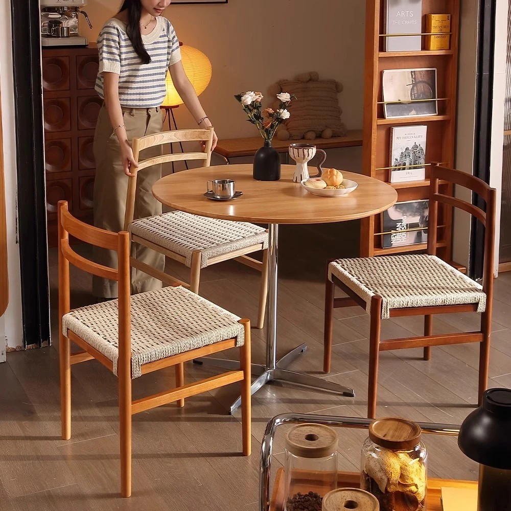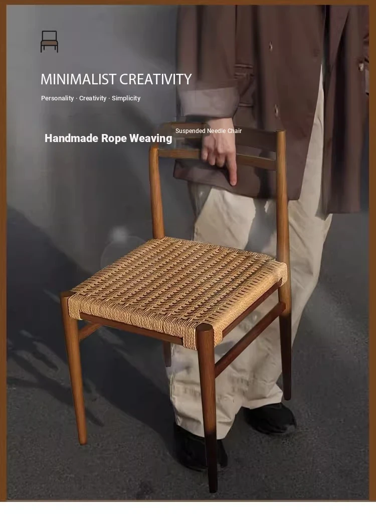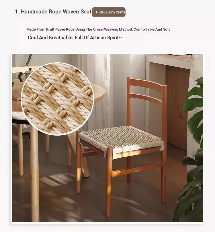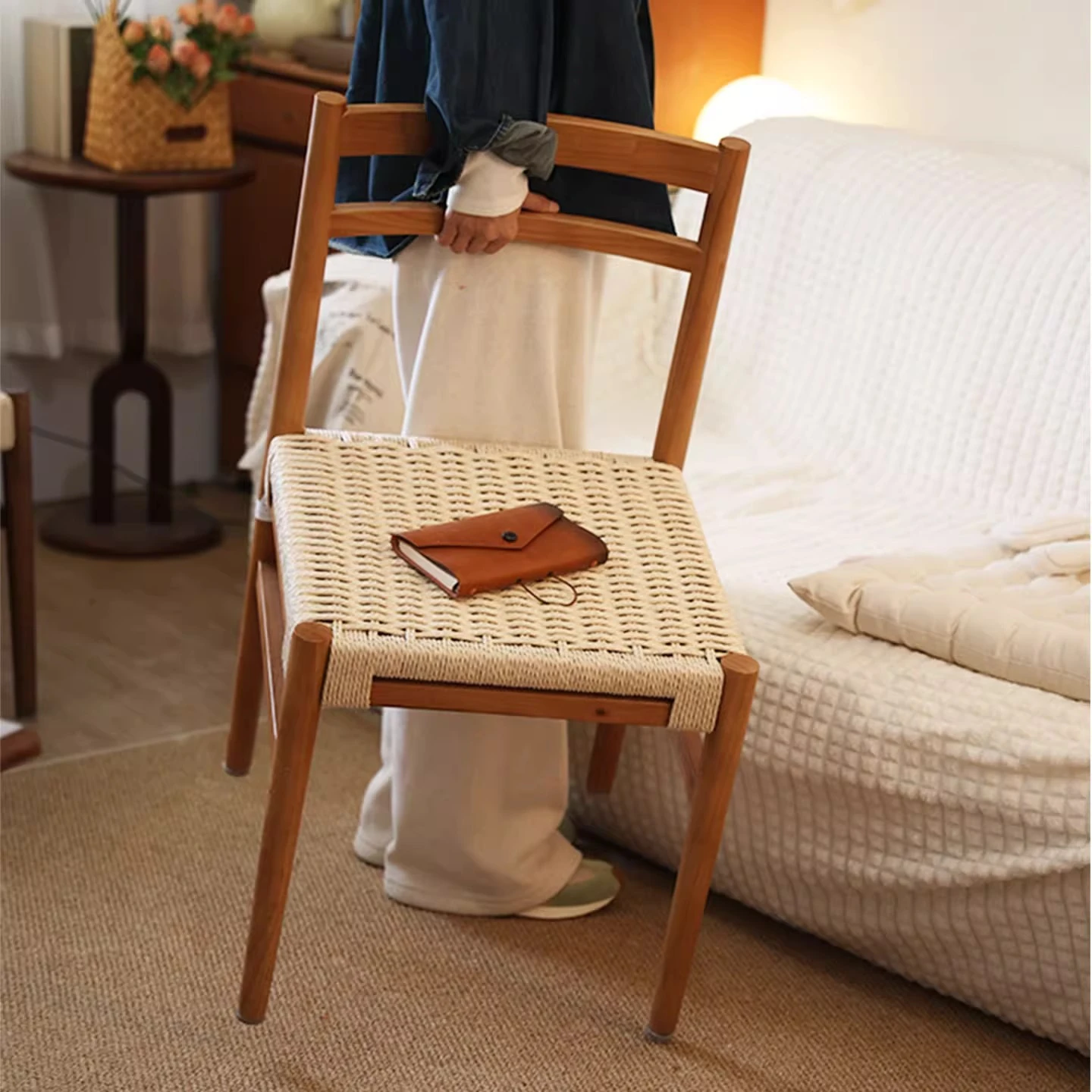 Rustic Solid Wood Rope-Woven Dining Table Chairs - Stylish Backrest Chairs for Home Use, Ideal for Living Room and Tea Time, Featuring Wabi-Sabi Design in Walnut Finish