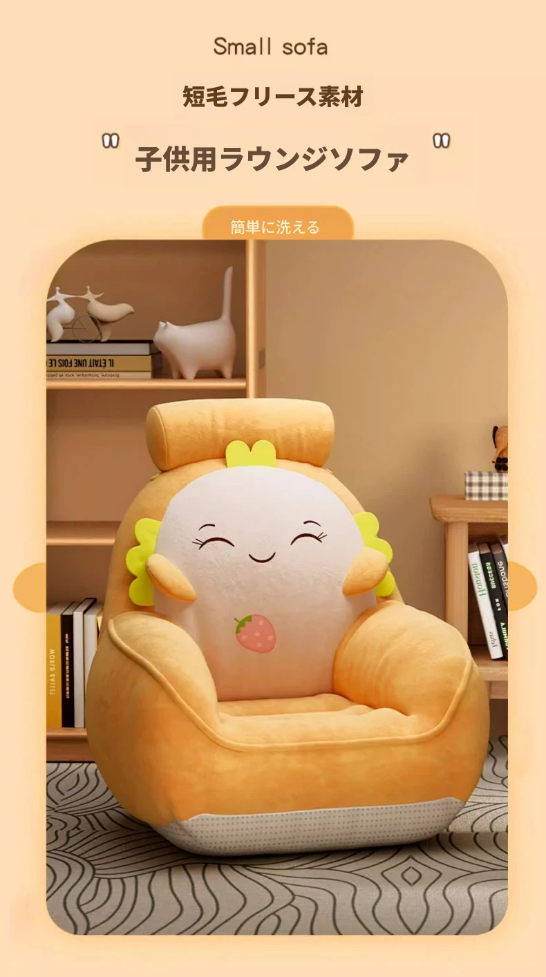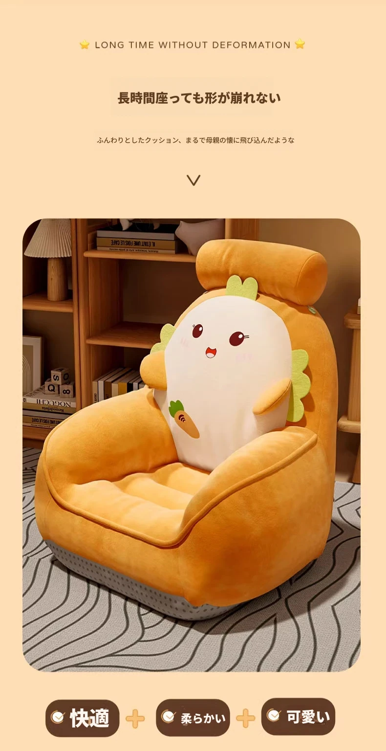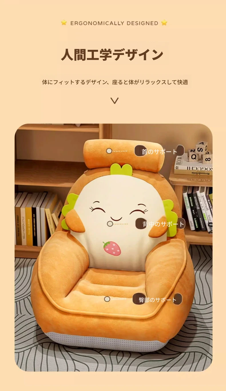 かわいいカートゥーンデザインの畳ソファ!リラックスできる座り心地で、リビングや寝室、窓辺にもぴったり。読書やくつろぎタイムに最適なクッションと背もたれ付きの可愛いスツール。