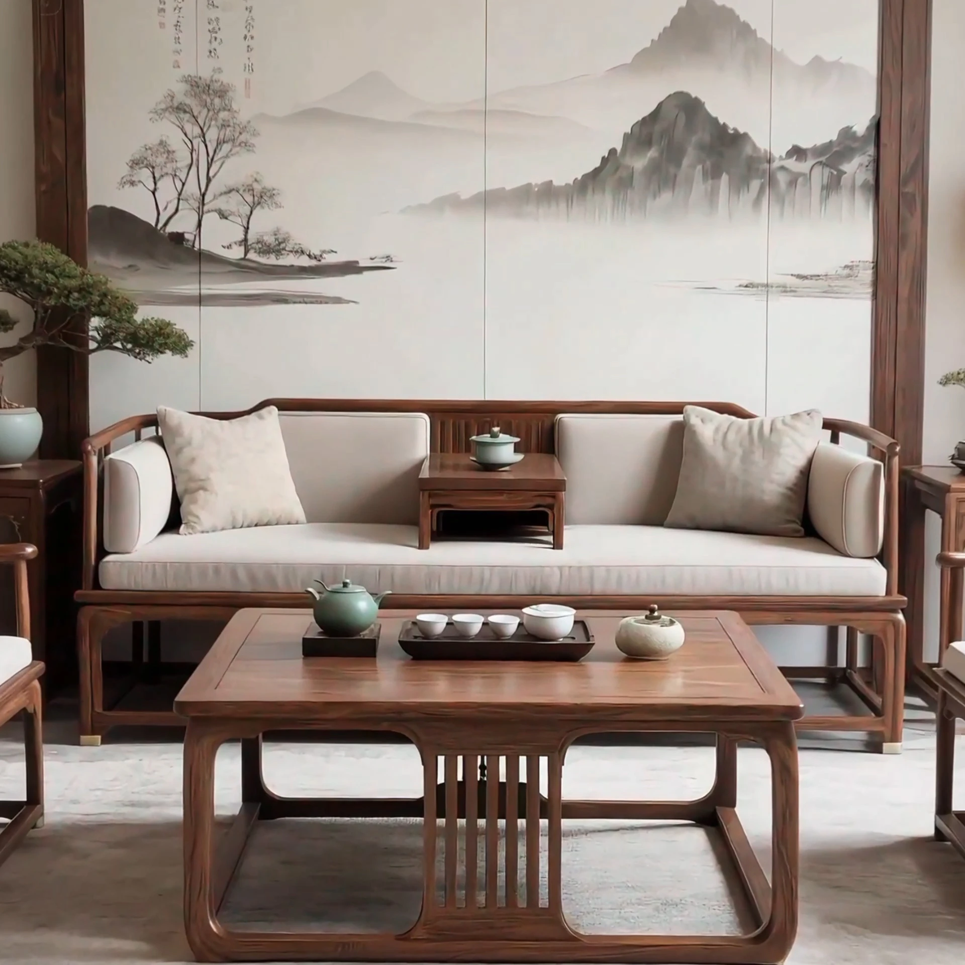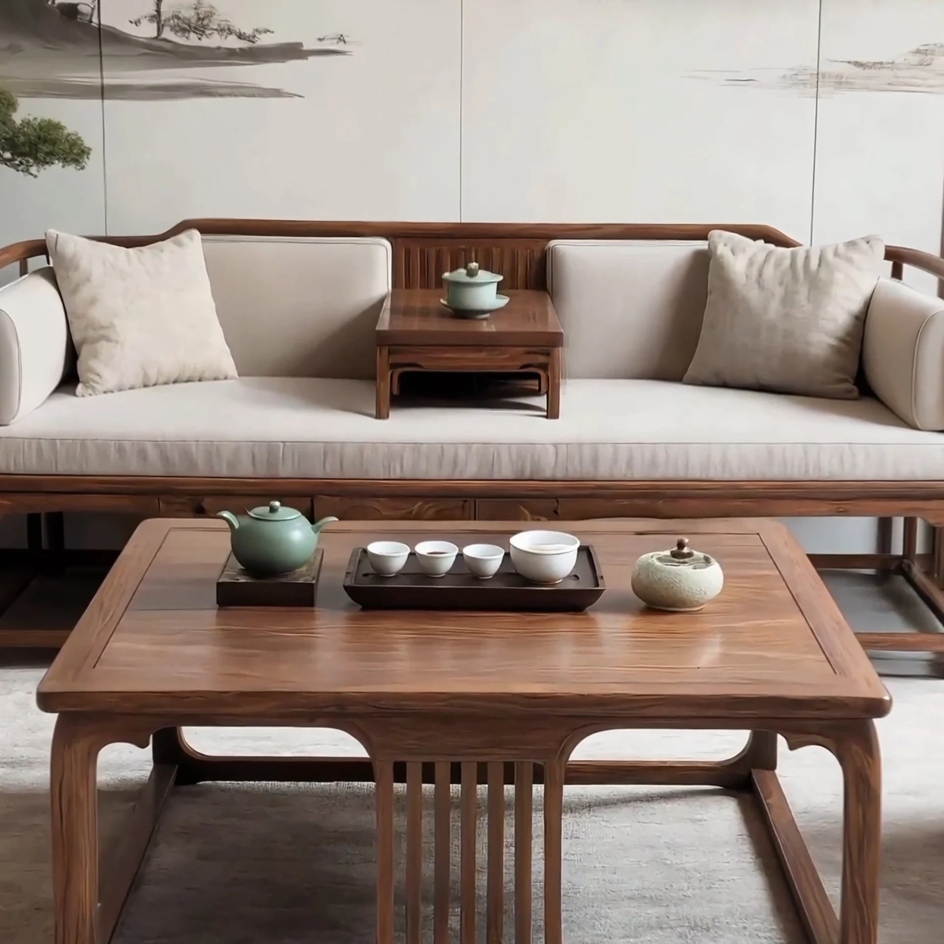 新中式スタイルの羅漢床&実木製ソファ・テーブルセット - 宋氏別荘モデルルーム・ホテル・クラブ向けの高級接待家具。心地よい和の空間で、特別なひとときを演出します。