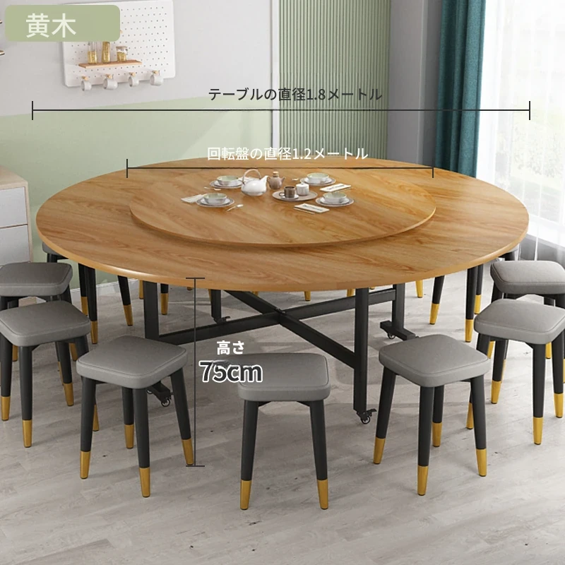 1.8メートル黄木目+1.2メートル強化ガラス回転台+12角スツール