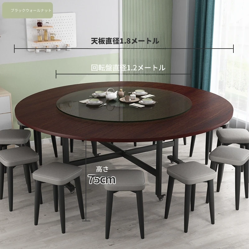 1.8メートル黒ナッツ+1.2メートル強化ガラス回転台+12角スツール