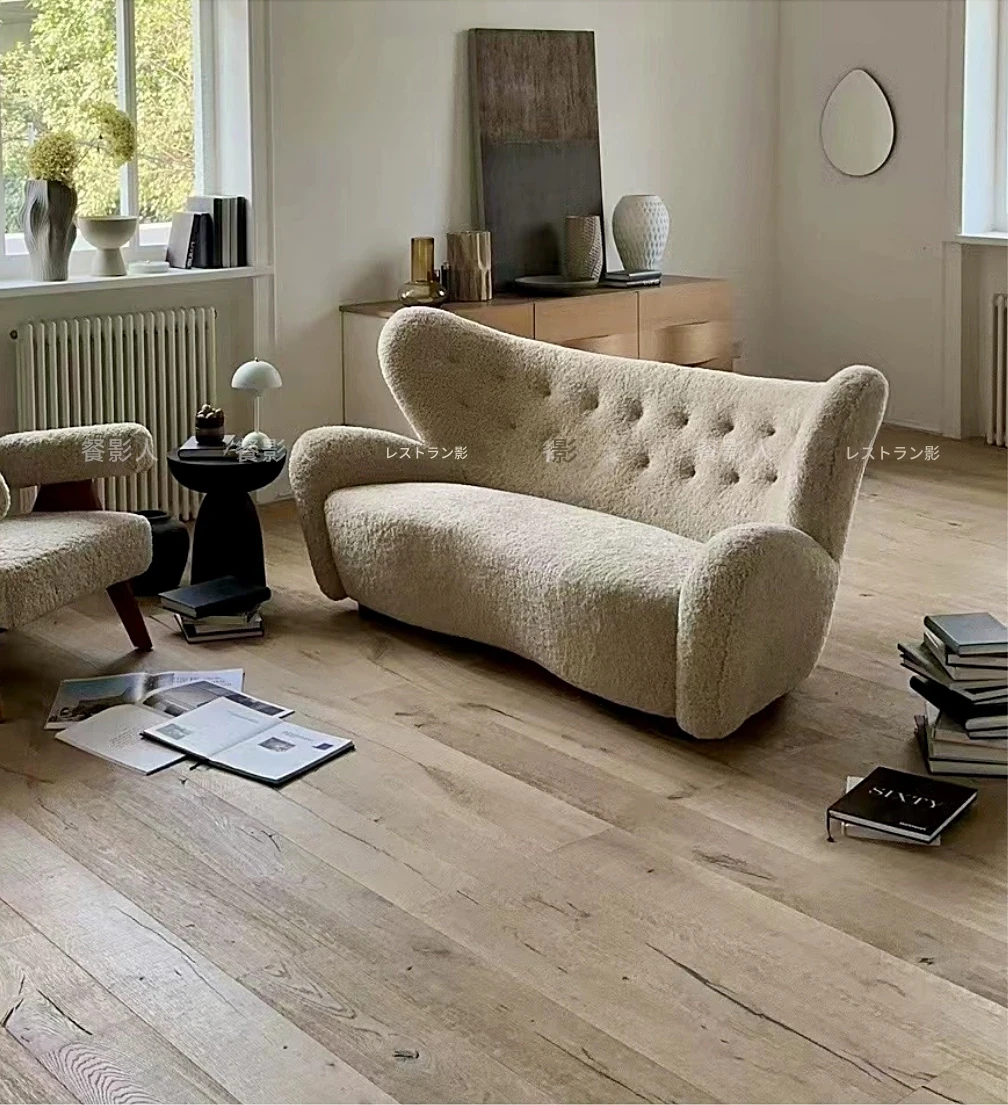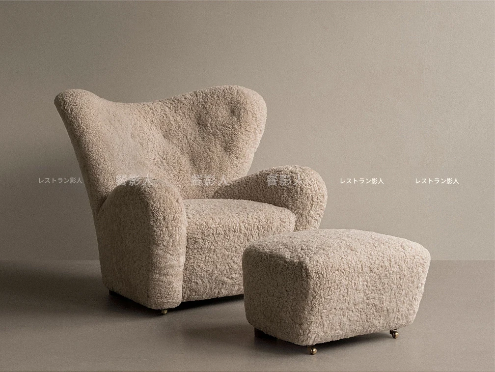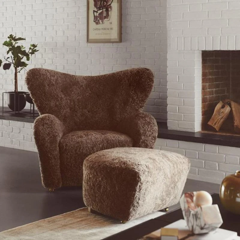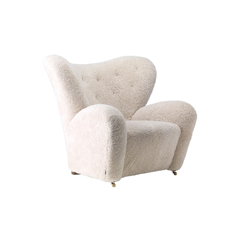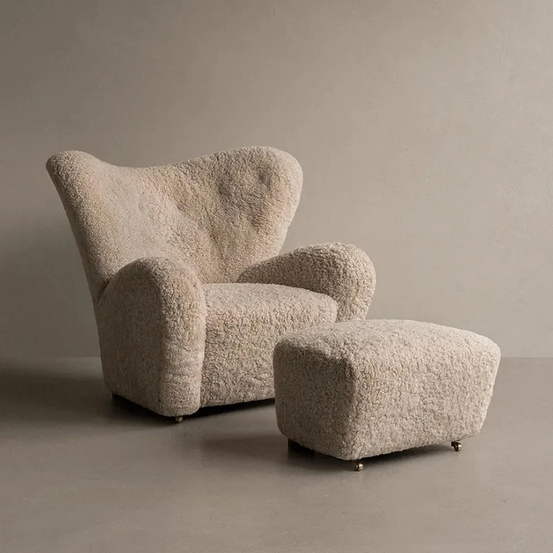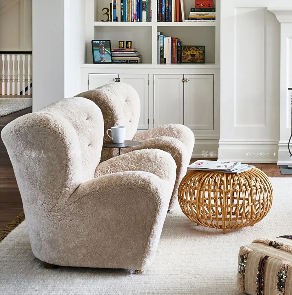フランス風アンティーク真羊毛サハフチェア - クリーム色で長毛のデザイン、天然木製のリラックスチェア。おしゃれで快適な虎の椅子!お部屋のアクセントに最適です。