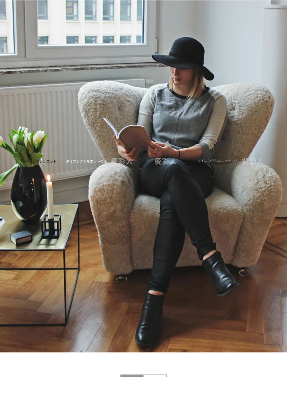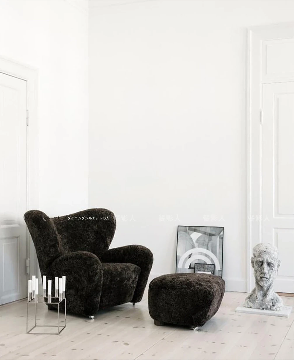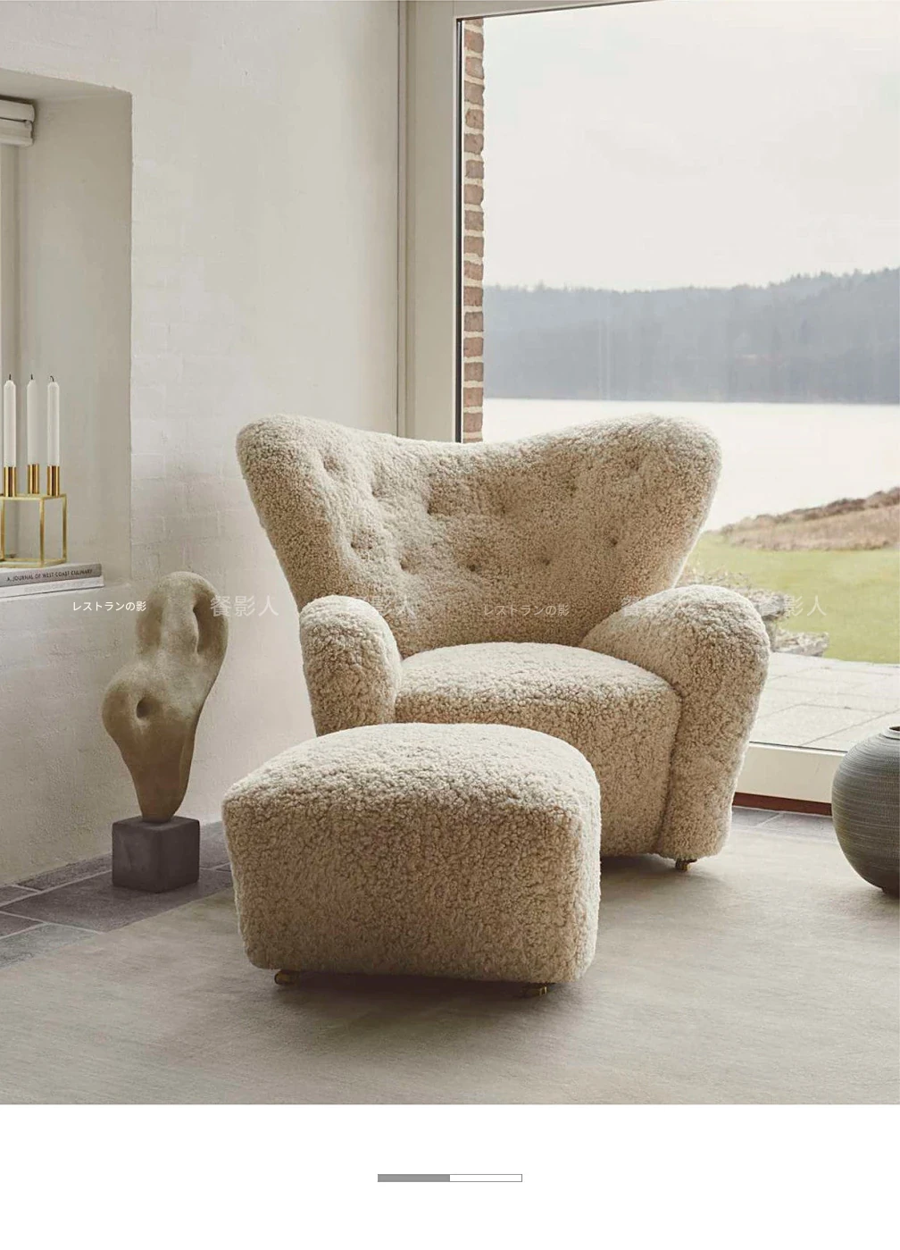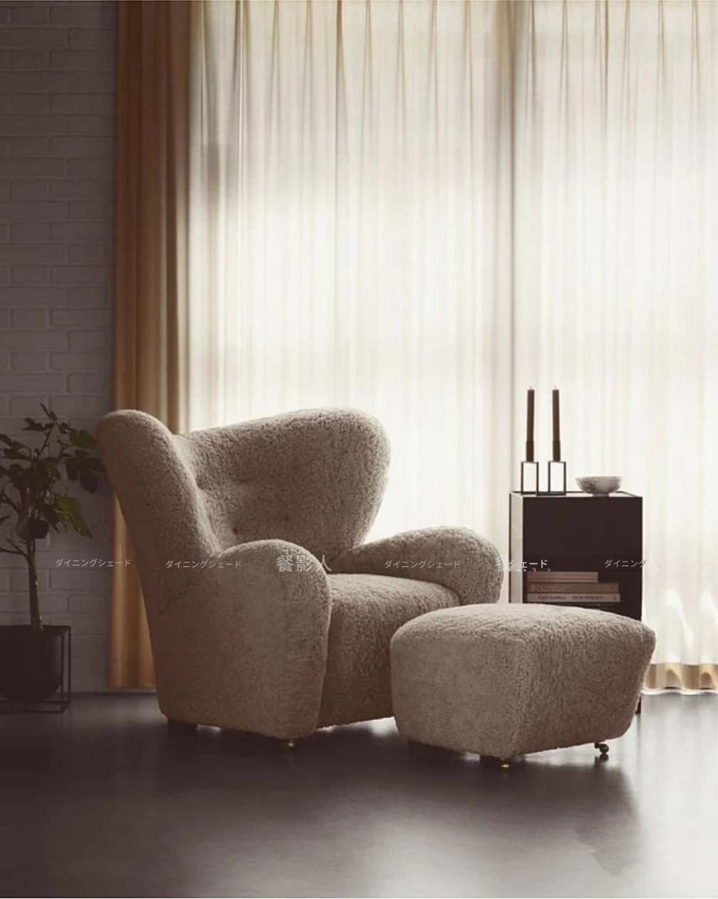 ミルクティー色のロングファーアームチェア+フットスツール(フェイクウール)
