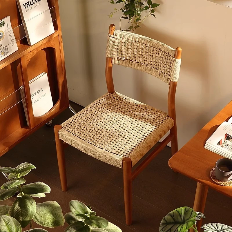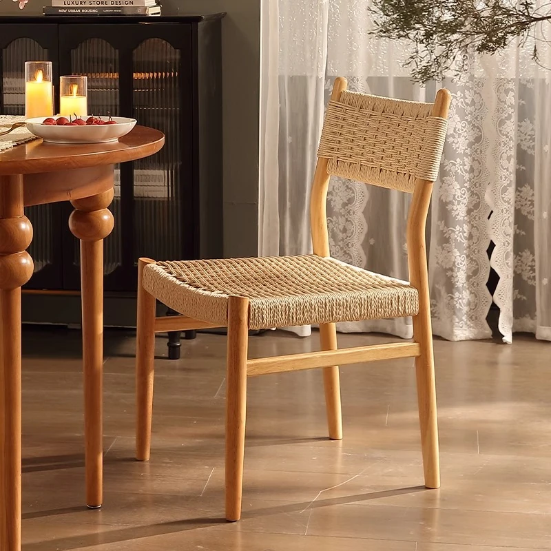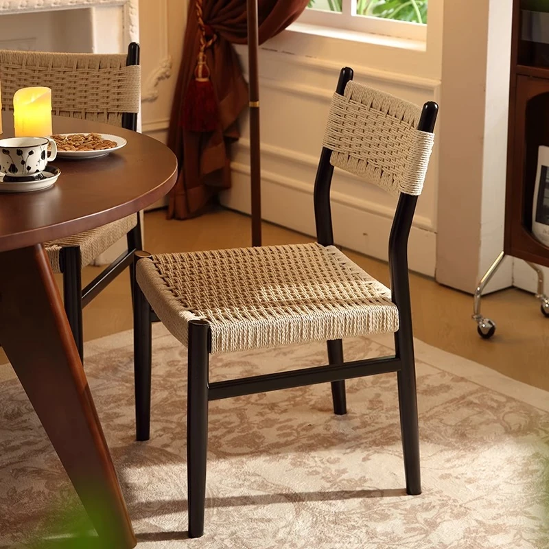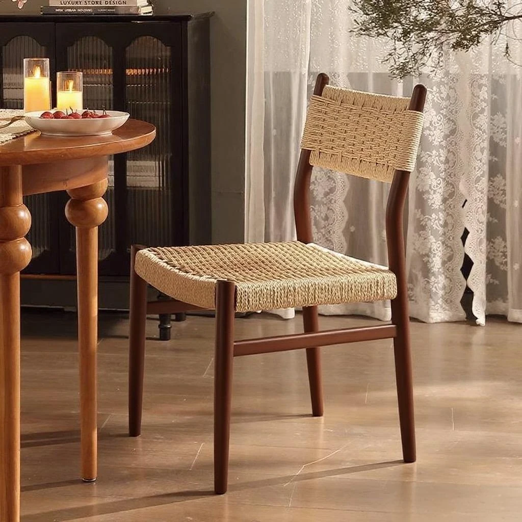 French Wabi-Sabi Style Dining Chair with Twisted Rope Backrest - Elegant and Luxurious Solid Wood Dining Chair for Home Use, Perfect for Vintage Tea Settings and Chic Dining Experiences