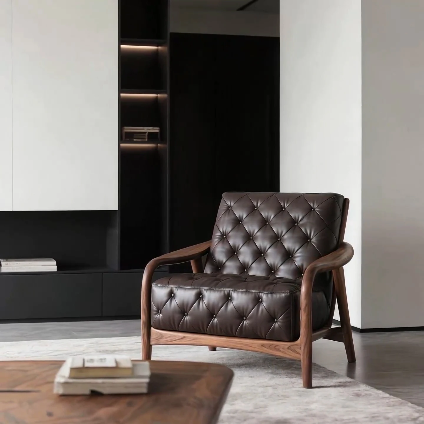 イタリアンスタイルの北米産ブラックウォールナット無垢材チーフソファ・デンマークデザインの北欧リビング&バルコニー用リラックスチェアで、洗練されたデザインと快適さを両立。あなたの空間に特別な魅力をプラス!