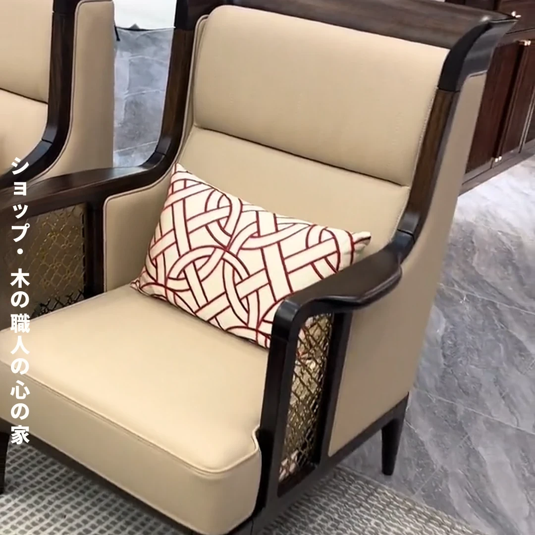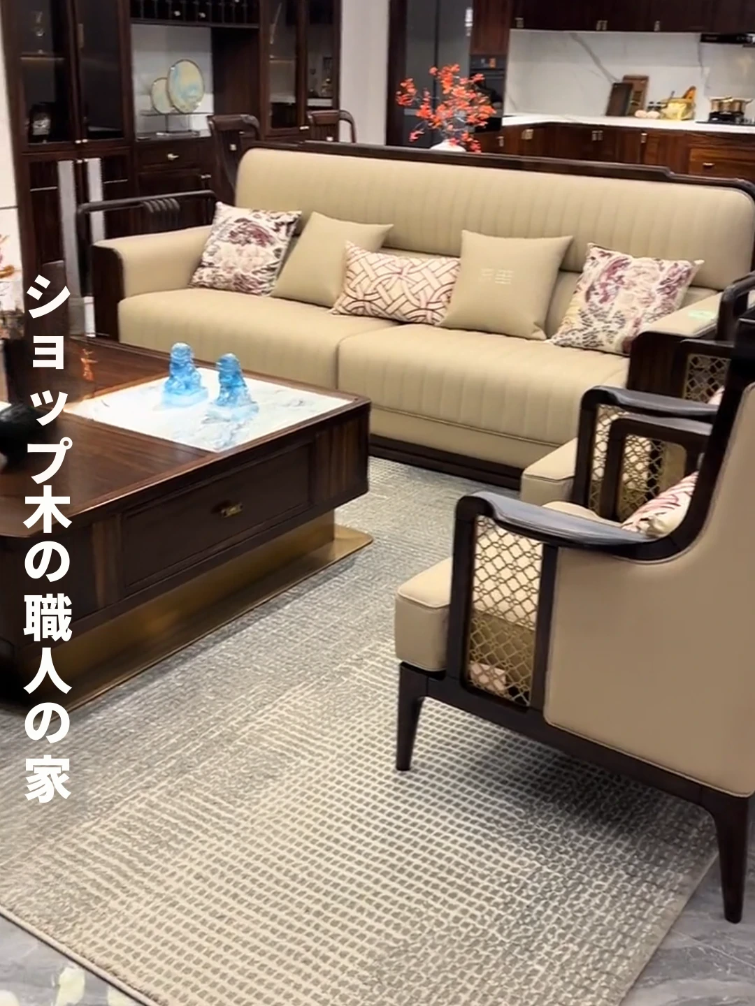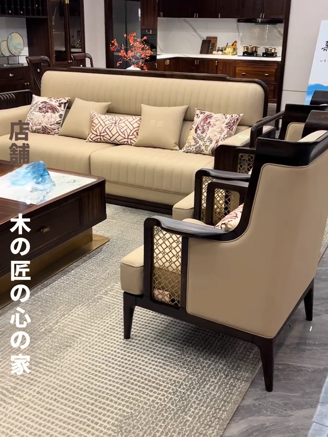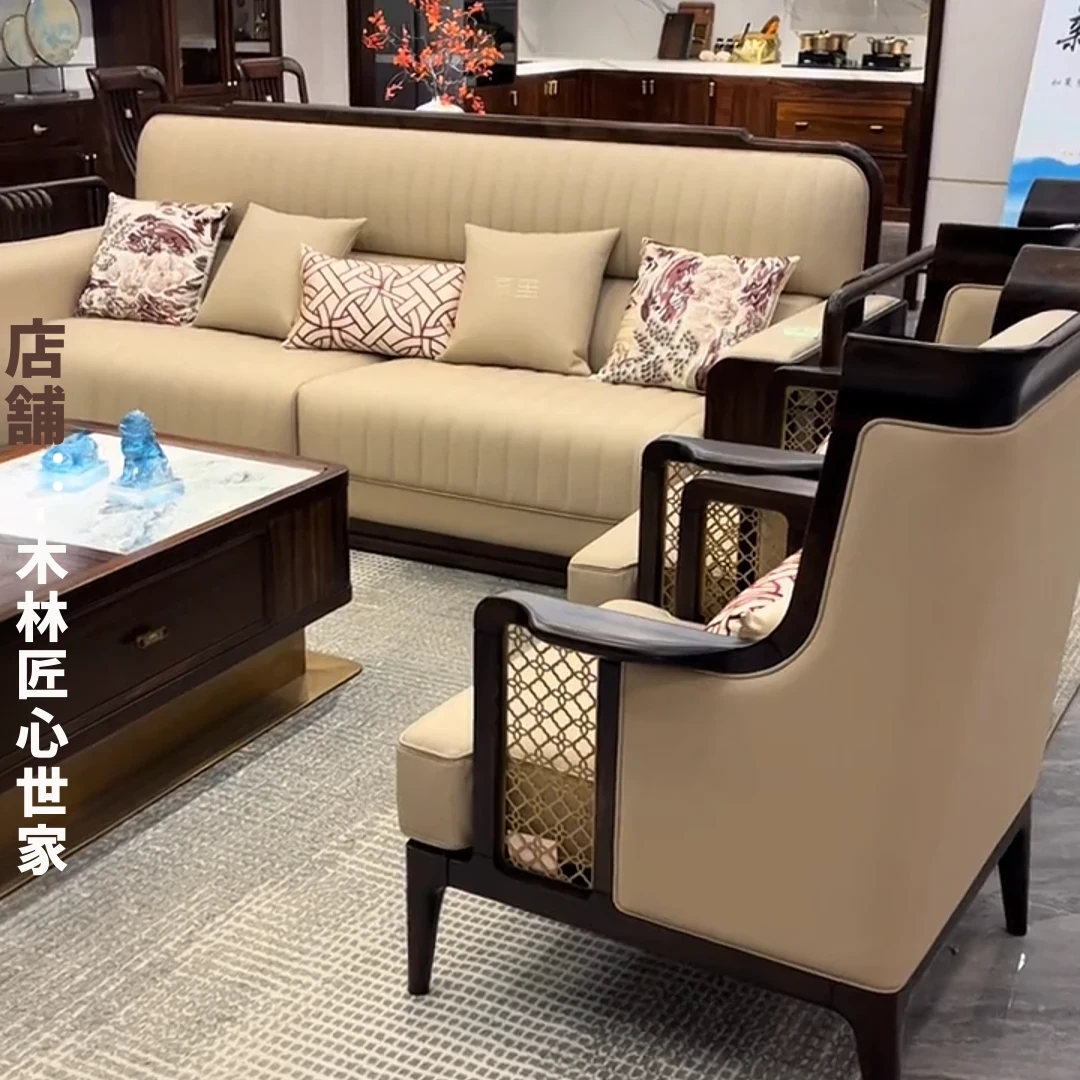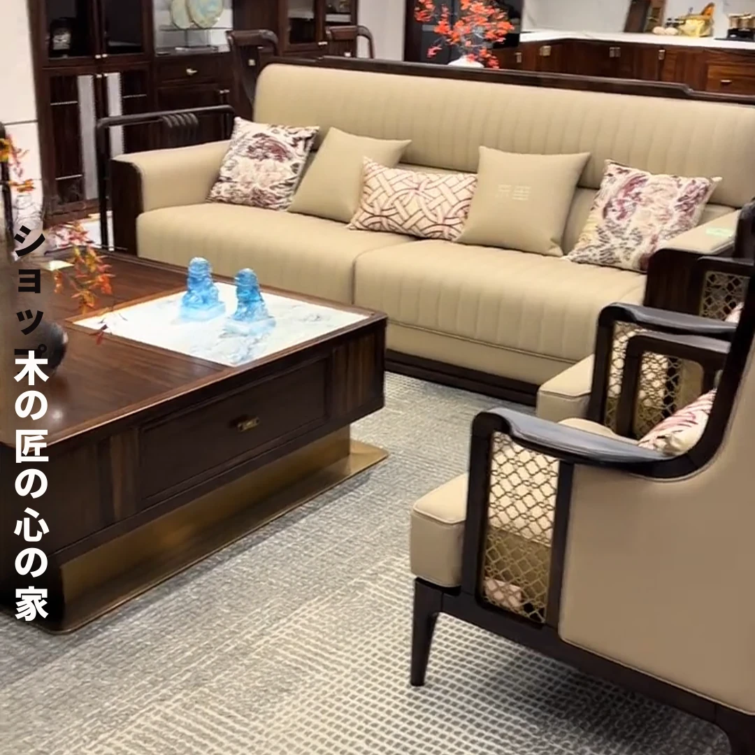 新中式スタイルの本格的な無垢材ソファセット - モダンでラグジュアリーなウッド&レザーの組み合わせ、大小様々な住宅や別荘のリビングにもぴったりの高級家具!