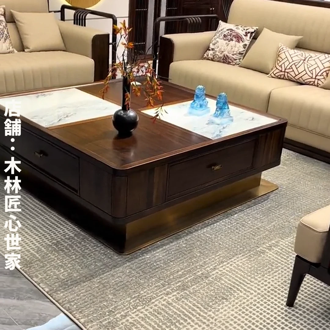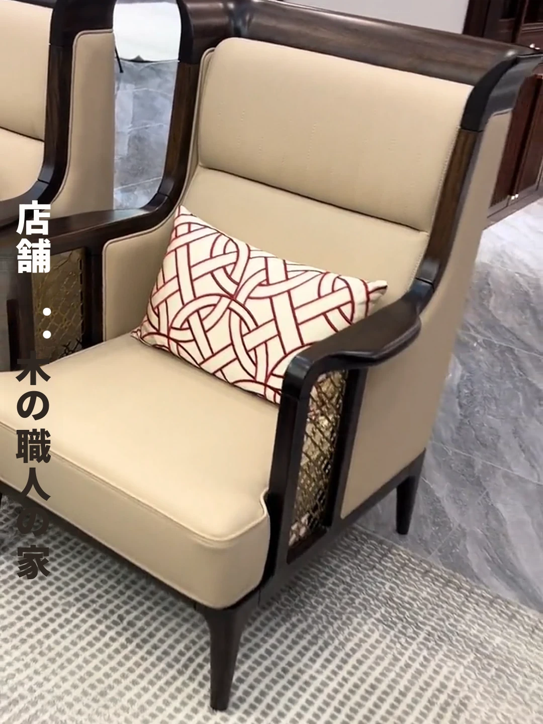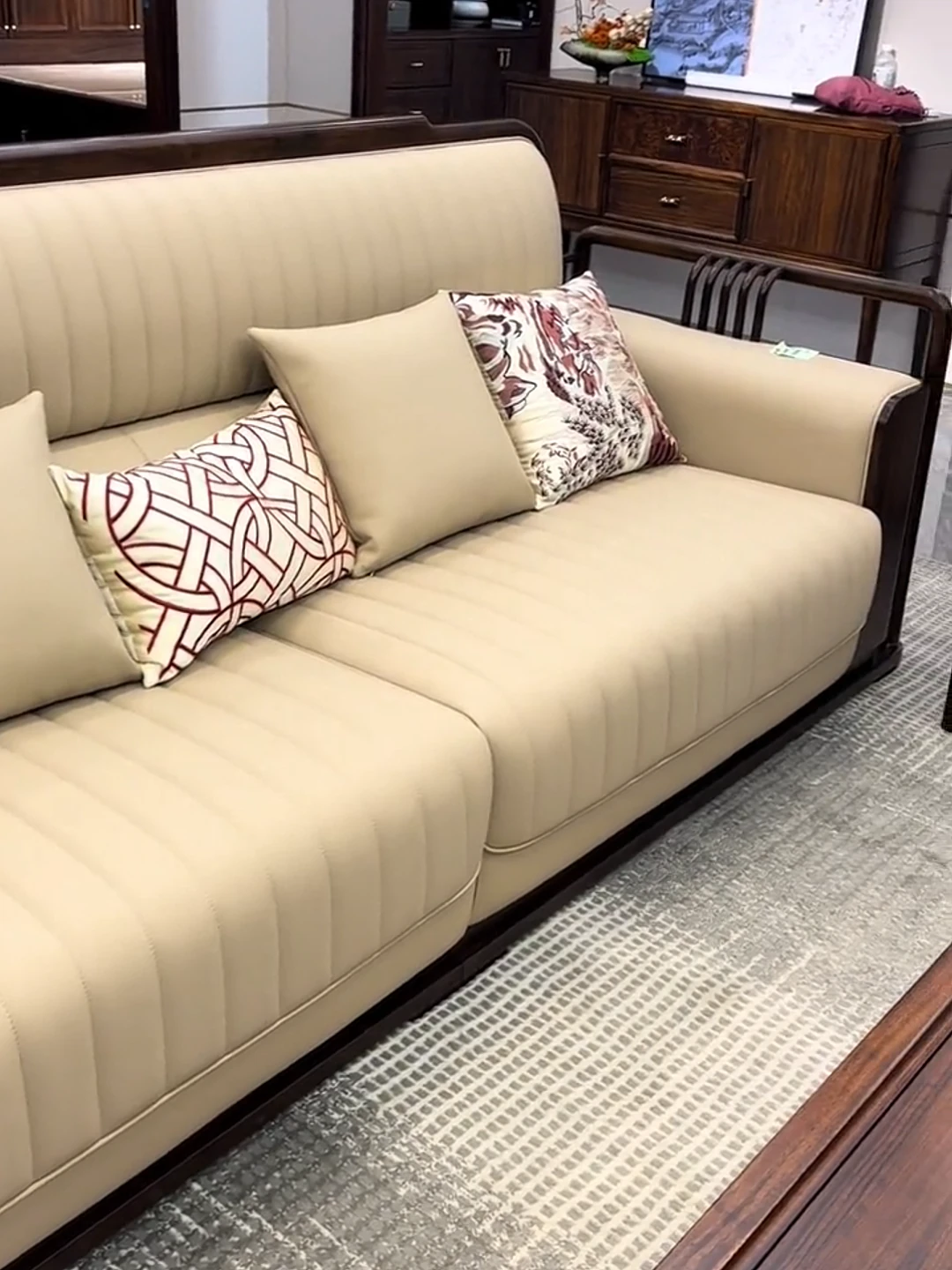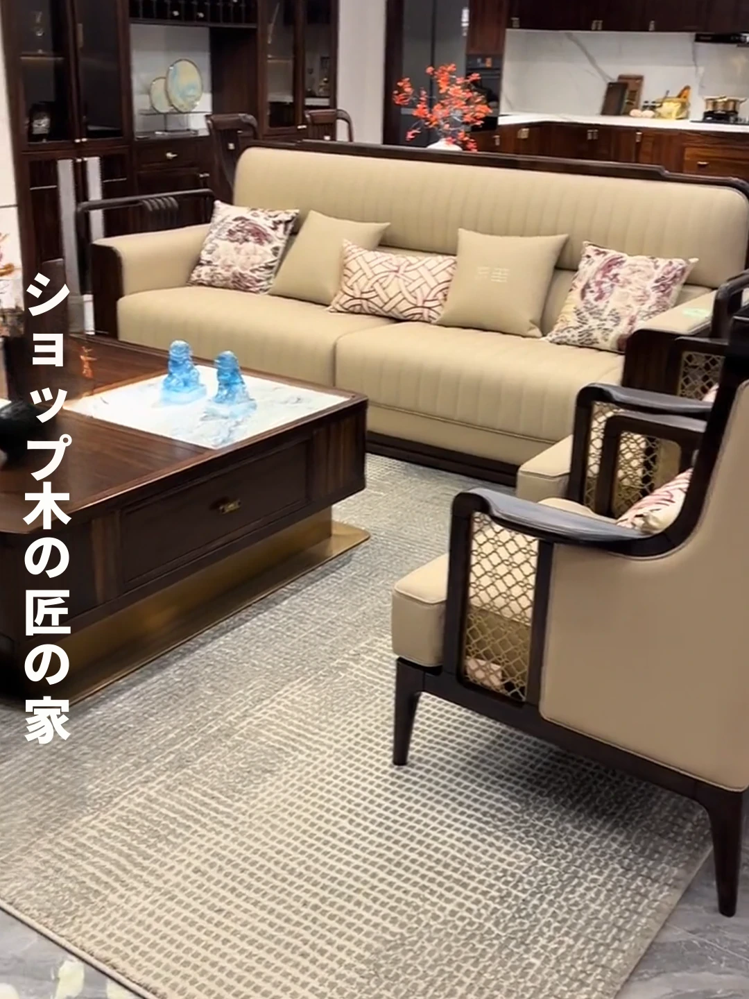 新中式スタイルの本格的な無垢材ソファセット - モダンでラグジュアリーなウッド&レザーの組み合わせ、大小様々な住宅や別荘のリビングにもぴったりの高級家具!