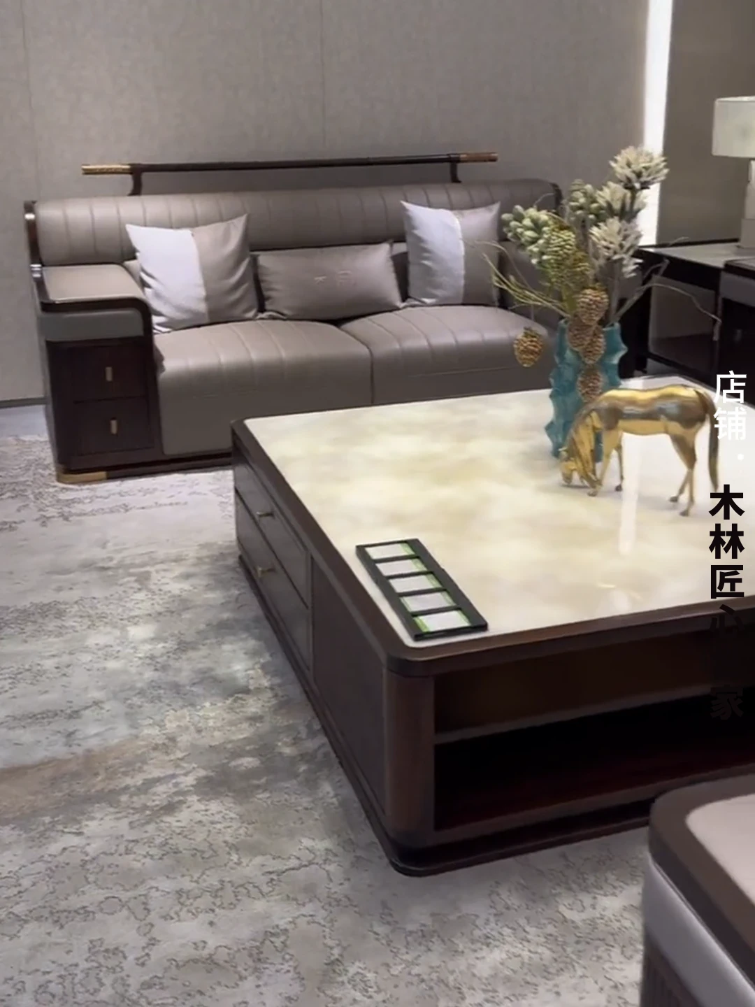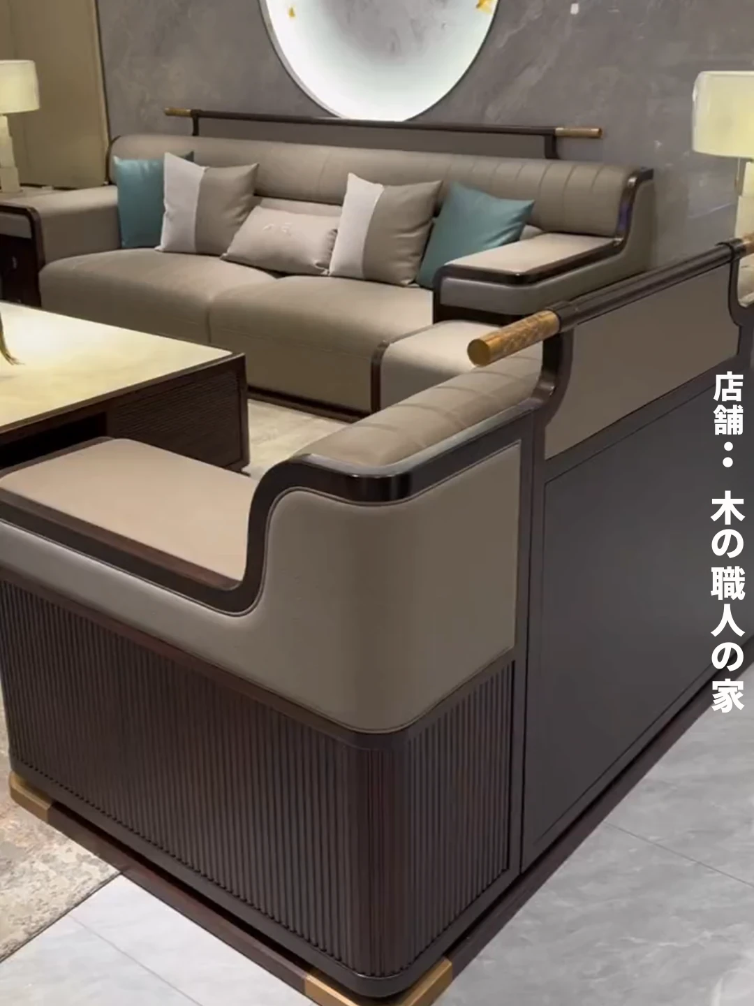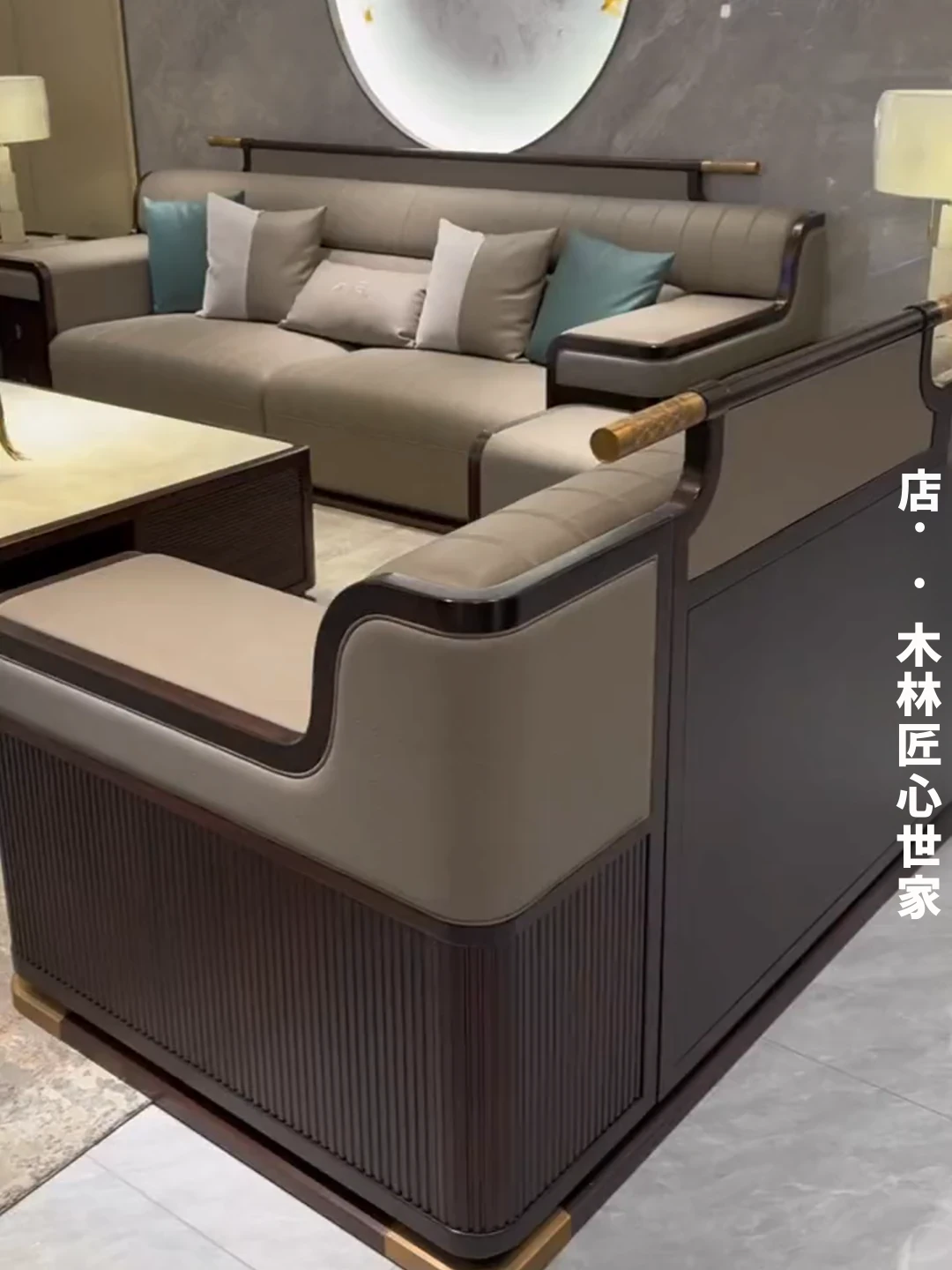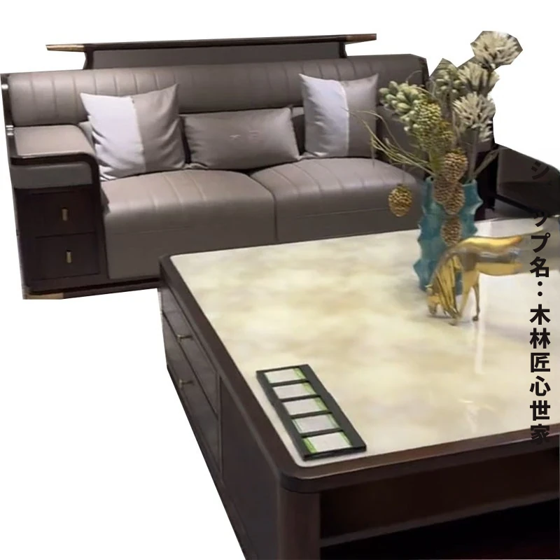新中式デザインのウッディブラックソファセット|現代的でラグジュアリーな大空間向け|モデルルームやホテルのリビングに最適|本格的な木材とレザー使用の高品質家具
