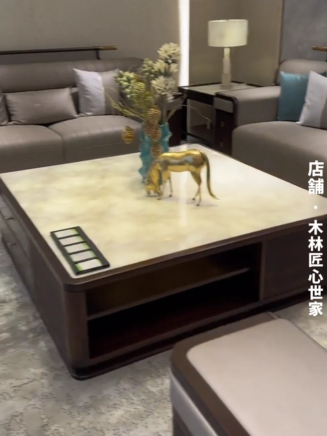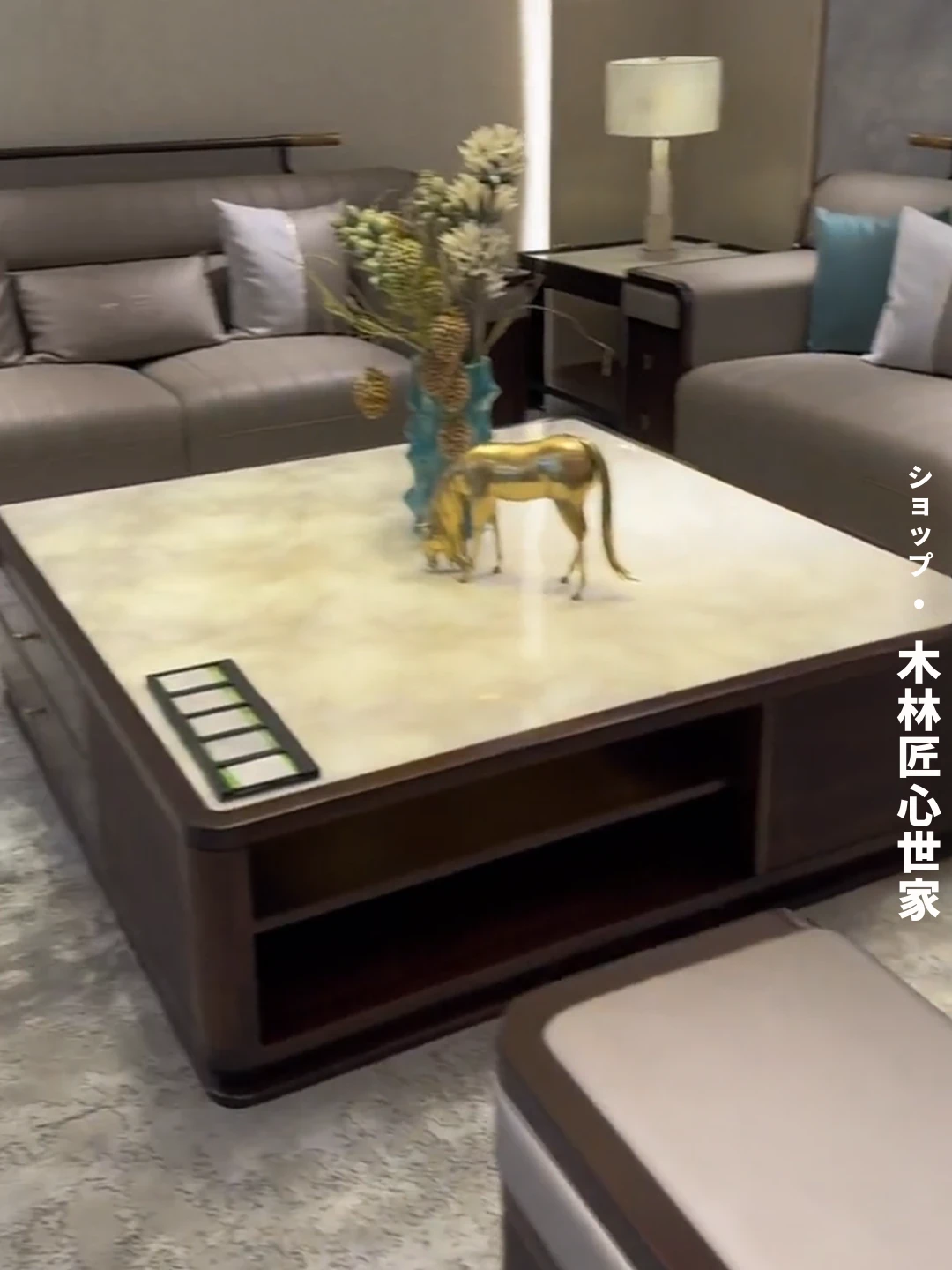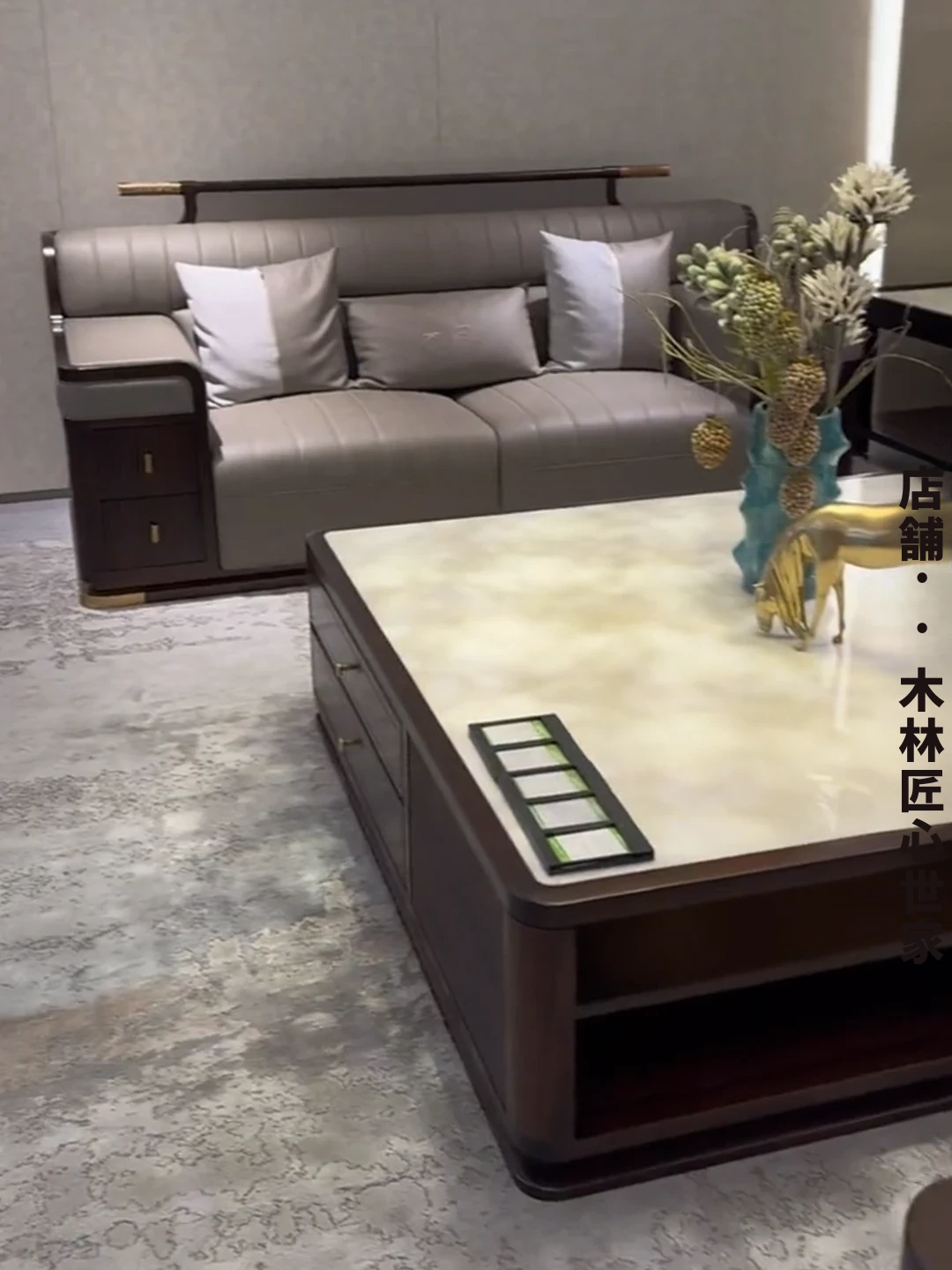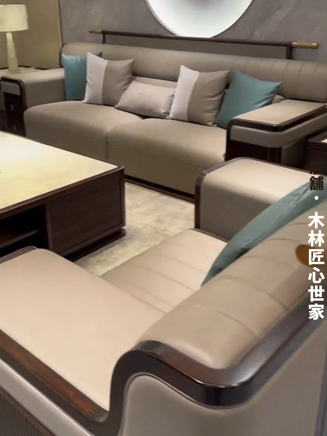 新中式デザインのウッディブラックソファセット|現代的でラグジュアリーな大空間向け|モデルルームやホテルのリビングに最適|本格的な木材とレザー使用の高品質家具