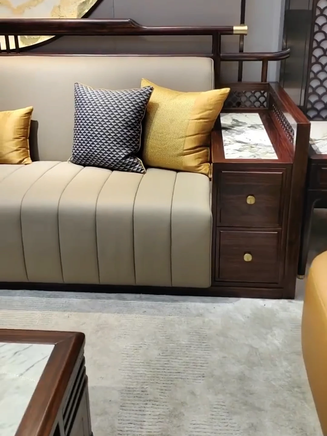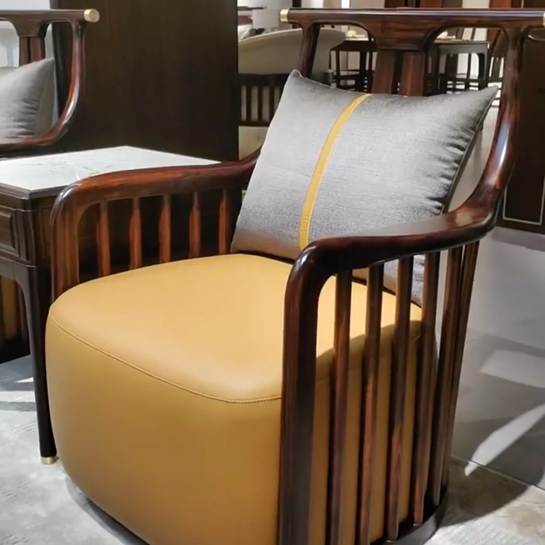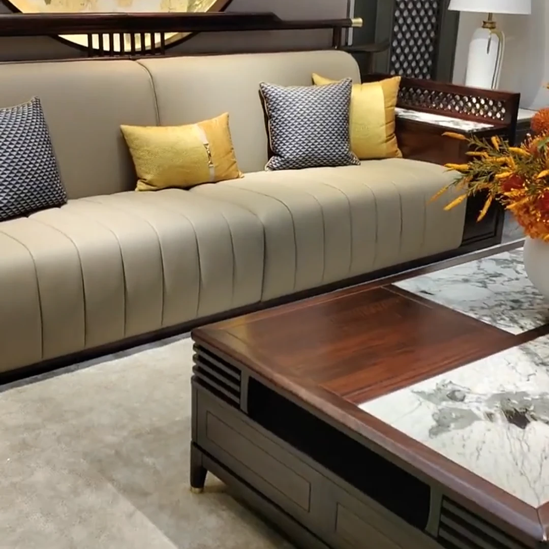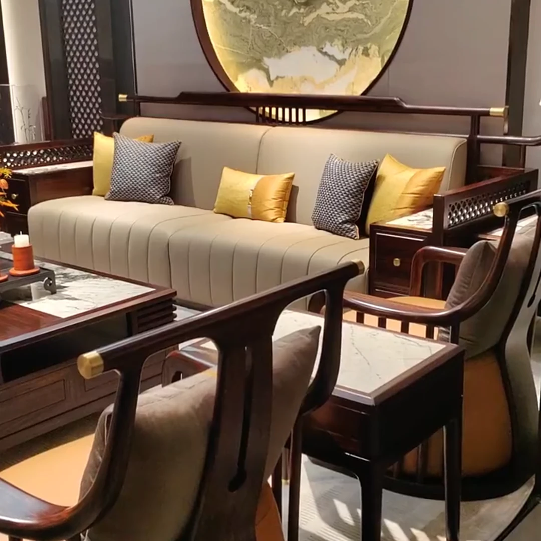 新しい中式ウ木製ソファとテーブルのセット - モダンでラグジュアリーな別荘のリビングにぴったり!本物の木材と高品質な本革を使用した、全実木の贅沢な家具。