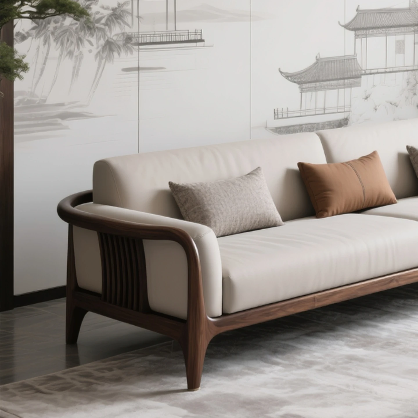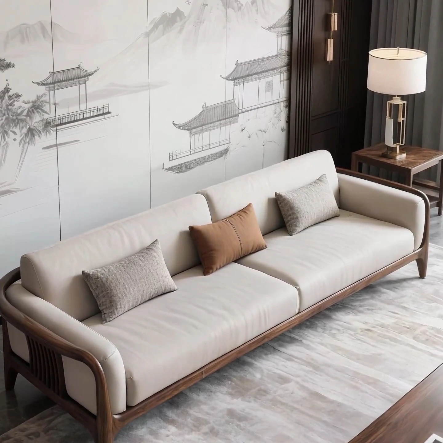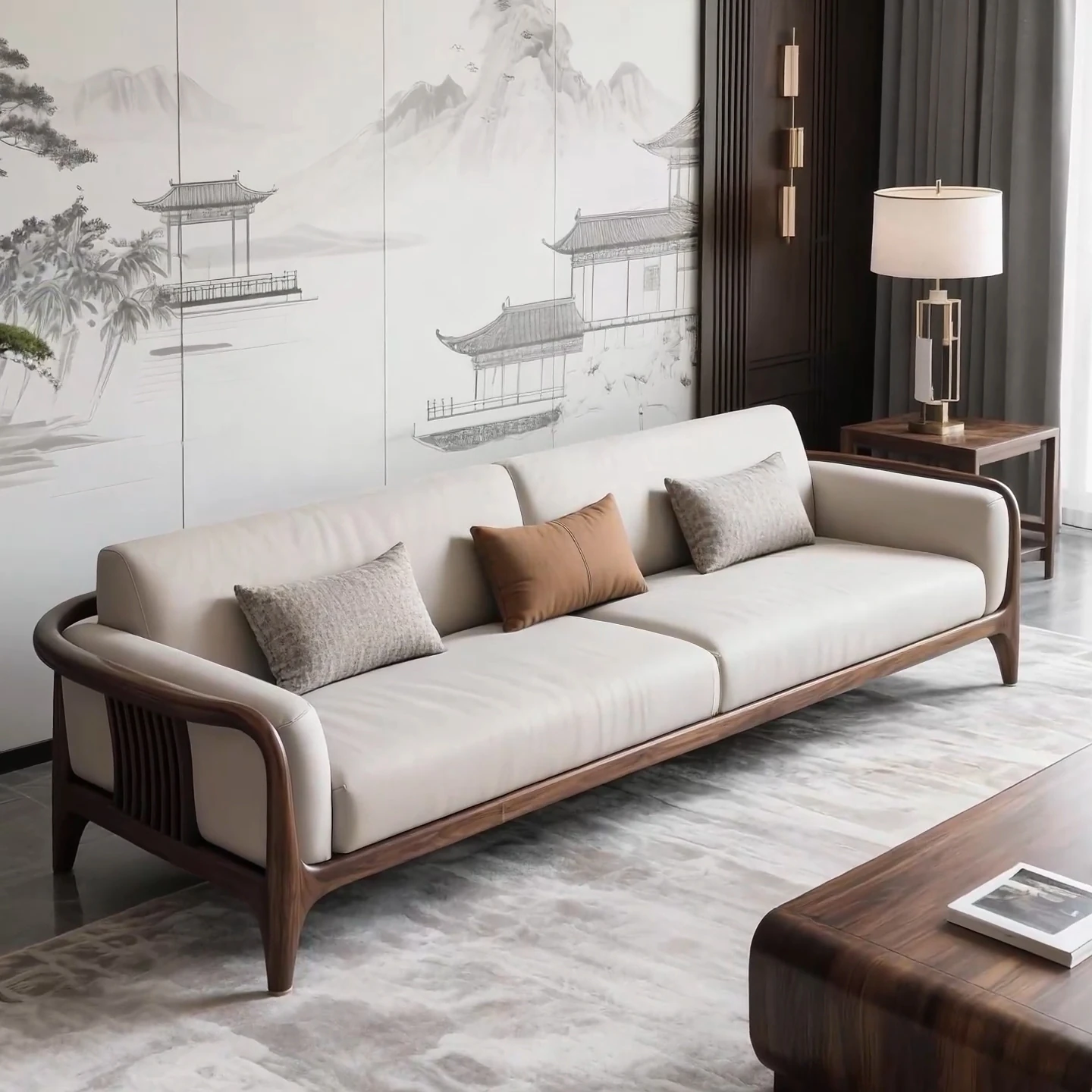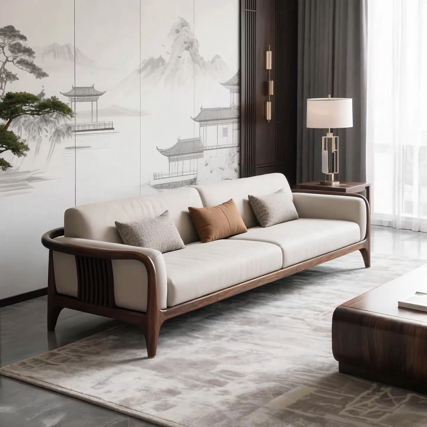 新中式スタイルの高級無垢材ソファ|北米産ブラックウォールナット使用|現代的な直列デザイン|シンプルで洗練された布製|3人掛けリビングソファで、居心地の良い空間を実現!