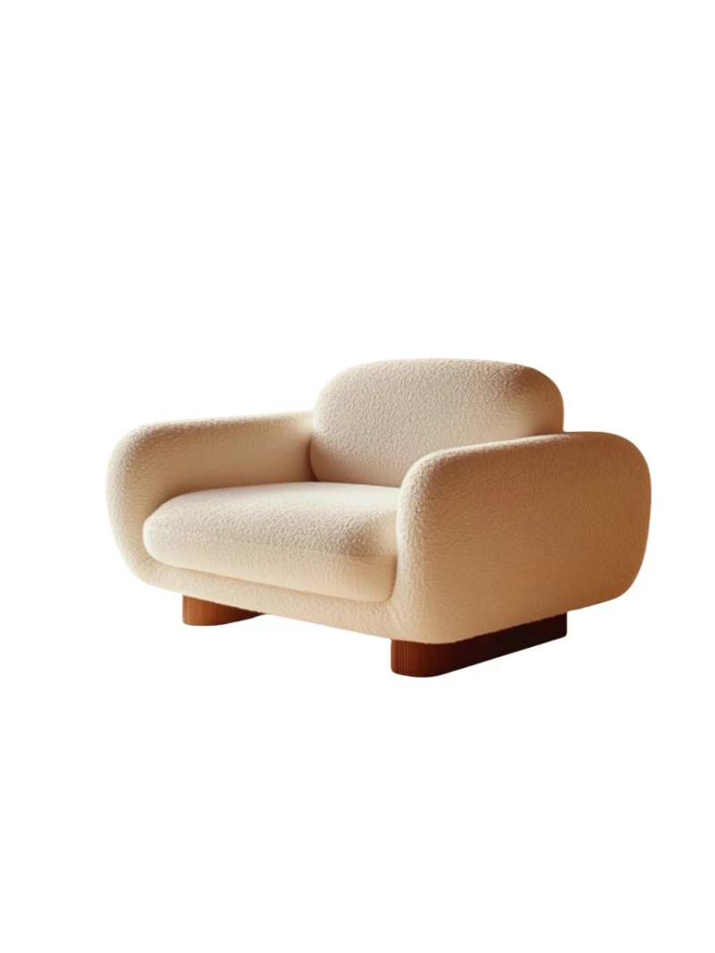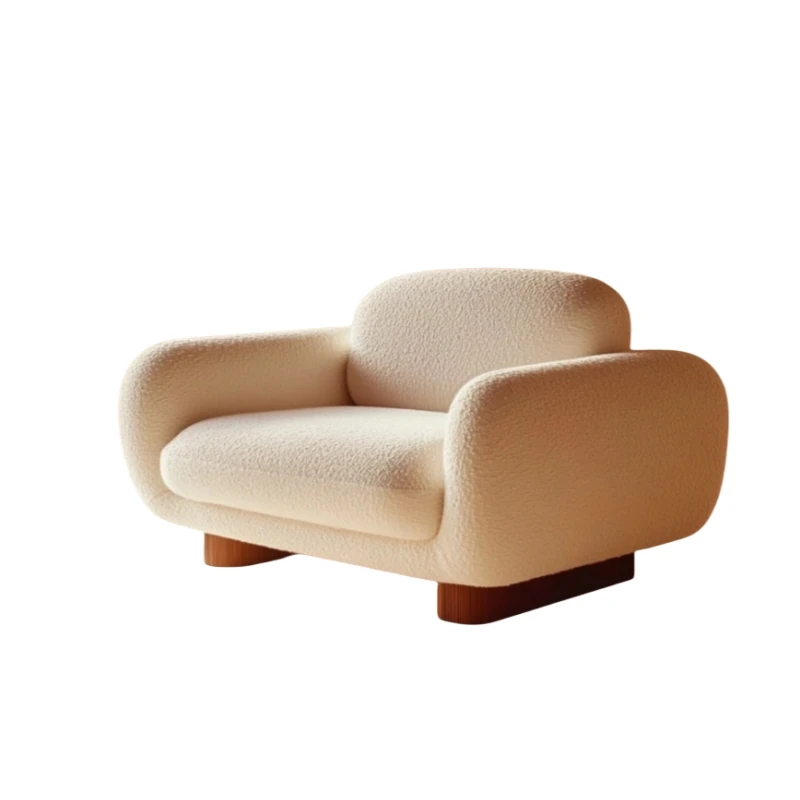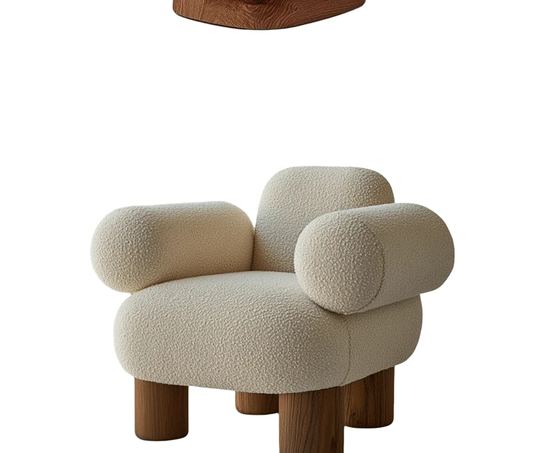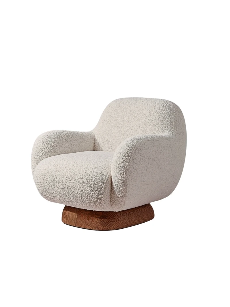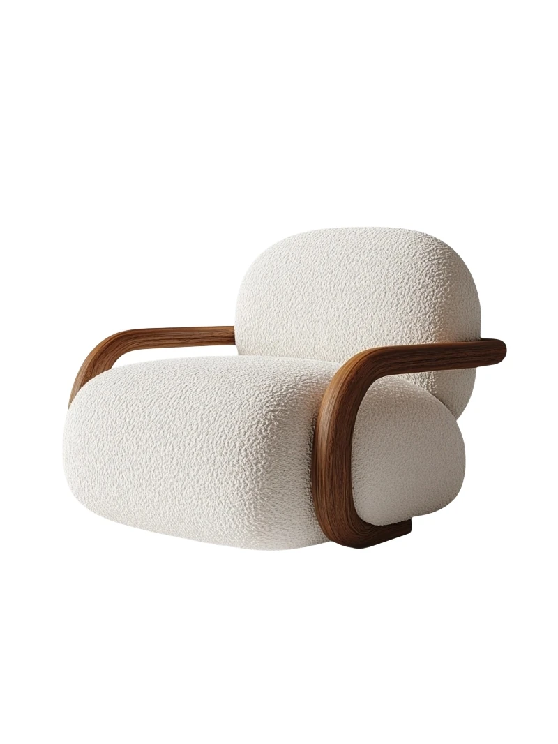 モダンでラグジュアリーな高級感あふれるリビング用1人掛けカジュアルソファ、ラムウール製のヴィンテージクリームカラー、人気デザイナーによる特別デザインです。おしゃれな空間を演出し、くつろぎのひとときを提供します。