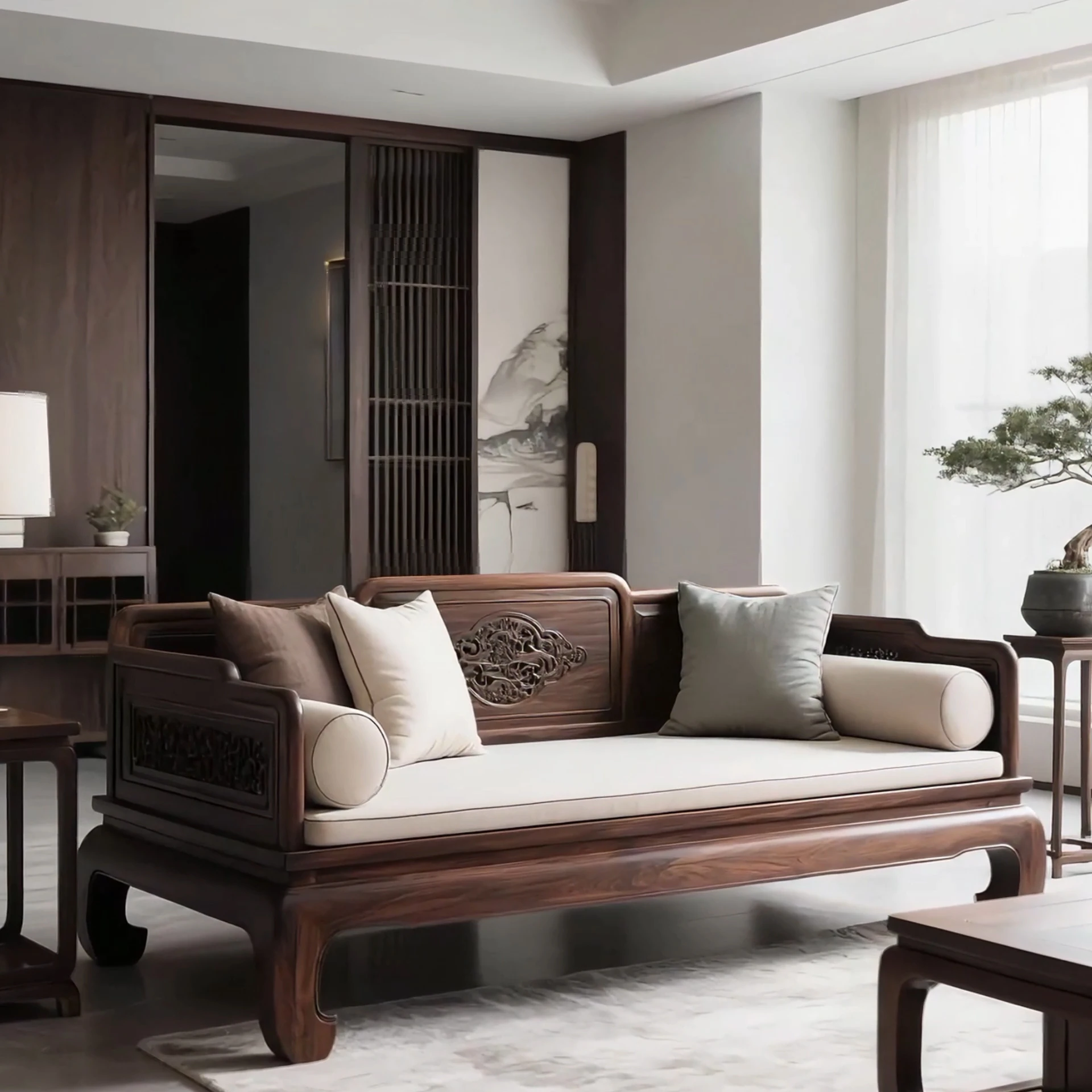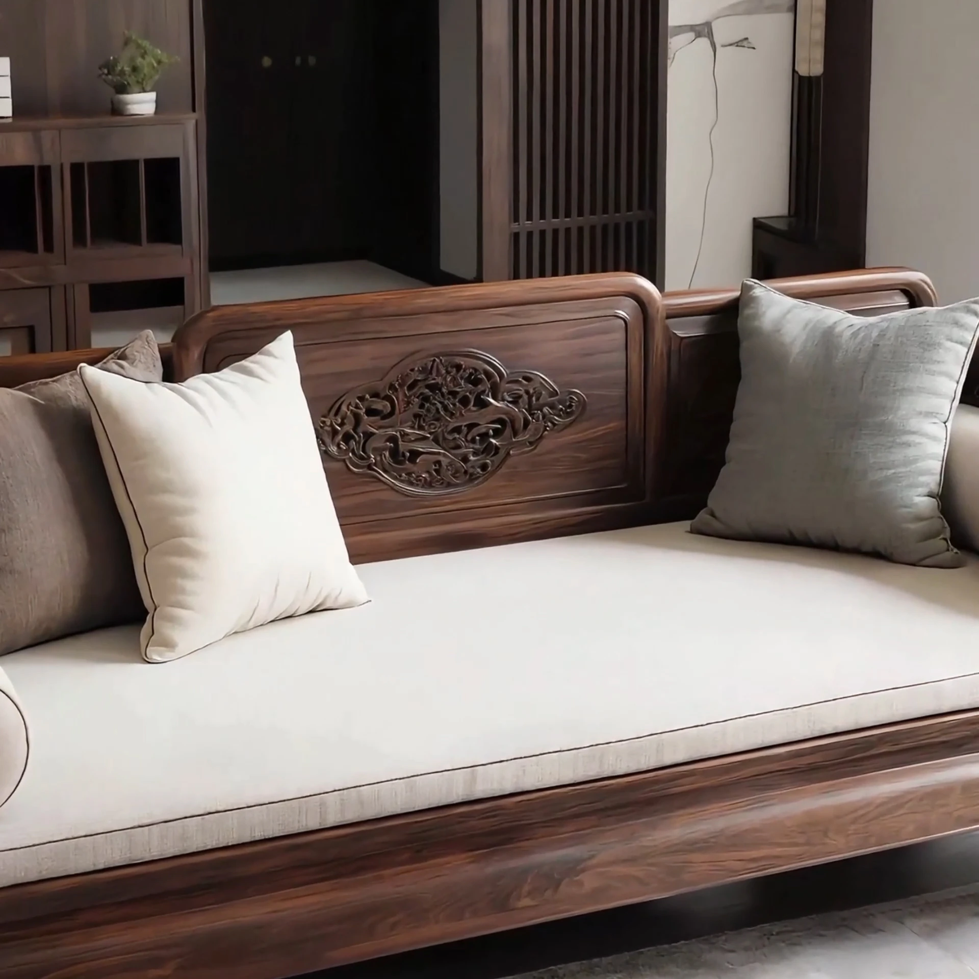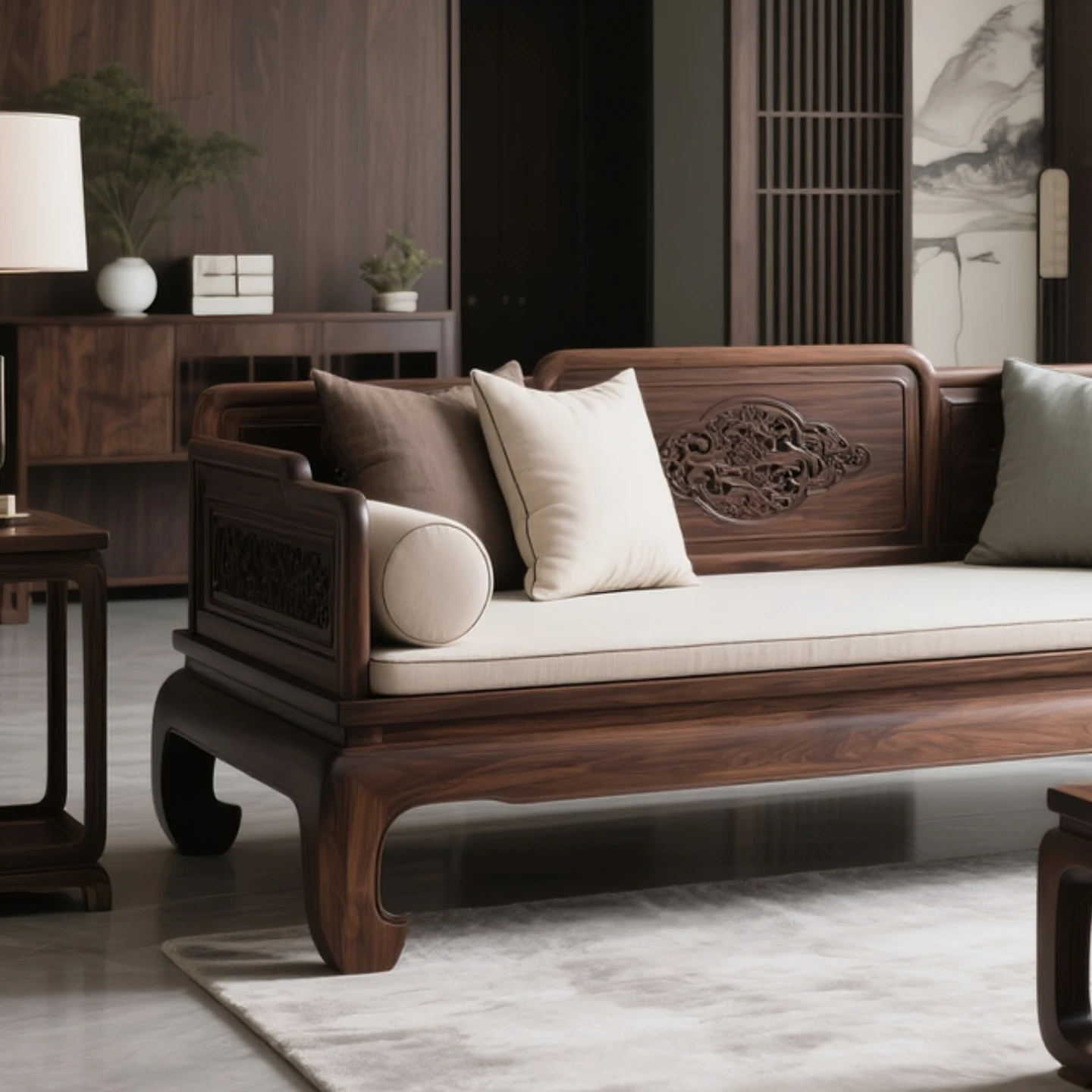 新中式デザインのローハンソファ、北米産ブラックウォールナット無垢材使用!禅の雰囲気漂う彫刻入りで、リビングや茶室にぴったり。大小さまざまな間取りに対応可能。心落ち着く空間を演出します。