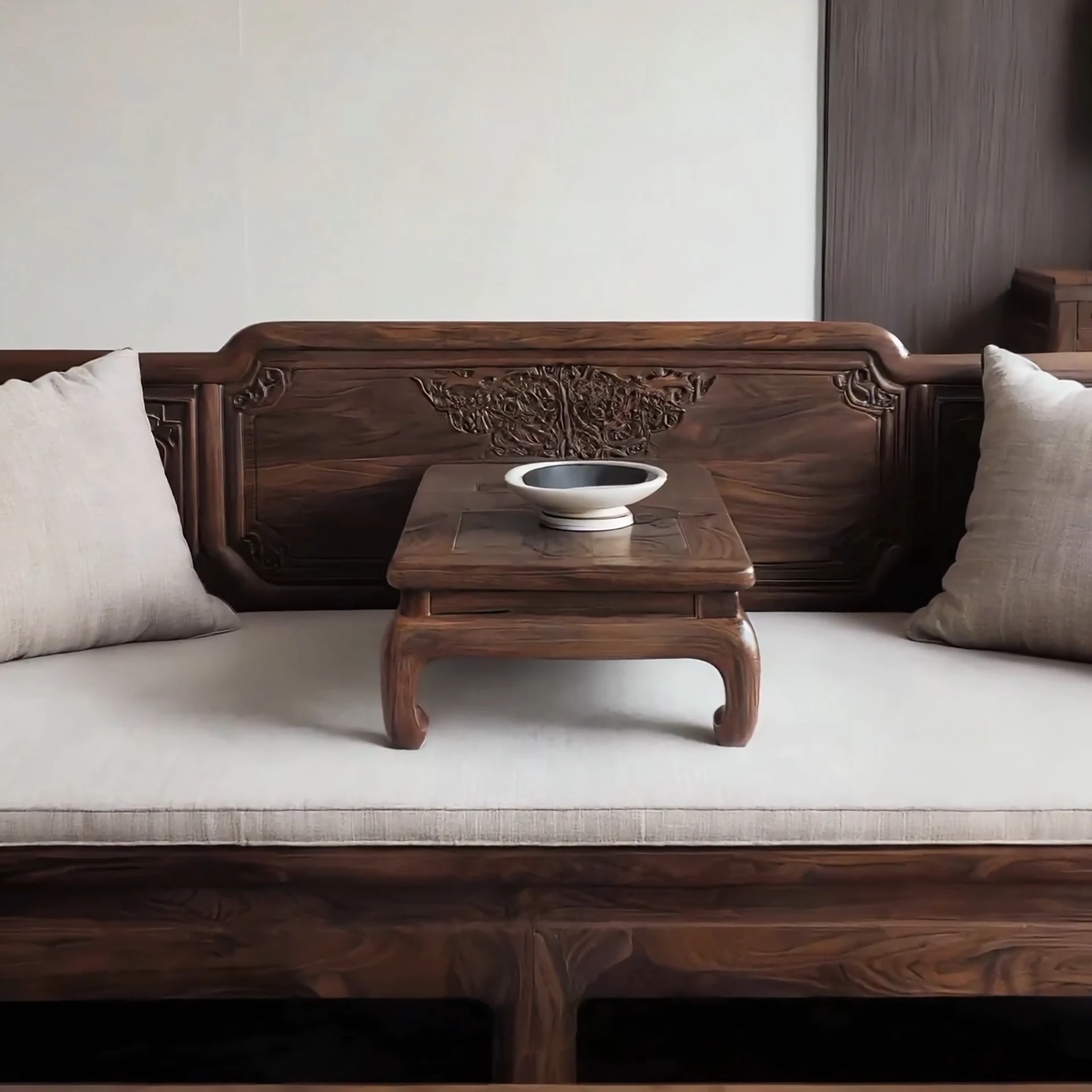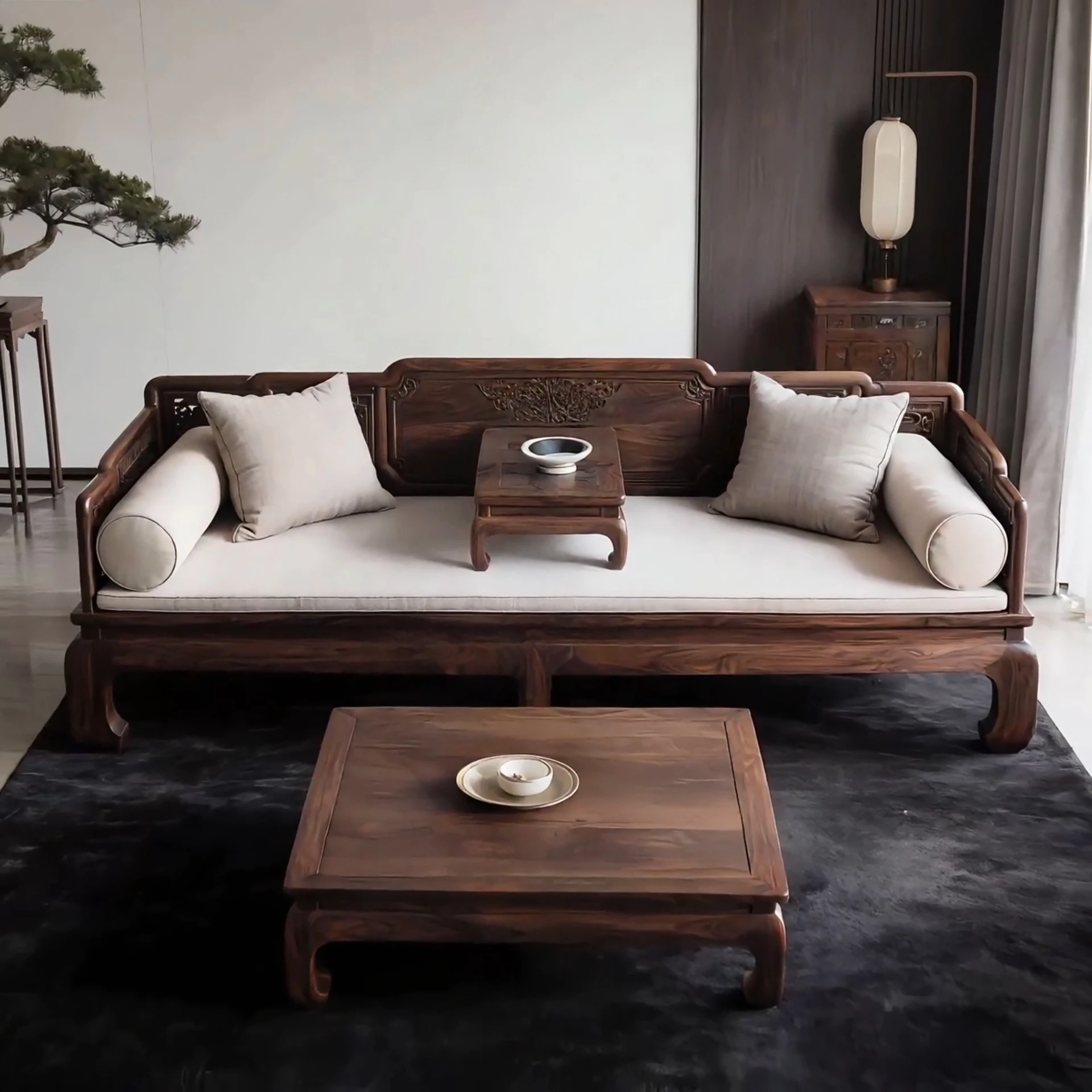 新中式デザインのローハンベッドソファ - 北米産ブラックウォールナット無垢材使用、禅の雰囲気漂う茶室やリビングに最適!彫刻が施された美しいデザインで、大小さまざまな部屋に対応。魅力的な居心地を提供します。