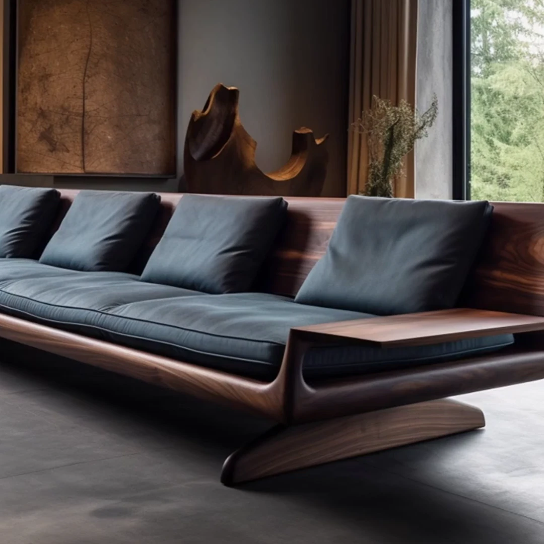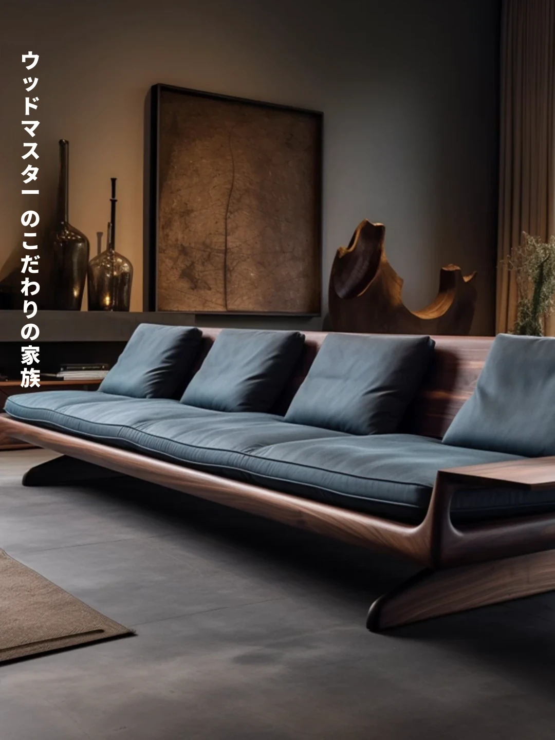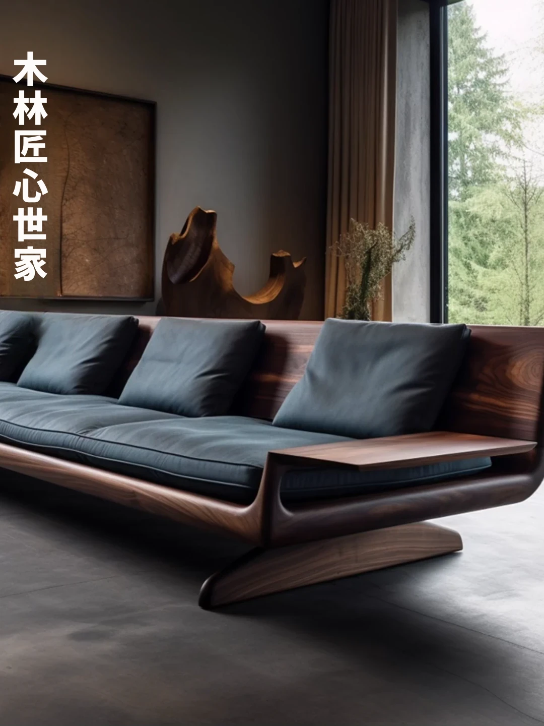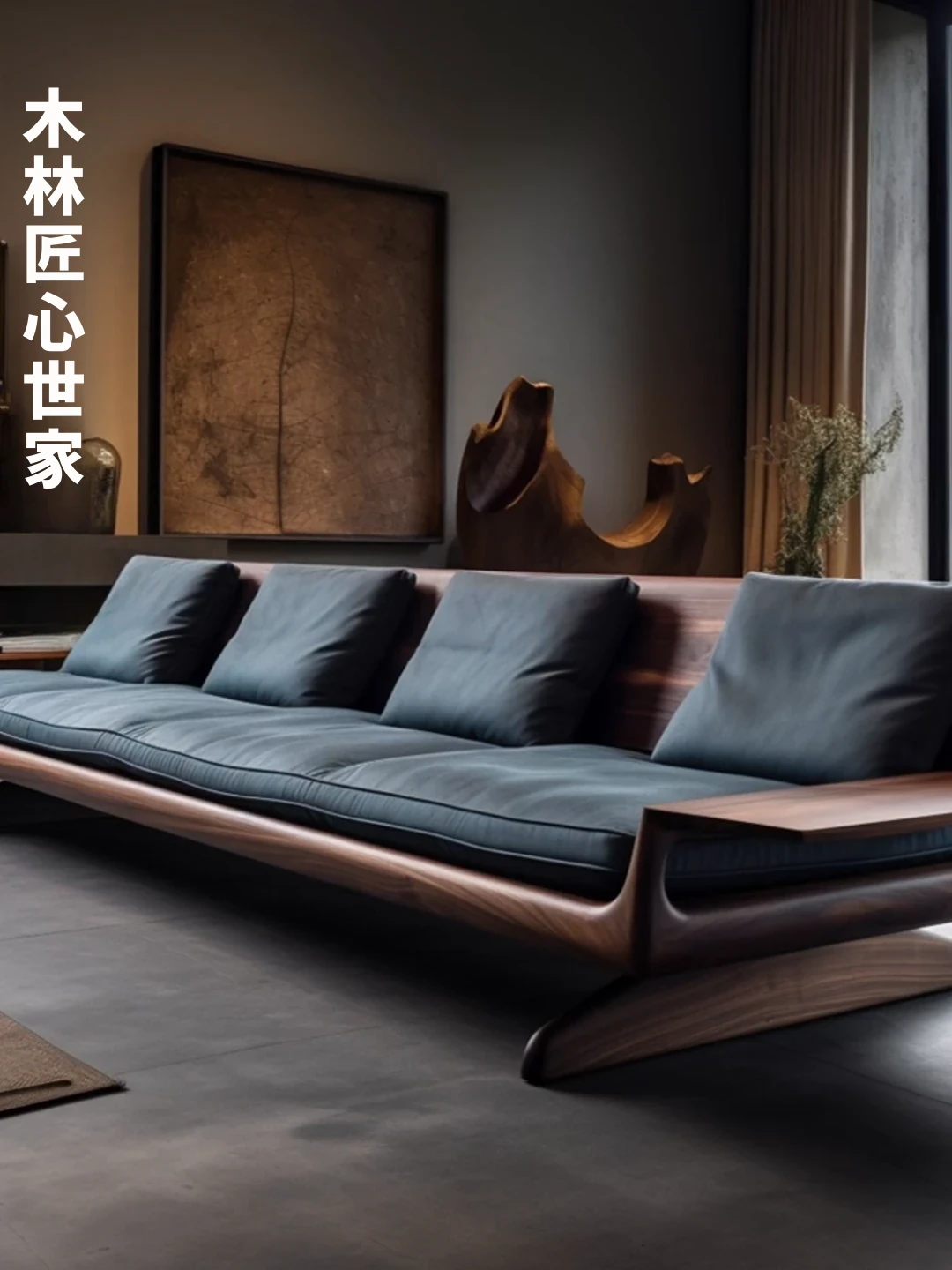 新中式デザインの北米産ブラックウォールナットソファ、シンプルでモダンなリビングに最適!高級感溢れるレザー仕上げ、スリムな直線デザインで3人掛けも楽々。別荘や高級住宅にぴったりな一品です!