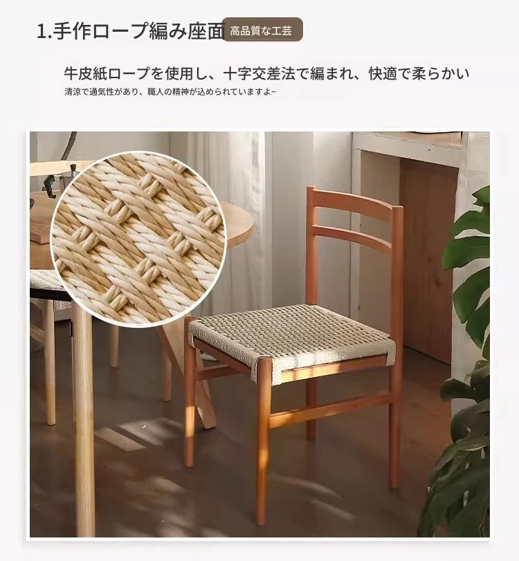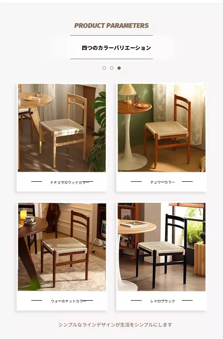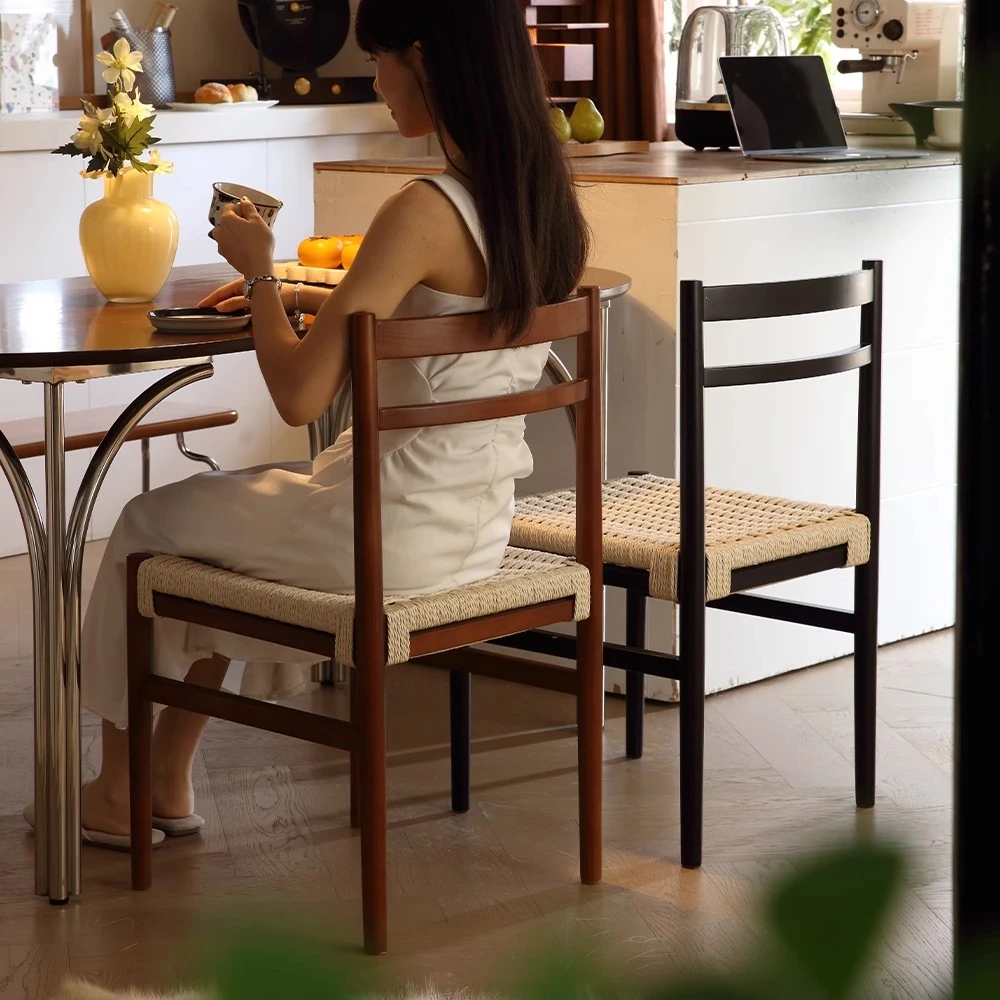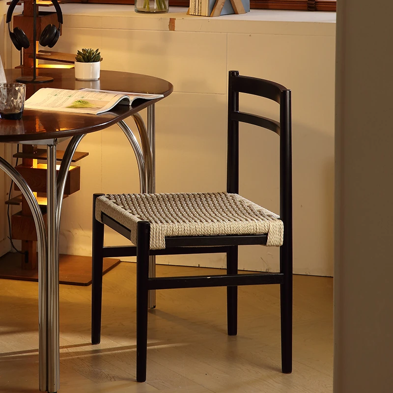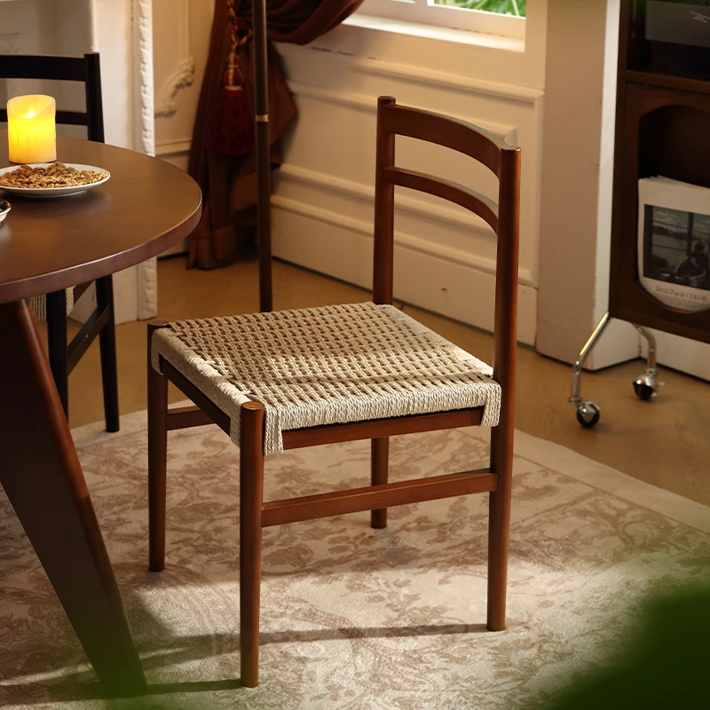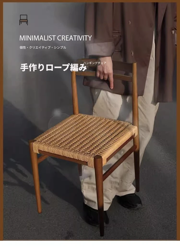 無垢材のロープ編みダイニングチェア、家庭用リラックス背もたれ椅子、デザイナーズリビング用ティーチェア、侘寂スタイルのウォールナットチェアで、心地よいひとときをお楽しみください!