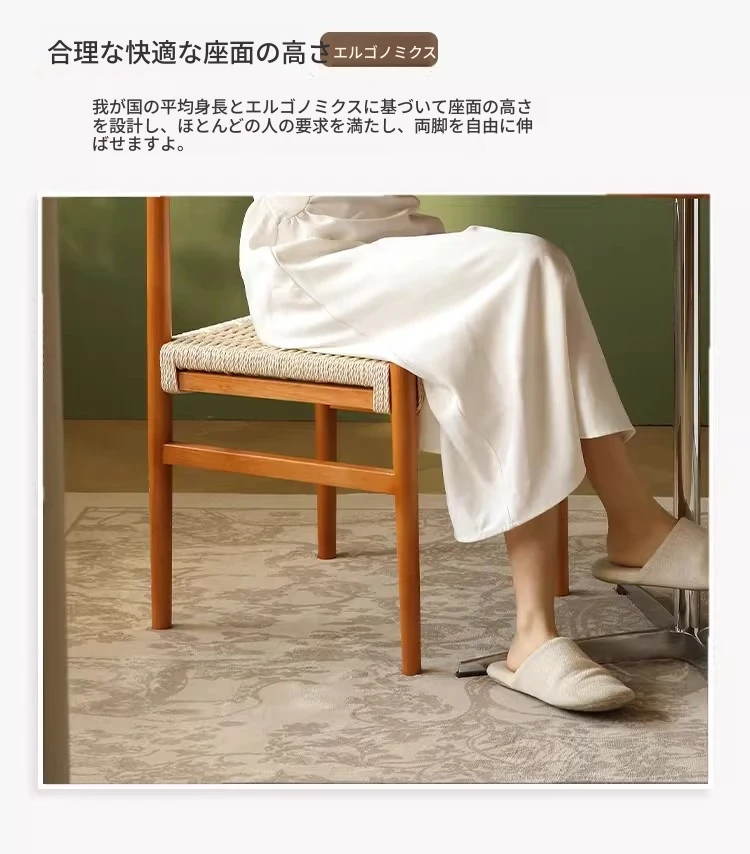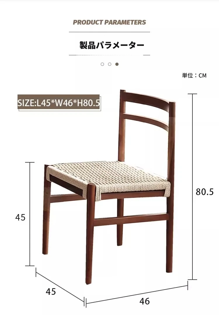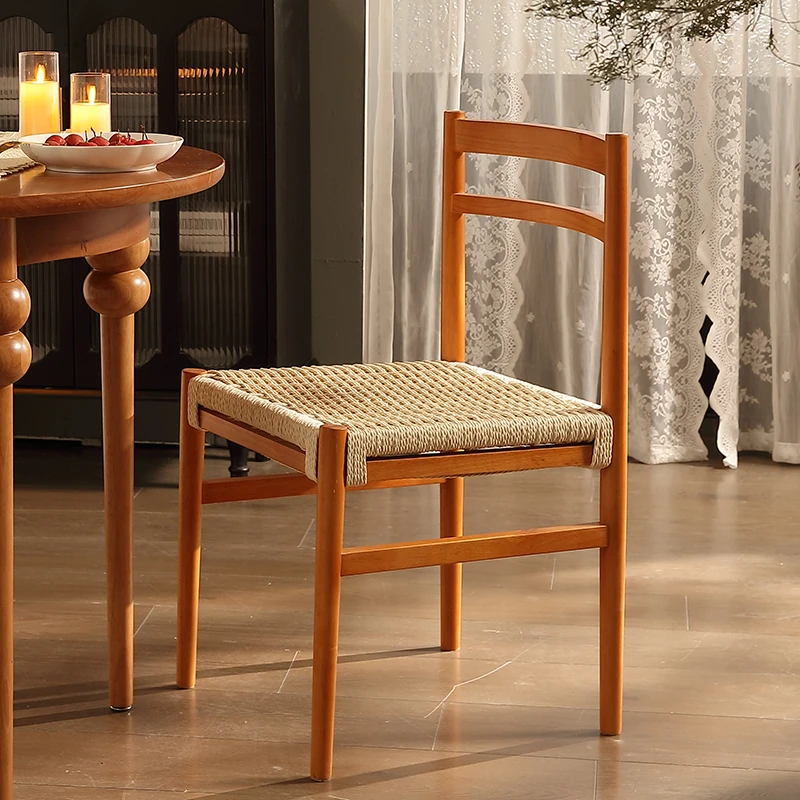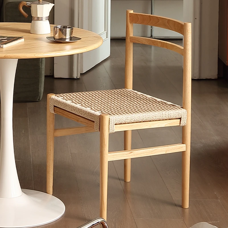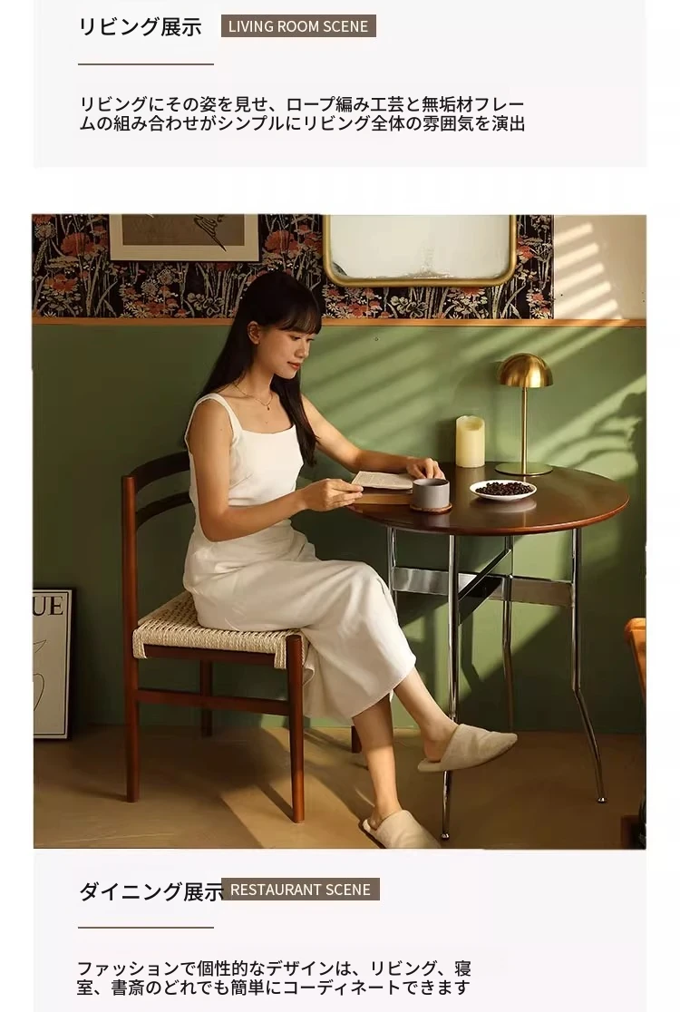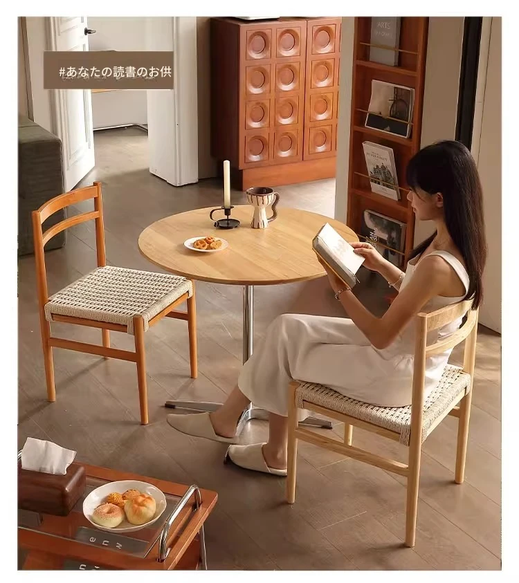 無垢材のロープ編みダイニングチェア、家庭用リラックス背もたれ椅子、デザイナーズリビング用ティーチェア、侘寂スタイルのウォールナットチェアで、心地よいひとときをお楽しみください!