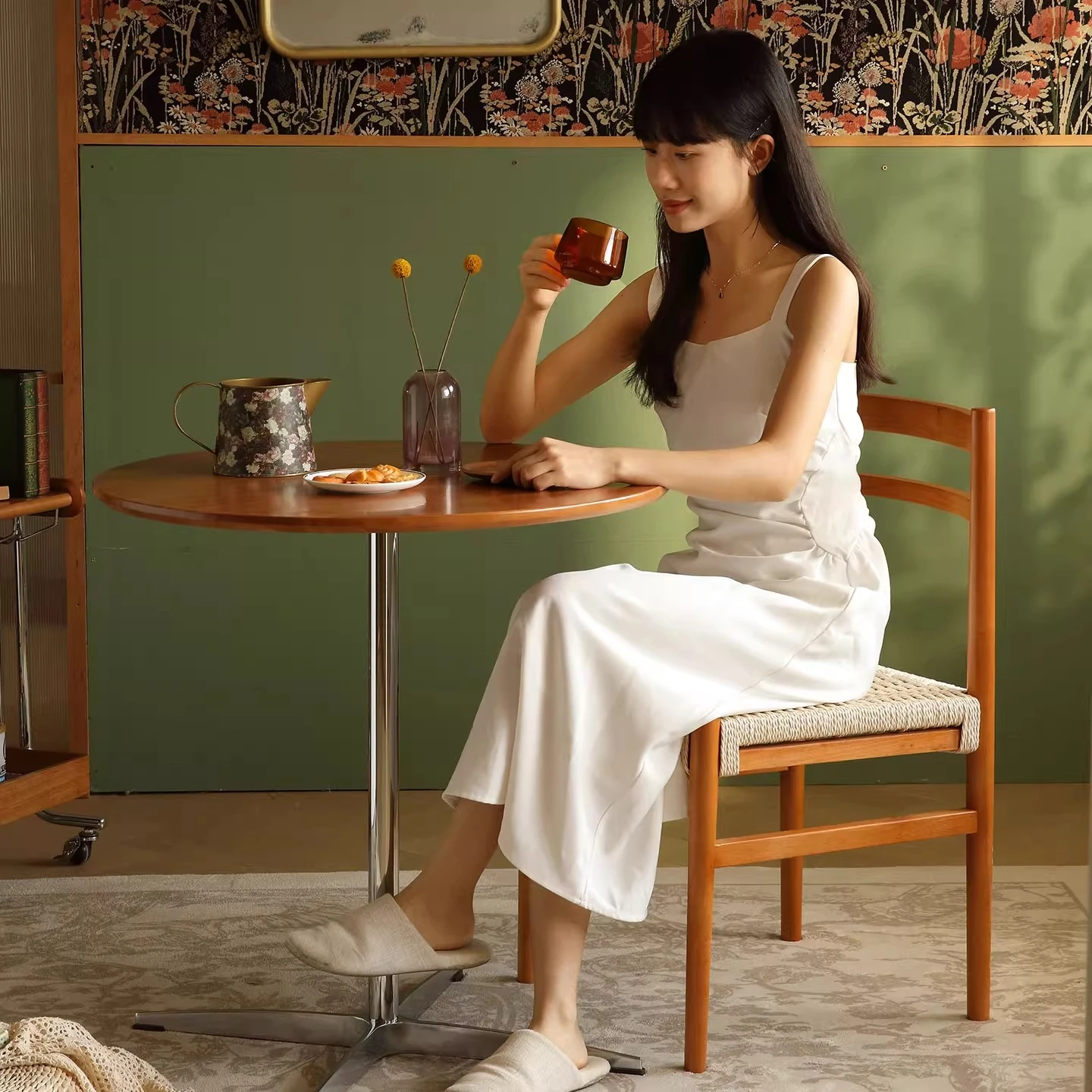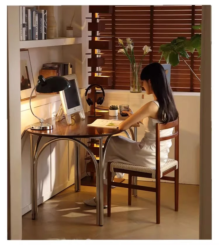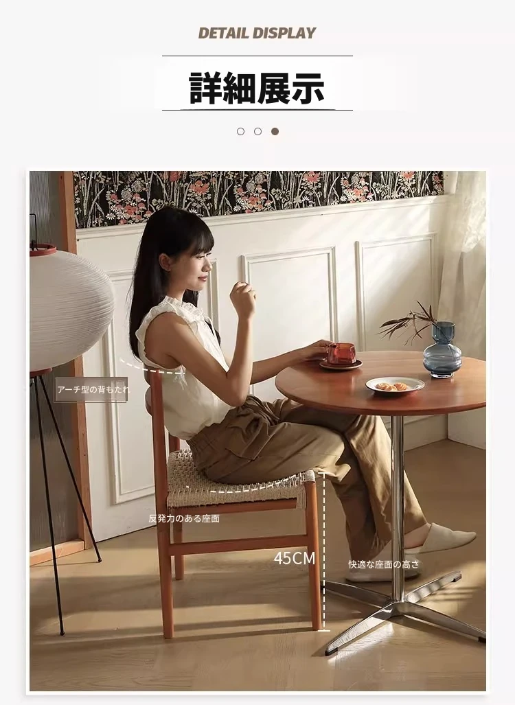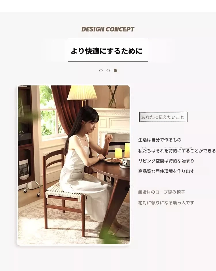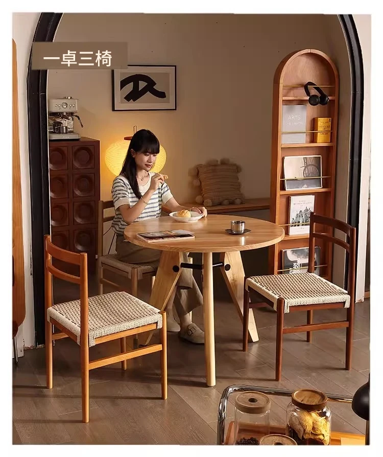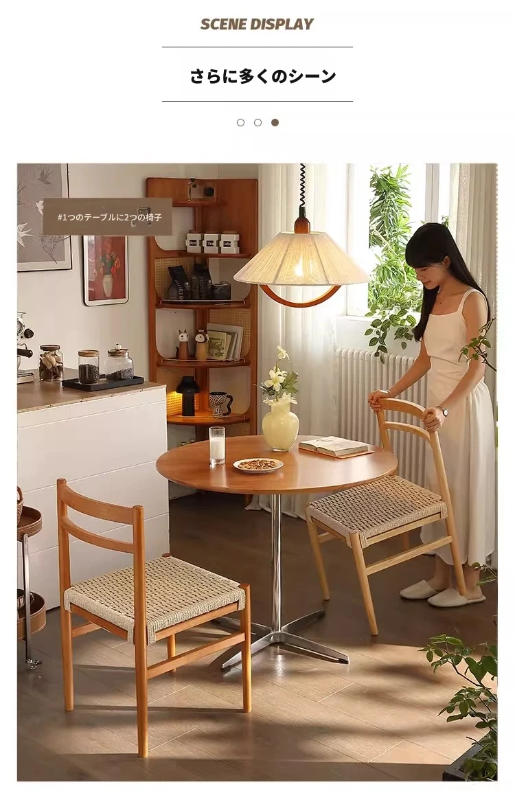 無垢材のロープ編みダイニングチェア、家庭用リラックス背もたれ椅子、デザイナーズリビング用ティーチェア、侘寂スタイルのウォールナットチェアで、心地よいひとときをお楽しみください!