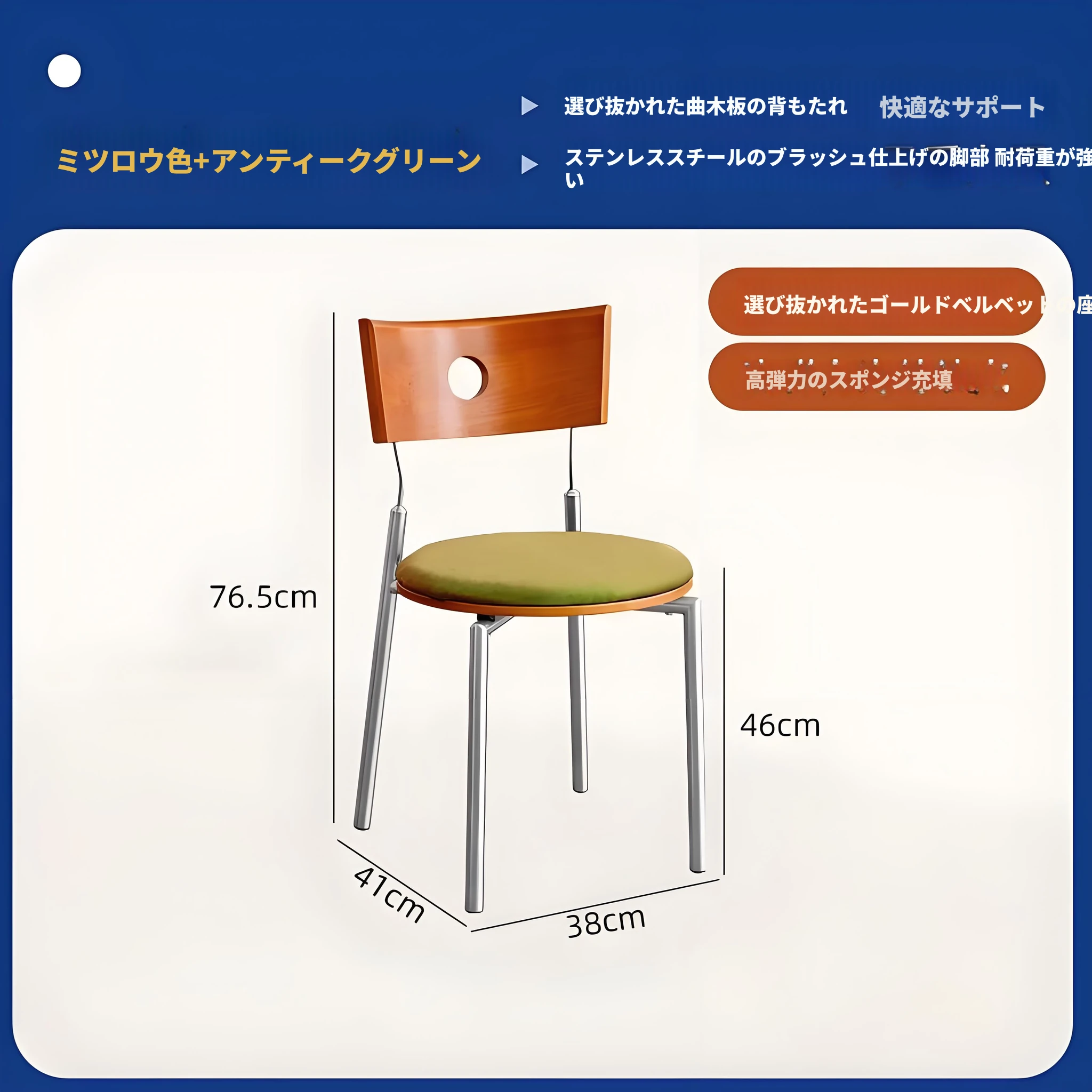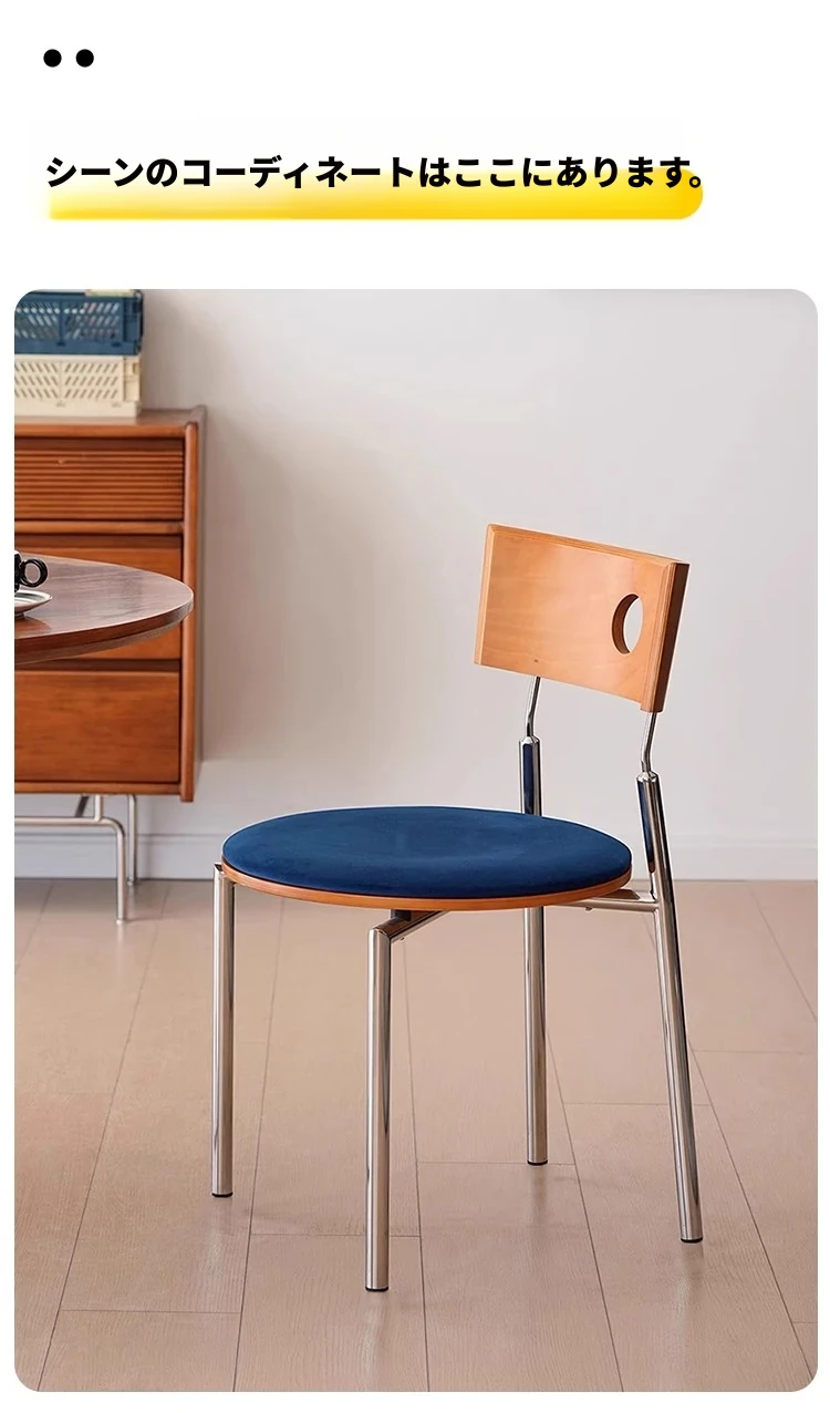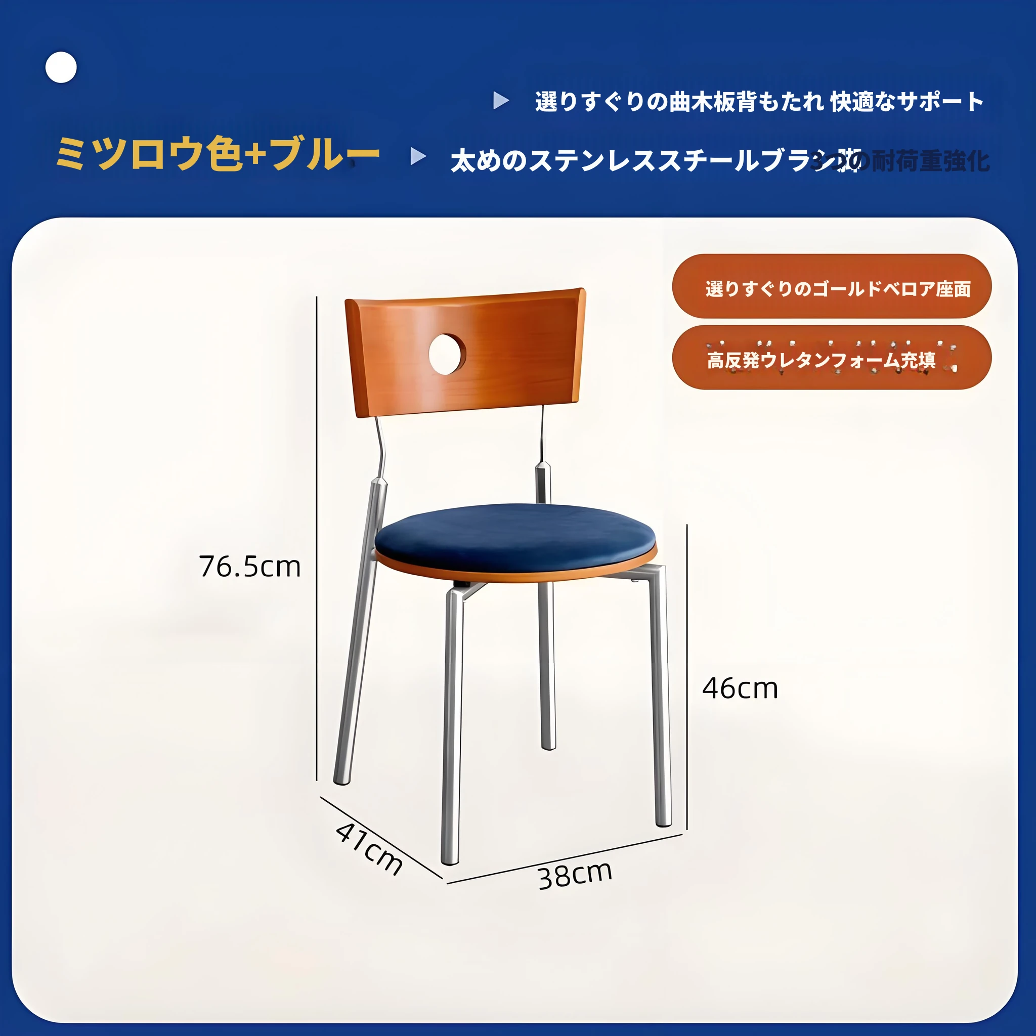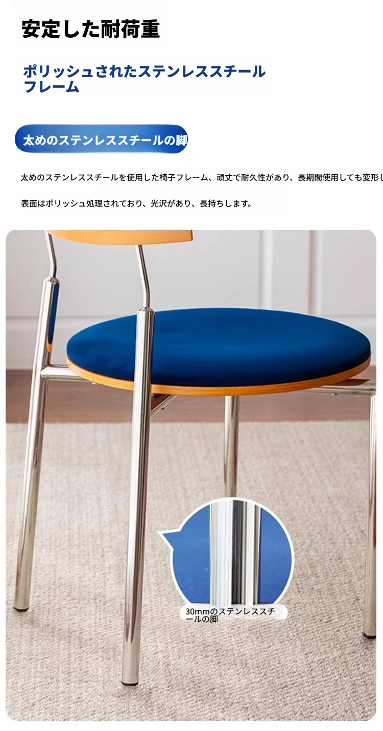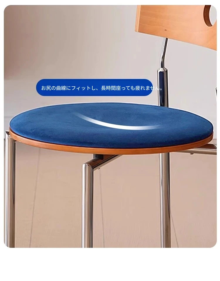 蜜ろう色の背もたれ+蜜ろう座板+青色のベロアクッション【ステンレス脚】素材に異臭なし【バイヤー募集】