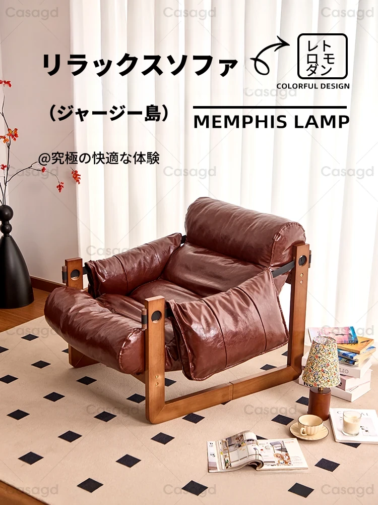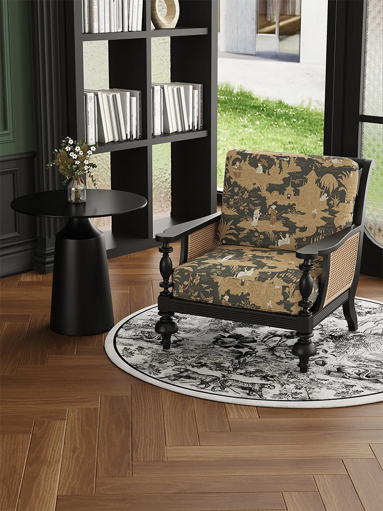 侘寂スタイルの無垢材アームチェア|ヴィンテージ感あふれるリビング用ファブリックソファチェア|バルコニーや読書に最適なシンプルでおしゃれな単独椅子|民宿やホテルのリラックススペースにぴったり!