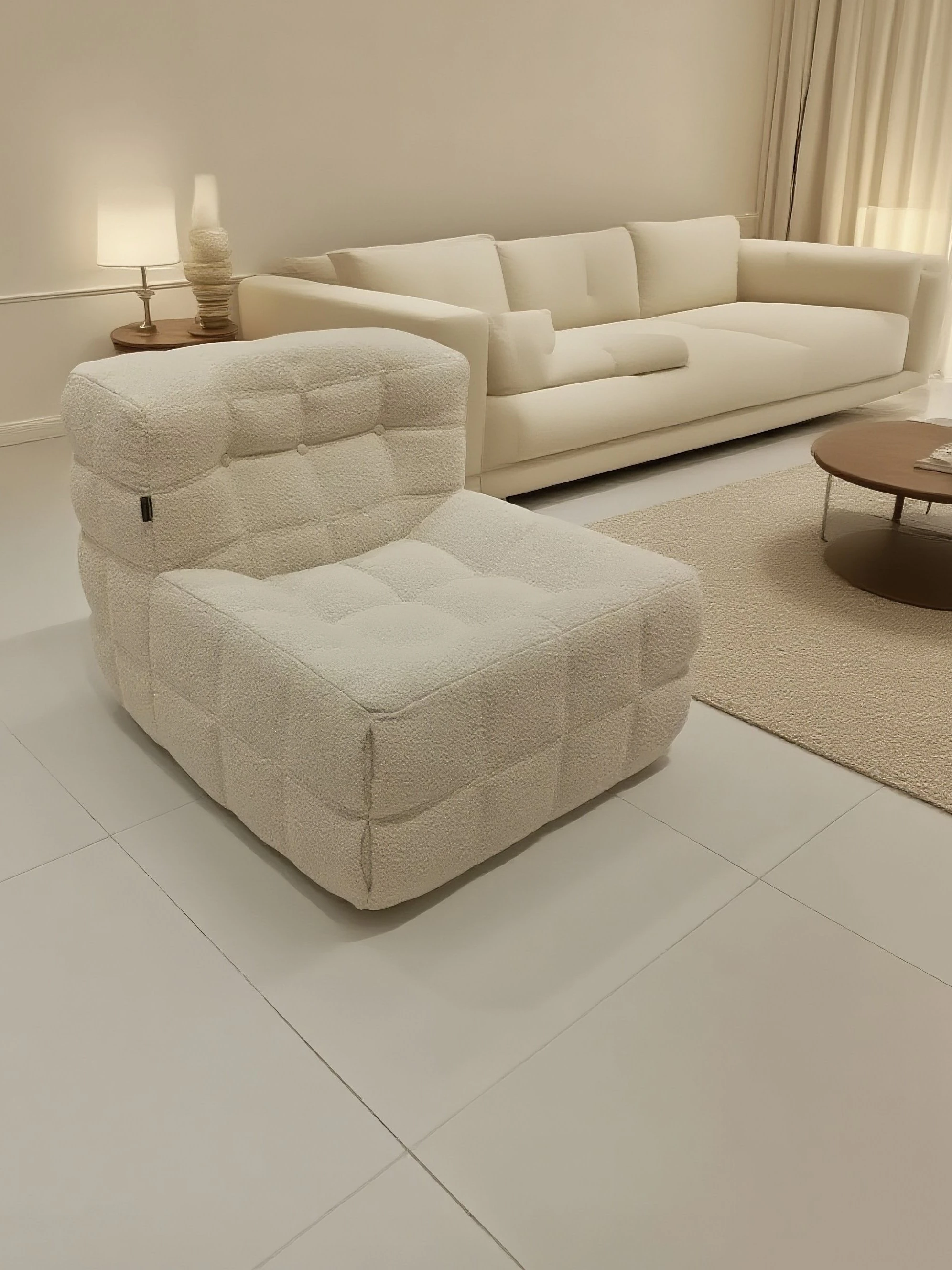 モダンでラグジュアリーな高級感あふれるリビング用1人掛けカジュアルソファ、ラムウール製のヴィンテージクリームカラー、人気デザイナーによる特別デザインです。おしゃれな空間を演出し、くつろぎのひとときを提供します。